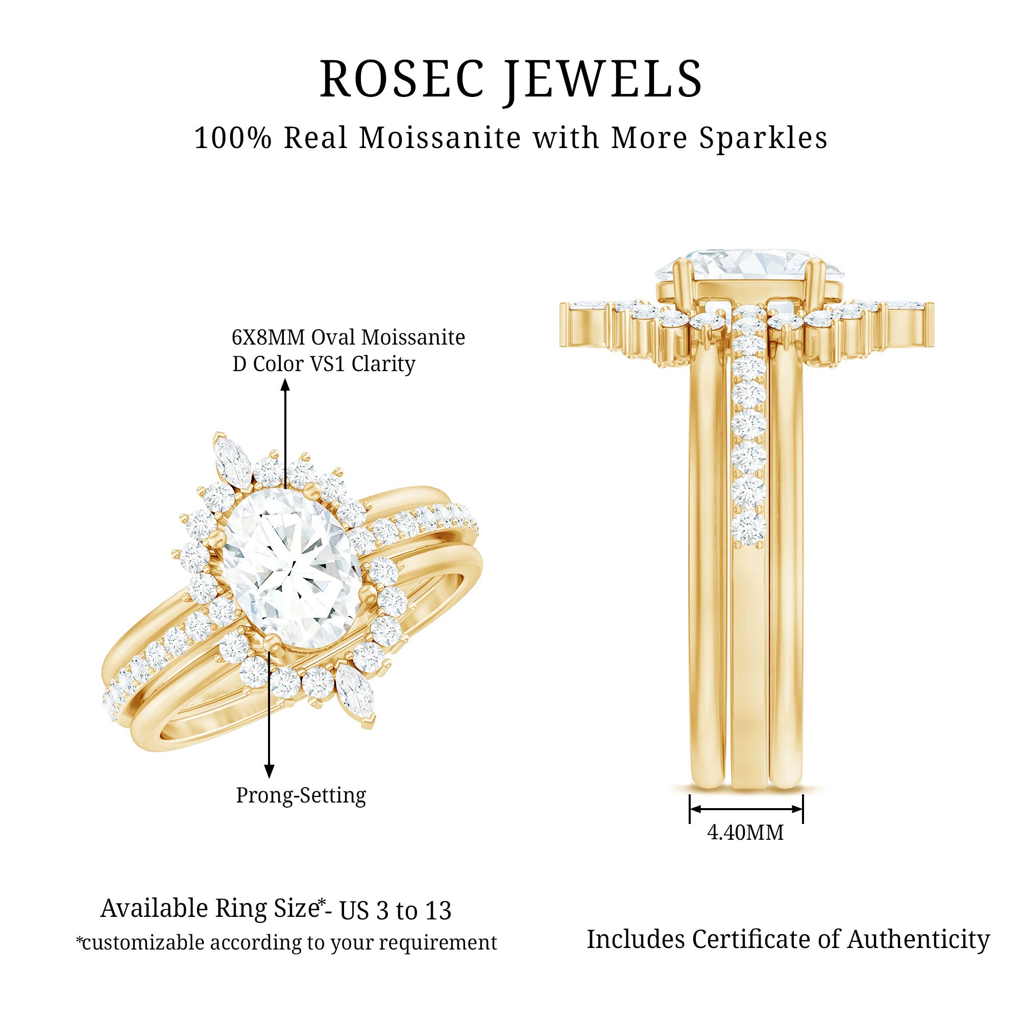 Make your special day unforgettable with this breathtaking Moissanite Bridal Ring Set, thoughtfully designed to add timeless beauty and graceful sparkle to your look. At the heart of this 3 Piece Bridal Set is a stunning 6X8 MM Oval Cut Moissanite, securely set in prongs with side stones, radiating brilliance as a captivating solitaire. Framing the center ring are two curved wedding band guards, delicately adorned with a mix of marquise and round moissanite stones. These sparkling enhancers embrace the solitaire from both sides, creating a bold yet elegant silhouette that reflects your unique style and commitment. Crafted with precision and artistry, this Stackable Bridal Set for Women blends the charm of tradition with a modern touch. The sleek, polished metal band complements the intricate stone arrangement, offering versatility, you can wear all three rings together for a striking bridal look or separate them for a more subtle, everyday style. This Engagement Ring and Wedding Band Set exudes sophistication and romantic charm. Presented in a beautiful jewelry box and available in a range of sizes, this Moissanite Wedding Ring Set promises not only sparkle and elegance but also durability and ethical beauty that will be treasured for a lifetime.