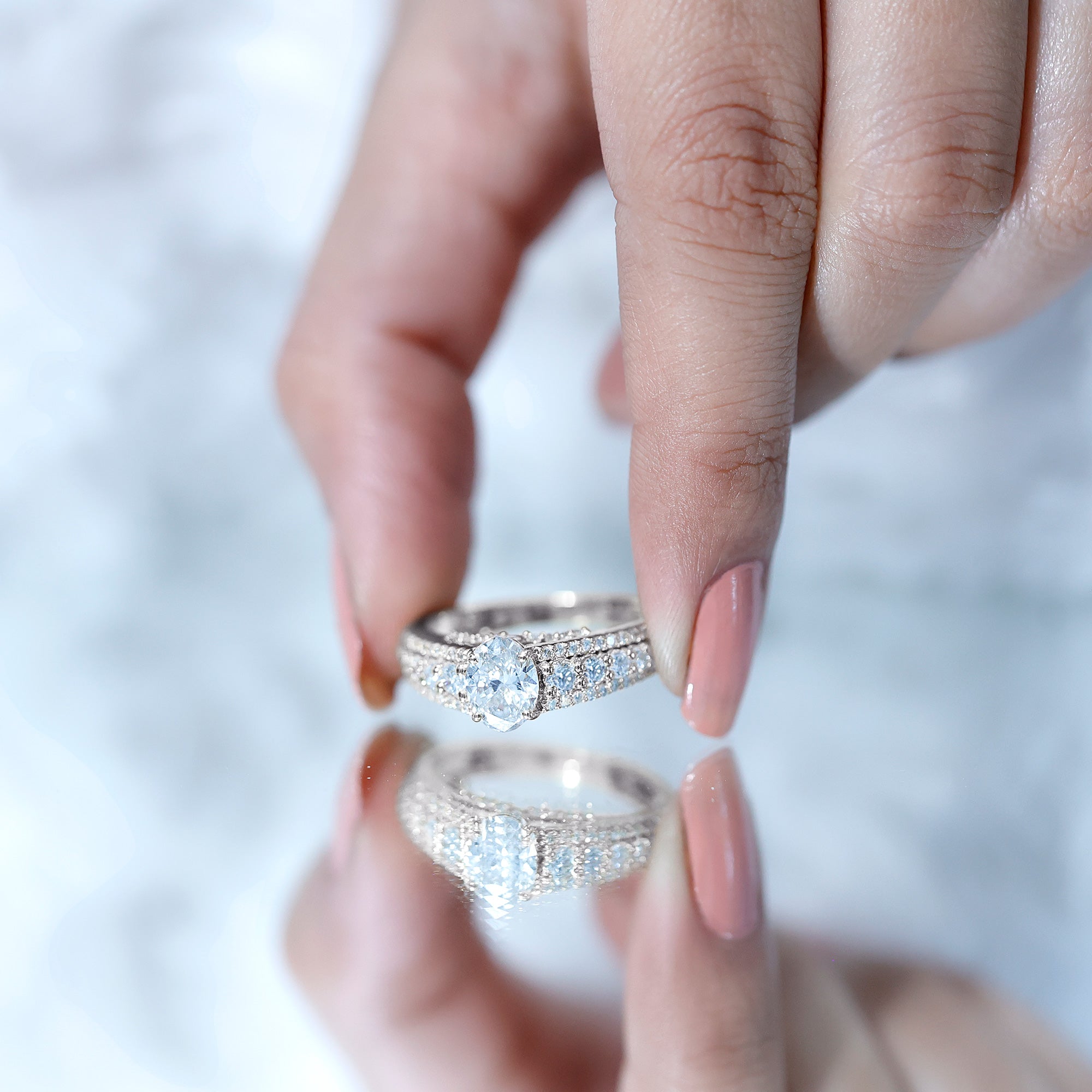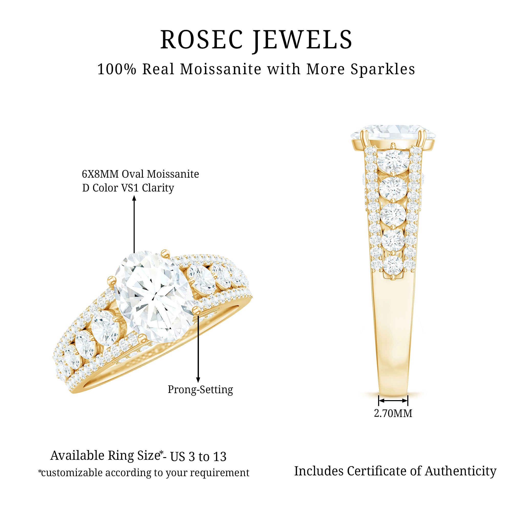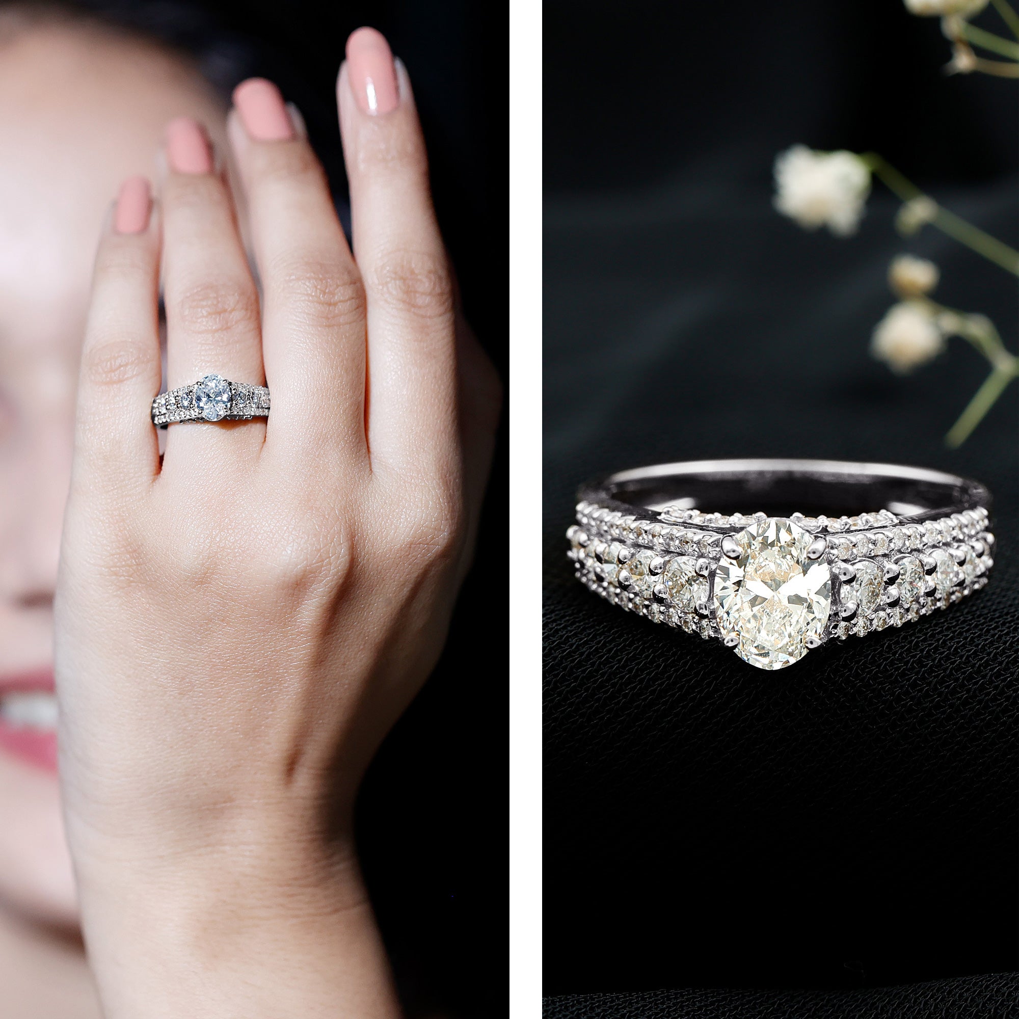 Elevate your expression of love with this elegant Oval Moissanite Engagement Ring, thoughtfully designed to blend timeless sophistication with modern brilliance. At the center rests a stunning 6X8 MM Oval Shaped Moissanite, expertly secured in safe prong setting, allowing the stone’s exceptional fire and clarity to take center stage.The Oblong Engagement Ring creates a graceful and elongated look on the finger, while the shimmering side stones add depth and radiance, enhancing the overall allure of the ring. Crafted with precision and care, each detail is a testament to superior craftsmanship and refined aesthetics.This Side Stone Engagement Ring serves as a meaningful symbol of enduring love, ideal for commemorating significant milestones such as proposals, anniversaries, or personal achievements. It shows sophisticated design and enduring sparkle, ensuring it remains a cherished piece for years to come.Presented in a beautifully crafted jewelry box, this Statement Ring is ready to mark your special moment with grace and distinction. A celebration of elegance and commitment, this ring reflects the beauty of a bond that is both rare and everlasting.