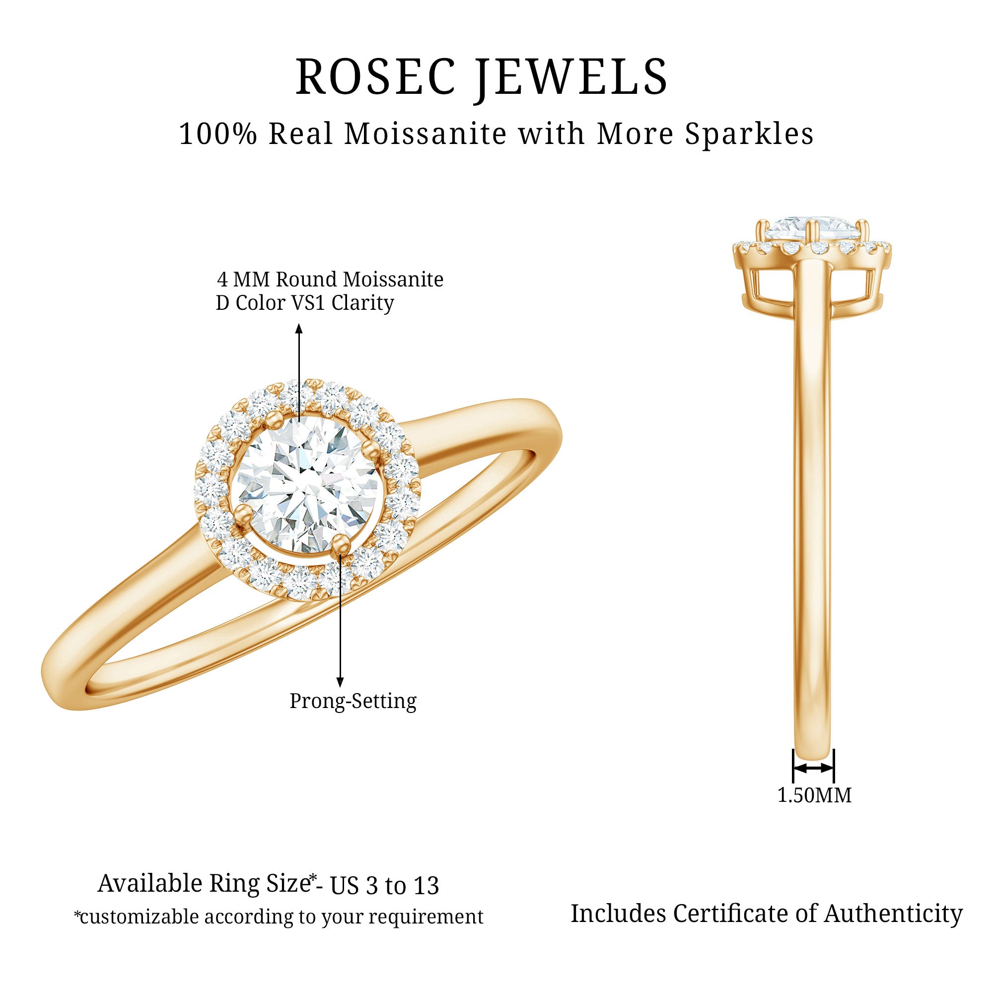Simple yet stunning, this Moissanite Promise Ring is made to shine with effortless elegance for years to come. With its timeless appeal and classic charm this ring is perfect for anyone who loves a touch of sophistication in their everyday look. Whether you are gifting it to someone special or treating yourself, it is a piece that promises to impress without trying too hard. At the center sits a 4 MM round cut moissanite securely set in prong setting, offering incredible brilliance that catches the light with every move. Surrounding it is a floating halo of round moissanite stones that add just the right amount of sparkle while giving the Minimalist Ring an elegant and iconic feel. This design not only enhances the center stone but also gives the ring a radiant and dimensional look from every angle. Crafted with attention to detail, this Moissanite Halo Ring is a powerful symbol of commitment and connection. Whether you are marking a special moment or simply expressing your love, this Simple Promise Ring for Women speaks of forever in the most beautiful way. Designed for comfort and everyday elegance, this ring is easy to wear yet impossible to ignore.
