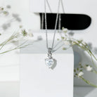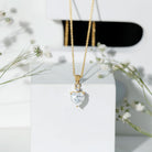 For those who appreciate minimalistic jewelry, this pendant necklace is a must-have addition to your collection. Its understated yet elegant design features a heart-shaped moissanite, delicately enhanced with a petite round-shaped moissanite. Both stones are securely held in place with a prong setting, creating a beautiful shimmer and shine.