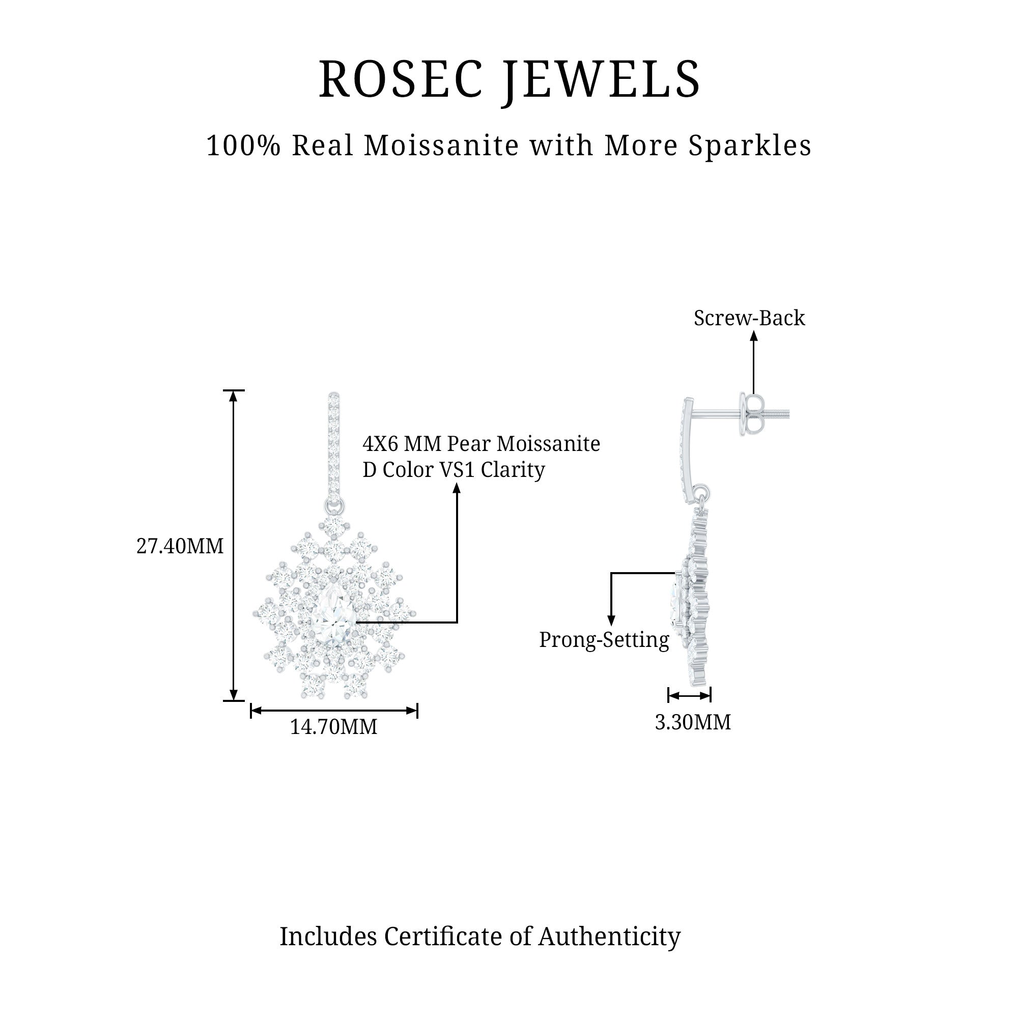 Complete your look for D-Day with these Moissanite Earrings, precisely handcrafted with 14K White Gold Plated Silver. These earrings feature a 4X6 MM Pear Shape secured in Prong Setting and decorated with petite stones that embrace the beauty of the earrings. The striking shine of D-VS1 Quality Moissanite makes it perfect to pair with the wedding jewelry set. These Drop Earrings dangle with a stone studded metallic bar, which makes it a perfect statement piece.