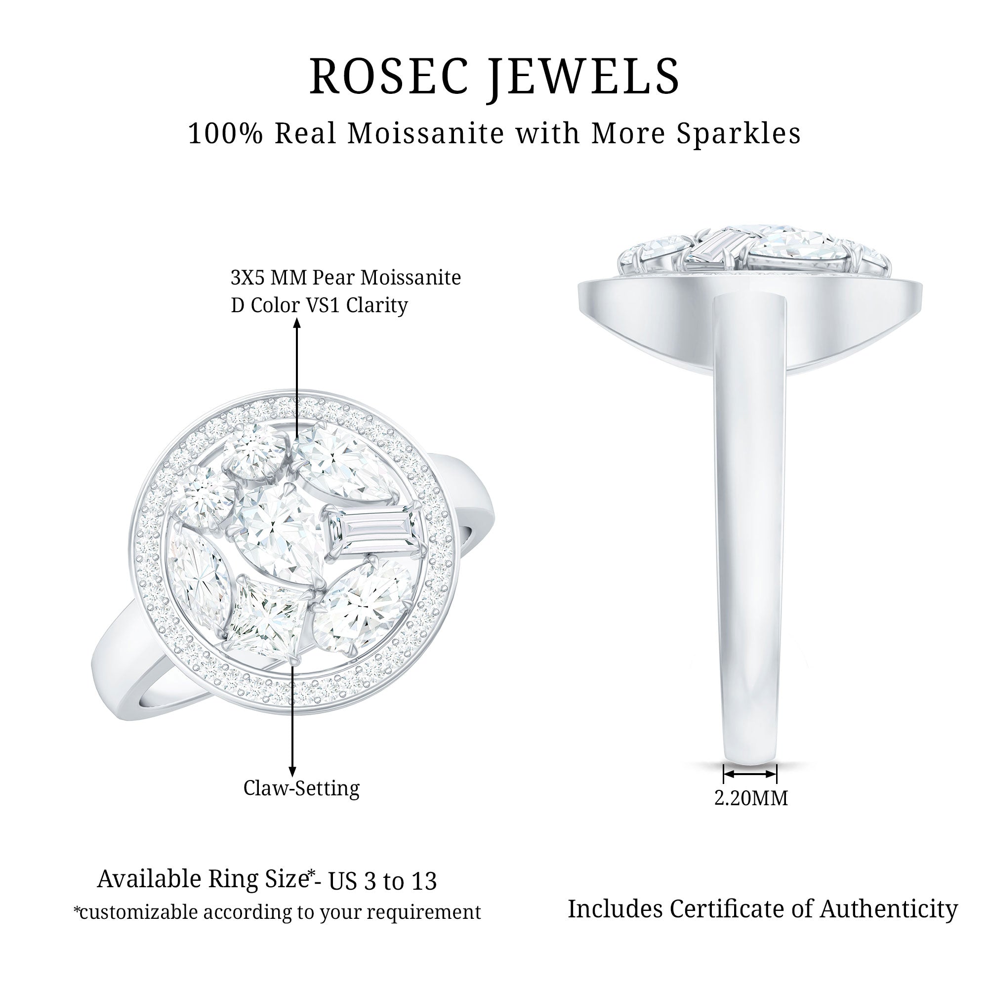 Our Cocktail Engagement Ring is a true masterpiece, designed to turn heads and steal hearts. Curated in 14K White Gold Plated Silver, the design showcases a unique cluster of shimmering moissanite stones in a variety of shapes. At the center, you will find an eye-catching arrangement of baguette, marquise, oval, round, and princess cut moissanite stones, forming a luxurious cluster that sparkles from every angle, each stone is set in secure claw setting. Surrounding the center cluster is a delicate round moissanite halo, enhancing the radiance and adding an extra layer of elegance. This Moissanite Statement Ring is ideal for cocktail parties, formal occasions, or even as a standout engagement ring.