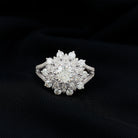 A truly timeless piece of fine jewelry, this Moissanite Engagement Ring beholds an enchanting appeal. This ring is embellished with round moissanites held in a unique design creating a big flower. It is a floral inspired engagement ring, that brings to life moments of great celebration. The heart of Statement Ring is adorned with the 6 MM Round Shape Moissanite surrounded by petite gemstone studded on petals. The split shank of the ring is adorned with petite moissanite which enhances the beauty of the ring. This Floral Engagement Ring beholds the shine of D-VS1 Quality Moissanites which makes the ring a perfect dazzler for the celebration.