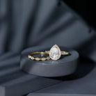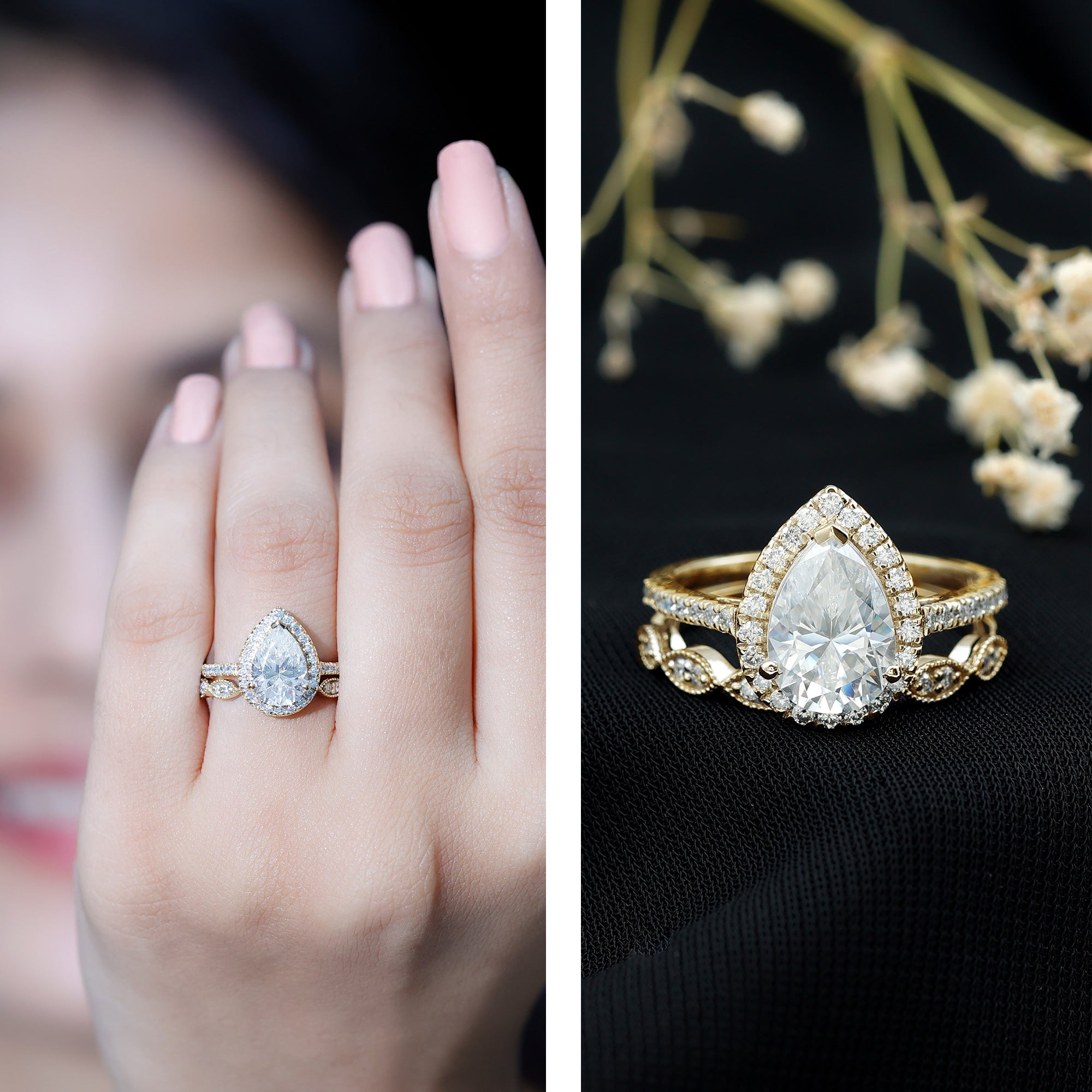 Youll take her breath away when you present this amazing Engagement Ring Set showcasing Pear Cut Moissanite as the center stone secured by Claw Setting, and additional Round Moissanite. While Round Moissanite studded on the shank. Make your partners day truly unforgettable by giving her the fascinating Colorless Moissanite Ring Set.