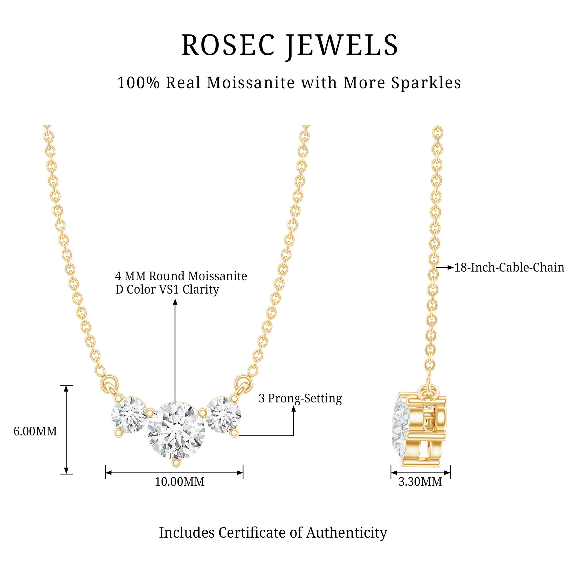 Simple, elegant, and full of meaning, this Three Stone Necklace is a beautiful way to express lasting love. The design features three sparkling round cut Moissanite stones, each carefully set in secure 3-prong setting to highlight their brilliance. The delicate layout makes this Moissanite Necklace easy to wear while still catching the light with every movement. The three stones symbolize the past, present, and future, making this Moissanite Stone Necklace a thoughtful choice for anniversaries and meaningful milestones. The D-VS1 quality Moissanites offer exceptional sparkle and clarity, giving the look of fine diamonds while remaining durable and perfect for everyday wear. Attached to a chain, the Minimalist Necklace sits gracefully on the neckline and feels lightweight and comfortable throughout the day. This versatile piece is ideal for layering with other necklaces or wearing alone for a refined look. A meaningful gift for a mother, wife, girlfriend, daughter, or any special woman in your life, this necklace arrives as a timeless symbol of love, connection, and cherished memories.