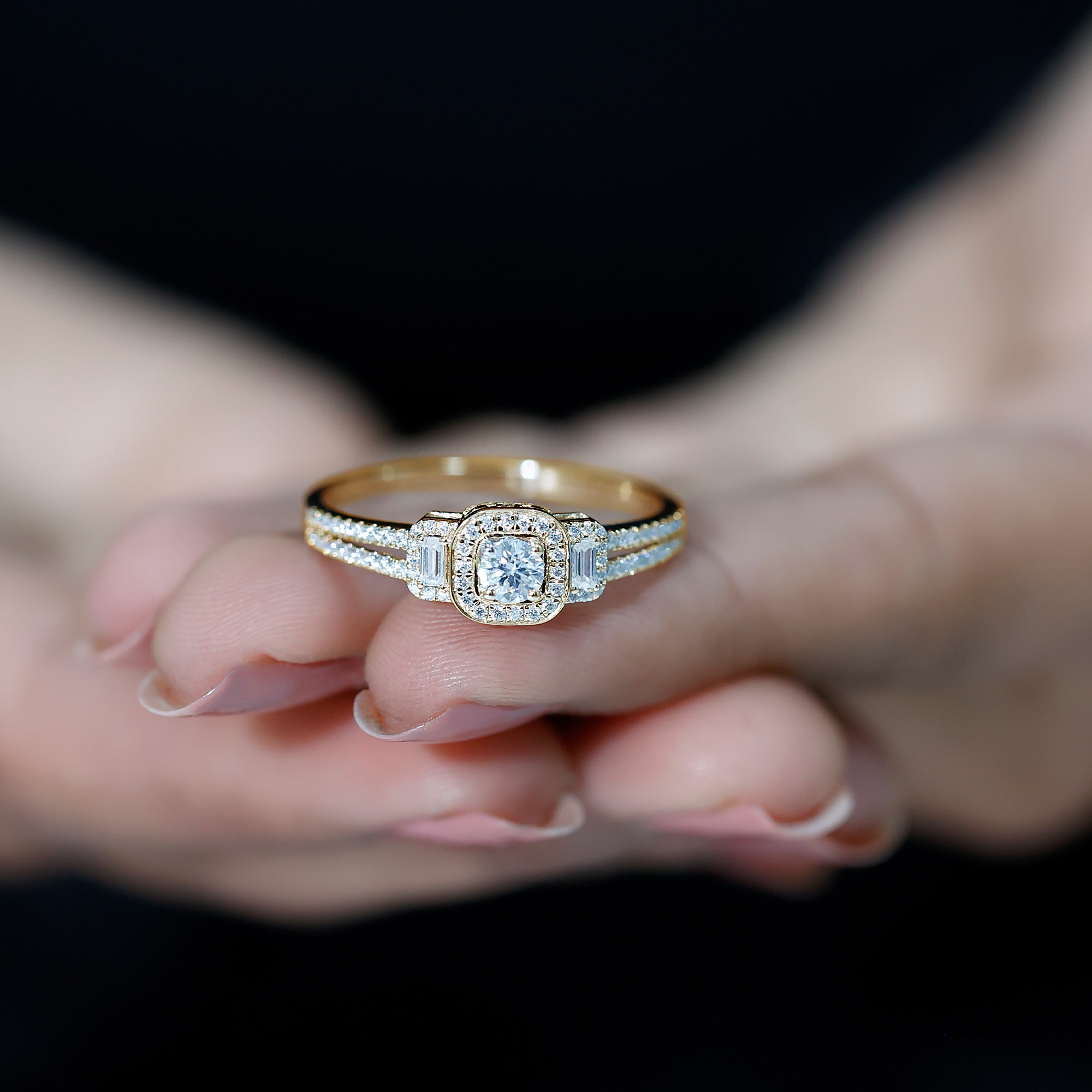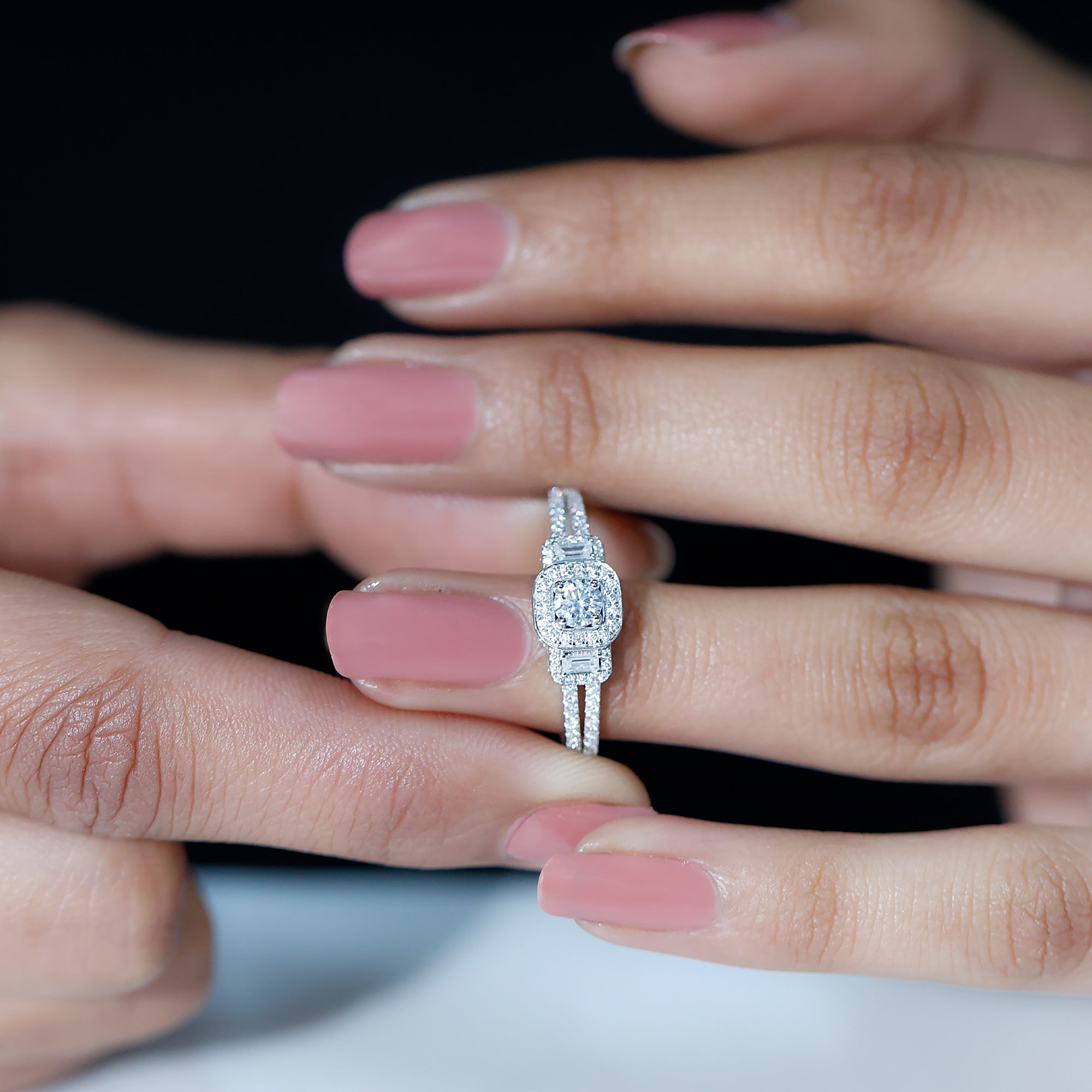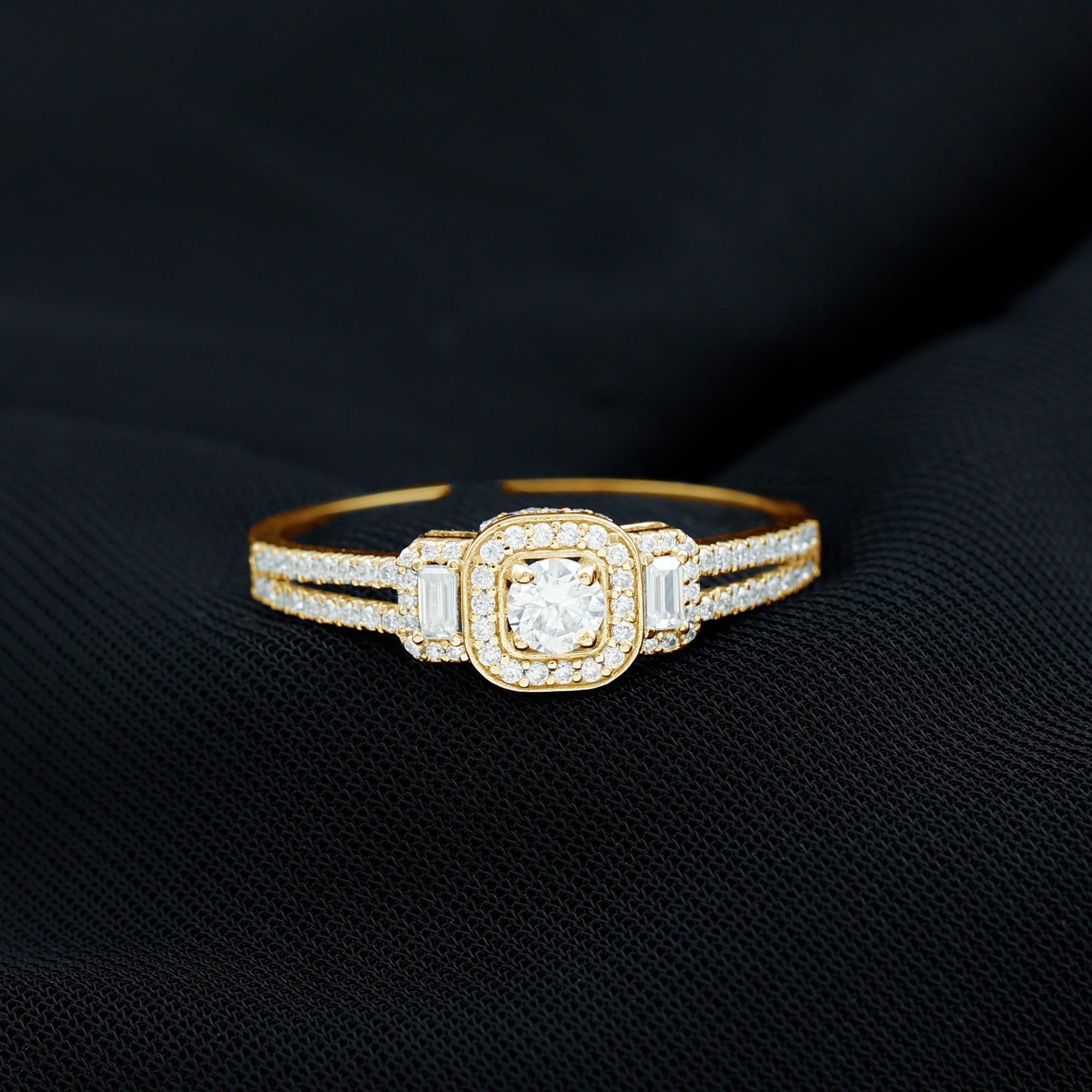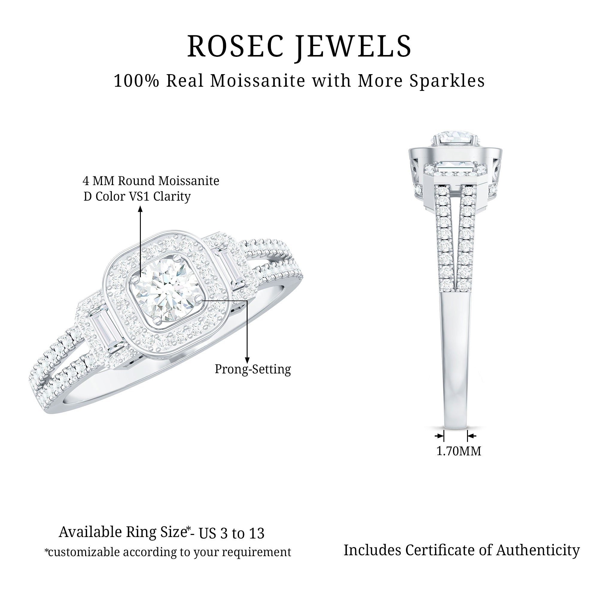 Surprise your lady with this stunning Moissanite Vintage Ring that features intricate details with a mesmerizing design. The ring features a 4 MM Moissanite securely placed at the center of the ring in Prong Setting. The center stone is encircled by a Halo of petite moissanites and Baguette Shape Moissanites are set on both the sides of center stone which embraces the look of the ring. The split shank of this Halo Moissanite Ring is embedded with the smaller Moissanites which gives a luxury look to the ring. This Split Shank Ring beholds the shine of D-VS1 quality Moissanites which makes it perfect to present on the special day.