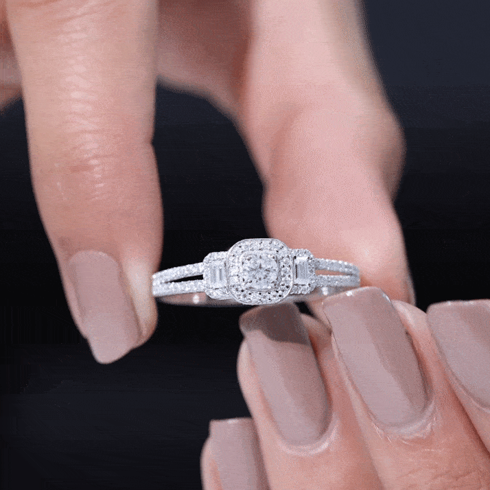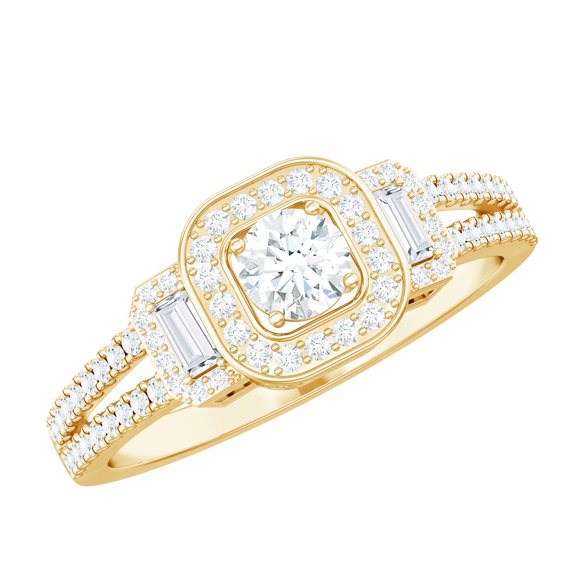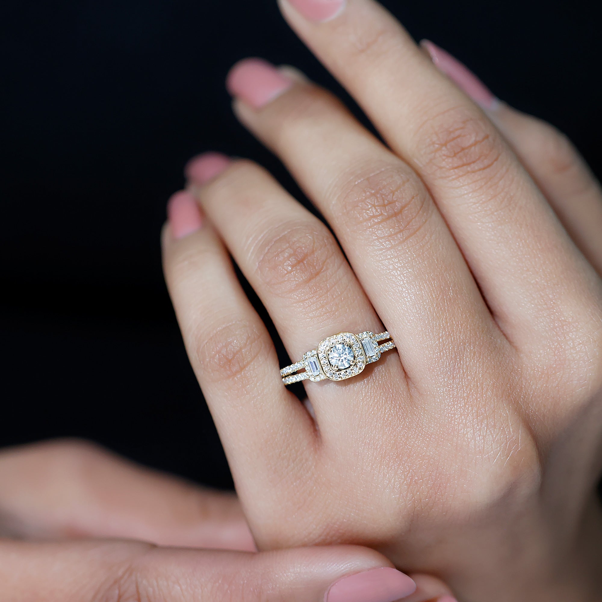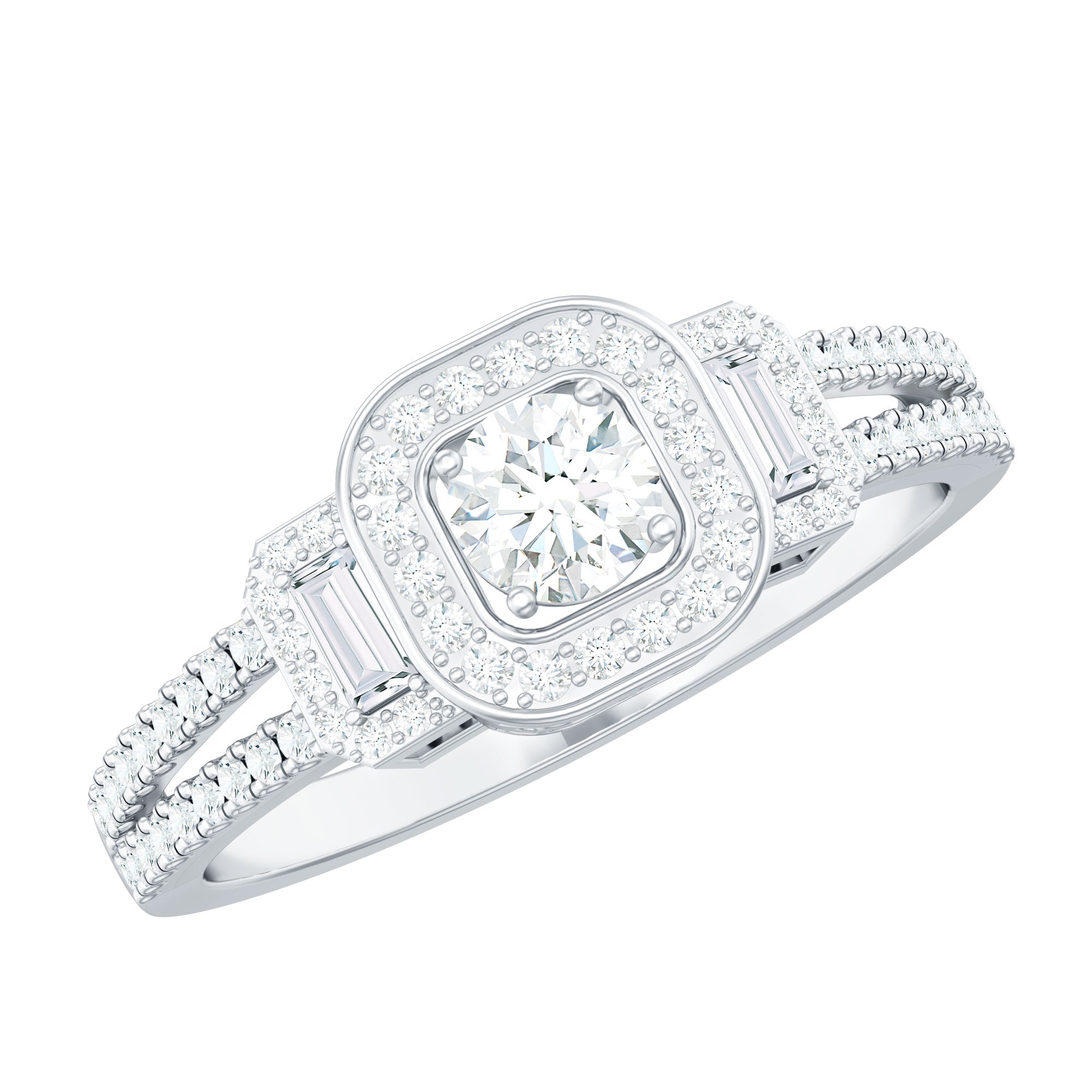 Surprise your lady with this stunning Moissanite Vintage Ring that features intricate details with a mesmerizing design. The ring features a 4 MM Moissanite securely placed at the center of the ring in Prong Setting. The center stone is encircled by a Halo of petite moissanites and Baguette Shape Moissanites are set on both the sides of center stone which embraces the look of the ring. The split shank of this Halo Moissanite Ring is embedded with the smaller Moissanites which gives a luxury look to the ring. This Split Shank Ring beholds the shine of D-VS1 quality Moissanites which makes it perfect to present on the special day.