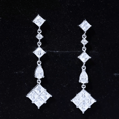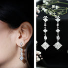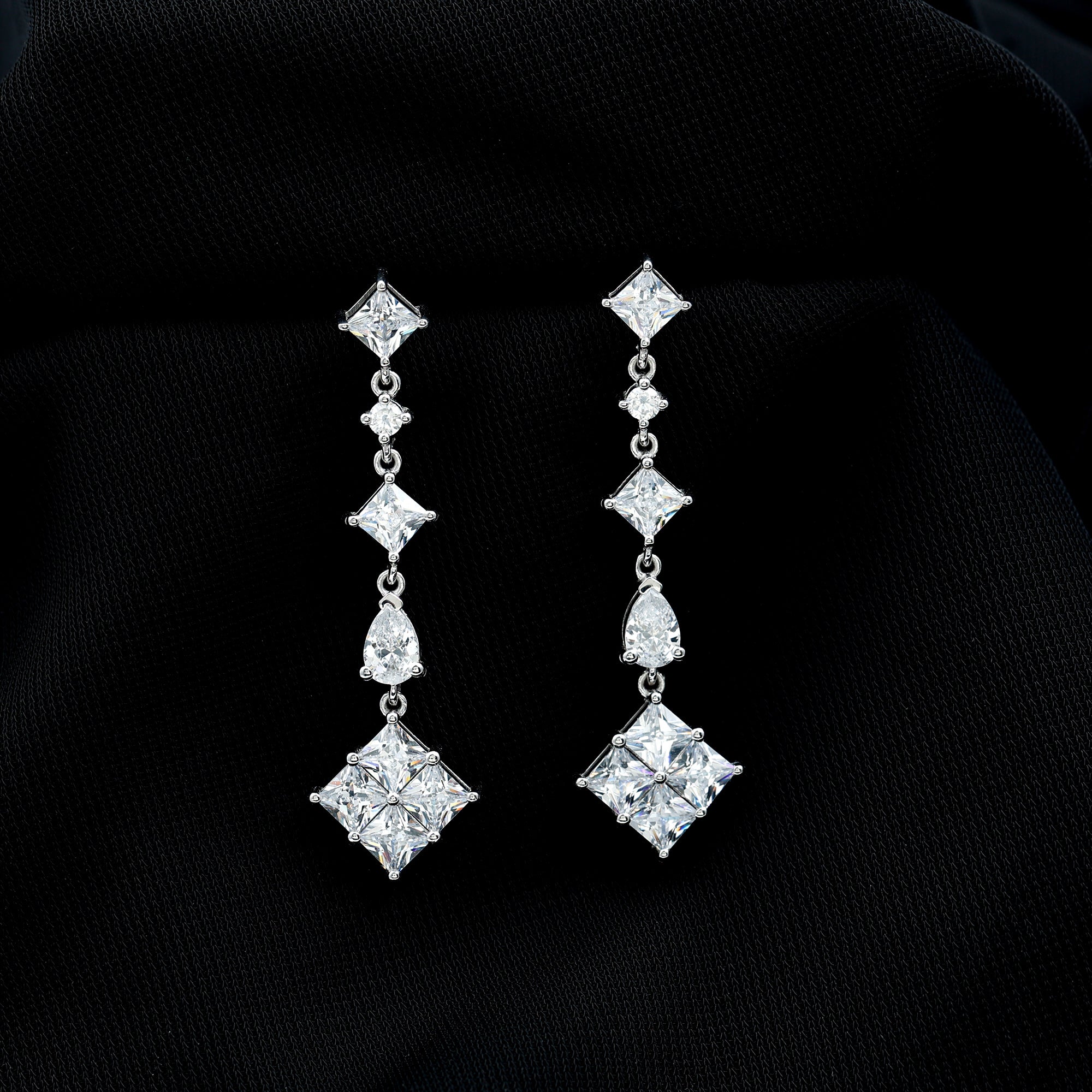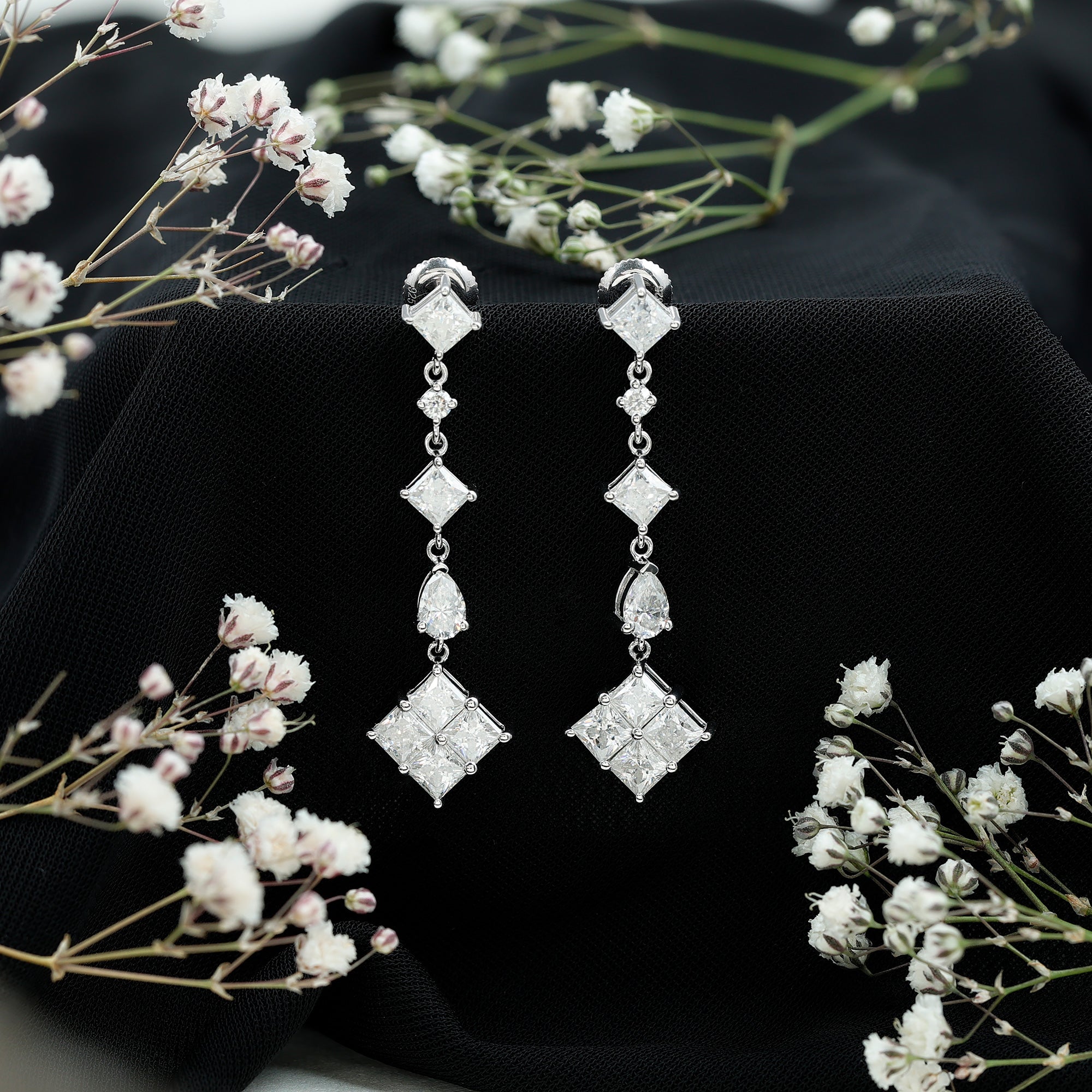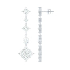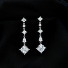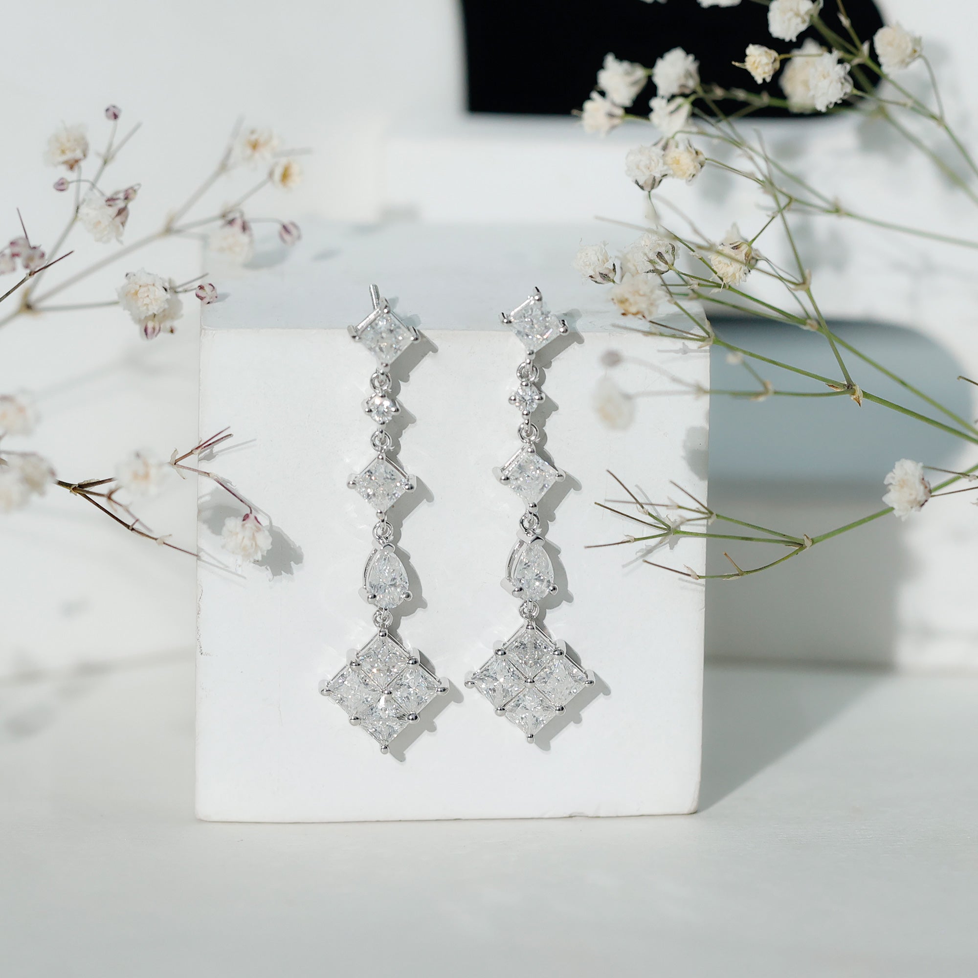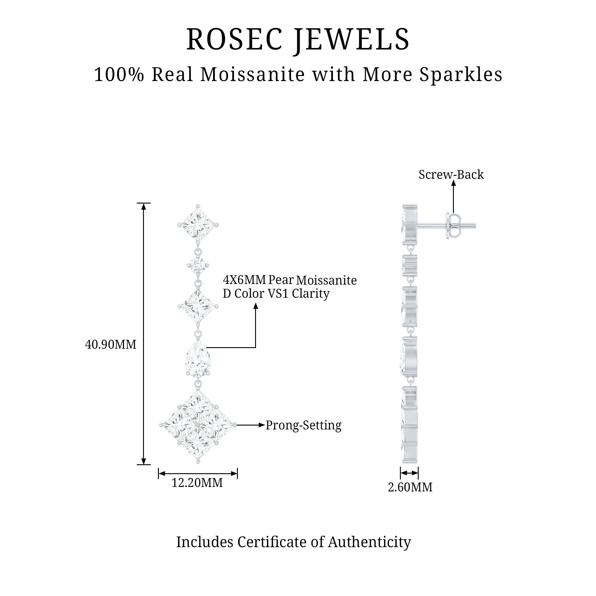 Complete your wedding look with these Moissanite Drop Earrings. It features a cluster of Princess Cut Moissanite at the bottom of the earrings, which are linked with round and pear shape Moissanite secured in Prong Setting embedded in 14K White Gold Plated Silver. These Dangle Earrings hold the classic shine of D-VS1 Quality Moissanite, making it perfect for the D-Day. The inner radiance of the Moissanite will not only embrace your look but will also boost your confidence for the big day. The Chain Earrings with Screw on Backs will stay on place throughout the day. These Wedding Earrings will be delivered to you in a velvet pouch with a certificate of authenticity to ensure safe storage and high quality of the product.