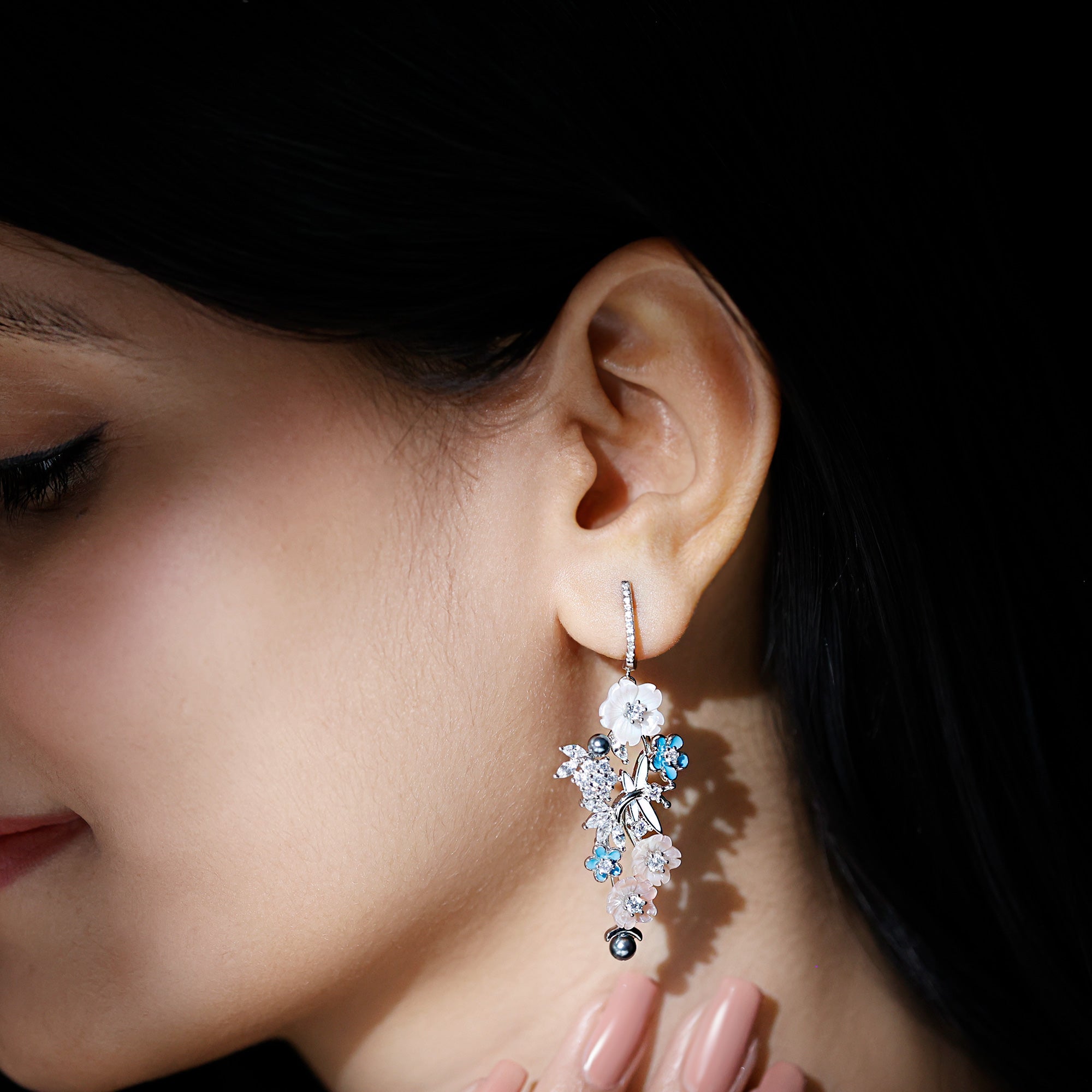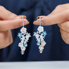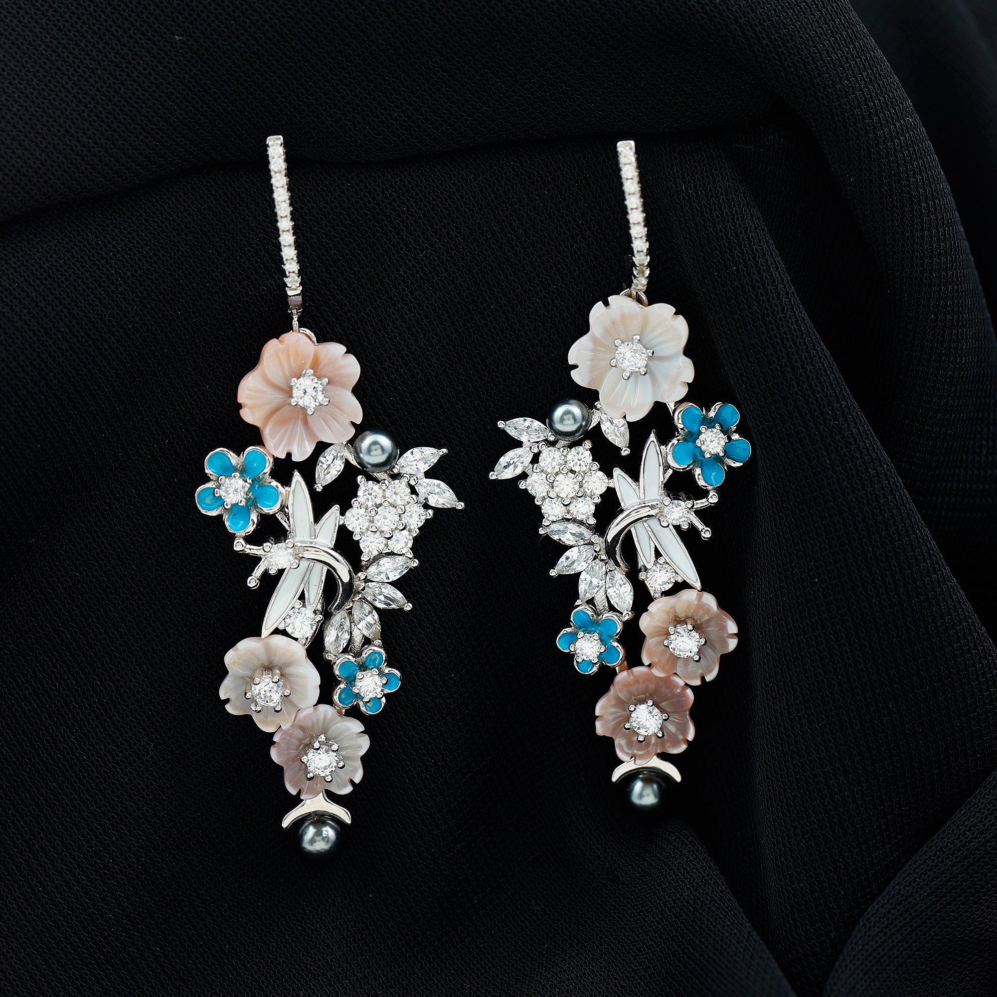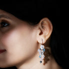Bring natures magic to life with these beautiful nature inspired Floral Dangle Earrings, beautifully handcrafted in 14k White Gold Plated Silver. Every detail in this exquisite pair is thoughtfully designed to reflect the beauty of a blooming garden, making them a standout accessory for your most special occasion. At the top, a gentle bar studded with sparkling simulated diamonds gracefully hugs the ear and connects to a cascading design of multi gemstone elements, including Mother of Pearl, Tahitian Pearls, Blue Enamel, and Cubic Zirconia Stones. The Statement Earrings feature lovely flower and butterfly motifs, adding a whimsical and dreamy touch to the design. The Colorful Flower Earrings are secured with screw back closures, ensuring they stay in place comfortably, even through long celebrations. Perfect for weddings, receptions, festive functions, cocktail parties, or special dinners, these Flower Bridal Earrings beautifully elevate your every look. Elegant, artistic, and full of charm - these Multi Colored Dangling Earrings are more than just jewelry; they are a celebration of beauty and nature in one unforgettable design.