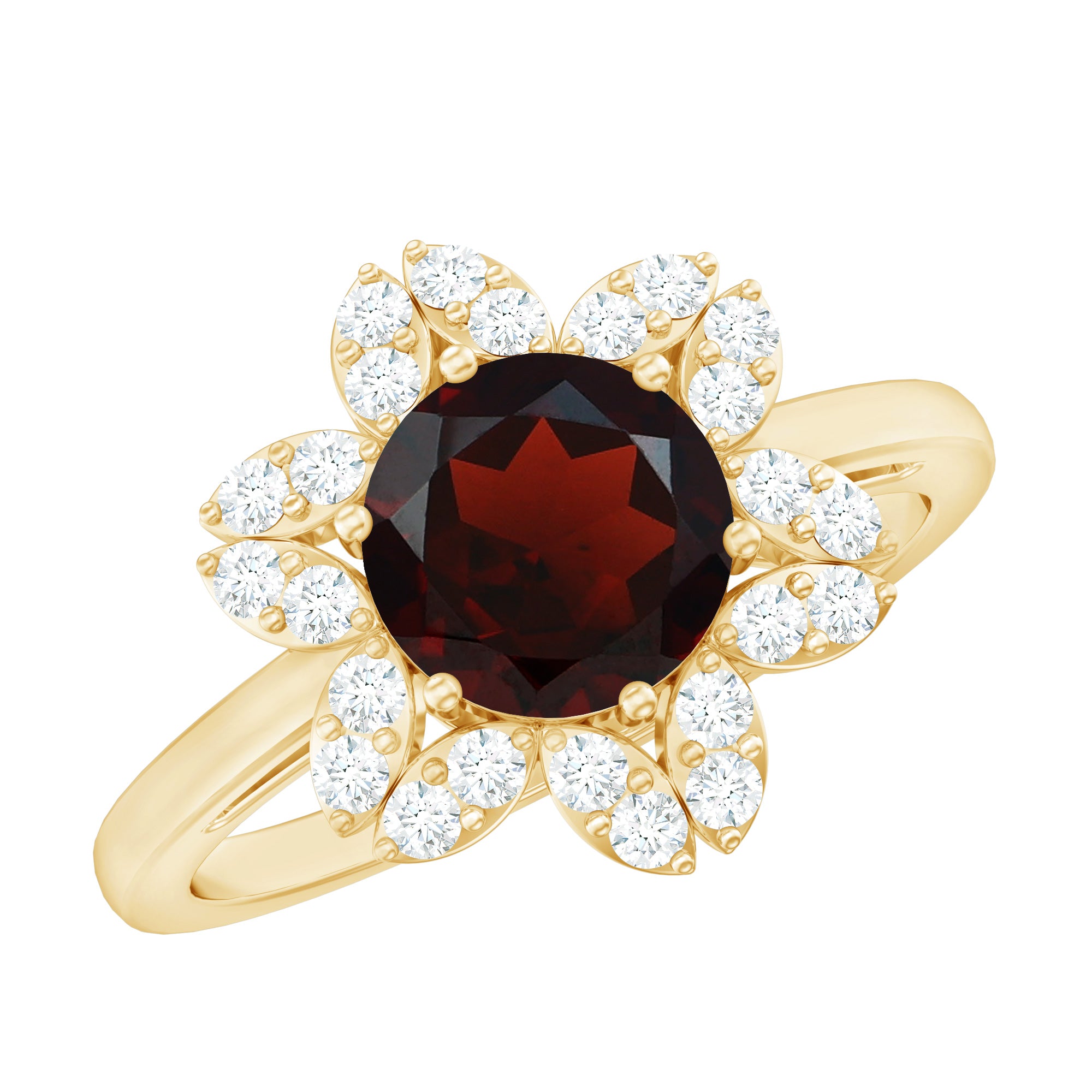 Capture the magic of love with this Flower Engagement Ring, a breathtaking design that radiates romance from every angle. At the center of this enchanting piece is an 8 mm Round Shape Garnet set in 6 Prong Setting, its deep red color symbolizing passion, devotion and a love that feels beautifully timeless. Surrounding the center stone are delicately crafted flower petals, each adorned with sparkling Diamond stones that add a radiant glow and bring the entire bloom to life. The combination of warm AAA Quality Garnet and shimmering HI-SI Grade Diamond stones creates a stunning harmony, making this Garnet Engagement Ring feel like a poetic expression of emotion. Thoughtfully designed and available in various ring sizes, this Garnet Diamond Ring offers a comfortable fit meant to be cherished every day. Ideal for anyone who adores floral details and romantic elegance, this Garnet Diamond Engagement Ring is a symbol of blossoming love and a treasured reminder that the most beautiful moments in life are the ones shared with someone special.