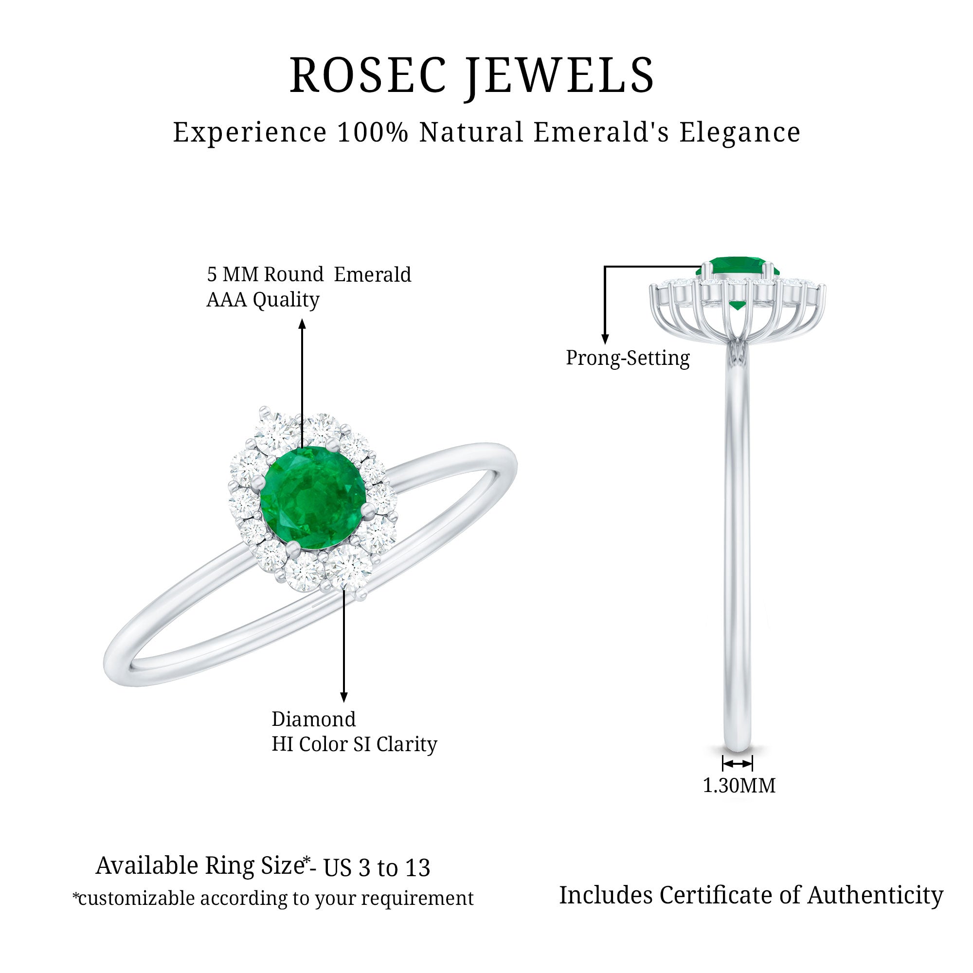 Embrace the glow of everlasting love with this mesmerizing Emerald Promise Ring, a true reflection of elegance and emotion. The centerpiece features a 5 mm Round Shape Emerald gemstone, radiating lush green hues that symbolize renewal, devotion and a love that only deepens with time. Surrounding it, a delicate Halo of glittering Diamond stones adds a touch of ethereal sparkle, illuminating the natural beauty of the Emerald with every flicker of light. The refined design strikes the perfect balance between timeless charm and modern grace, making this Emerald Diamond Ring an unforgettable token of your most cherished promise. Perfect for expressing heartfelt devotion or celebrating a special moment, this Emerald Proposal Ring captures the very essence of romance. Presented in a signature jewelry box and available in a range of sizes, this Commitment Ring for her is a symbol of connection, a treasure of emotion and a sparkling promise of forever.