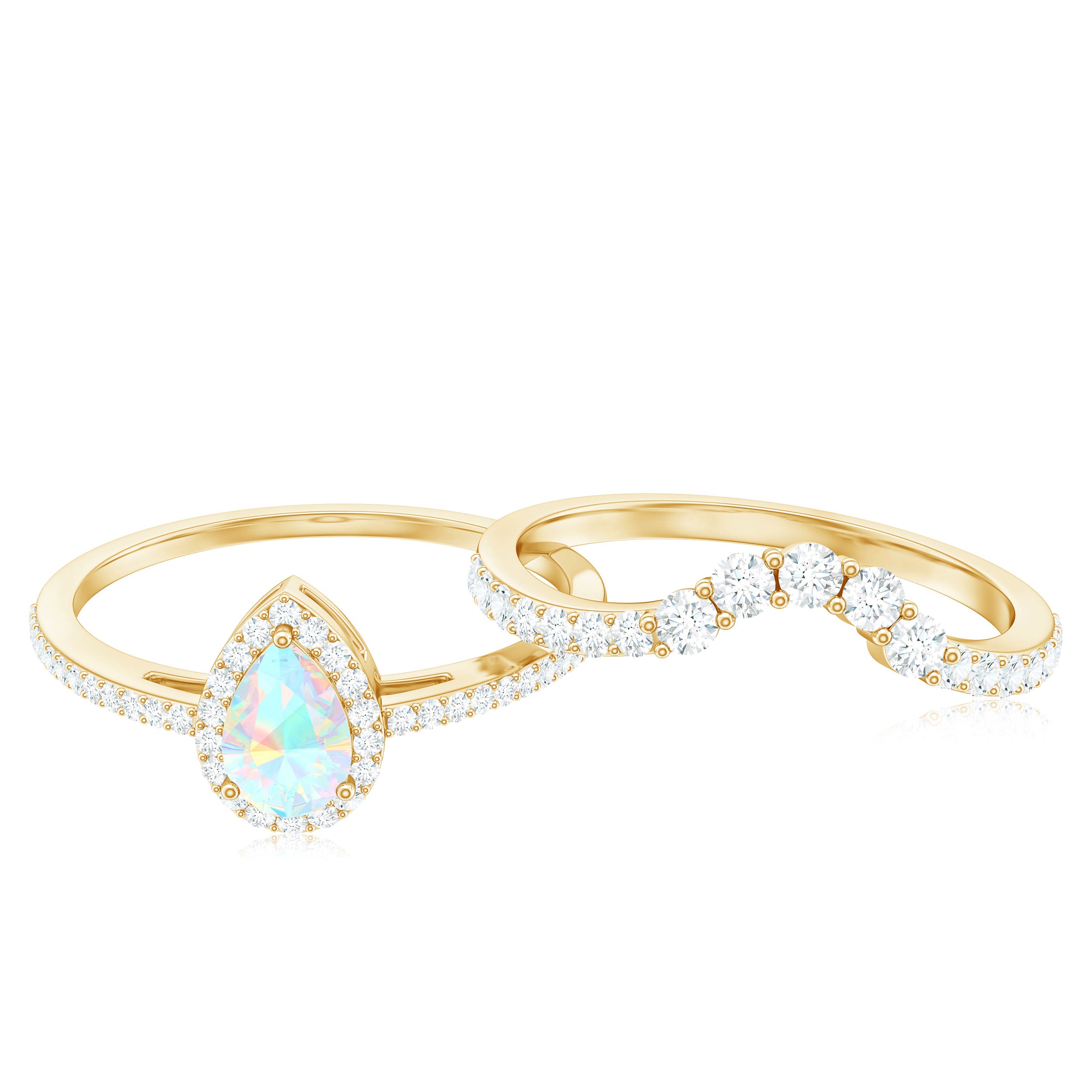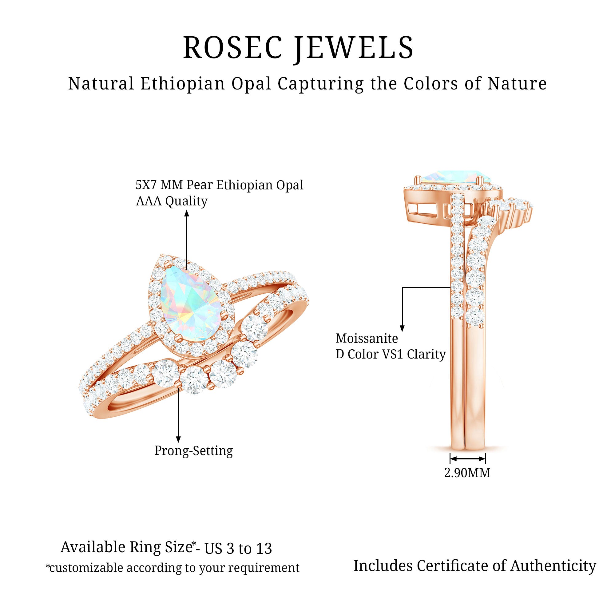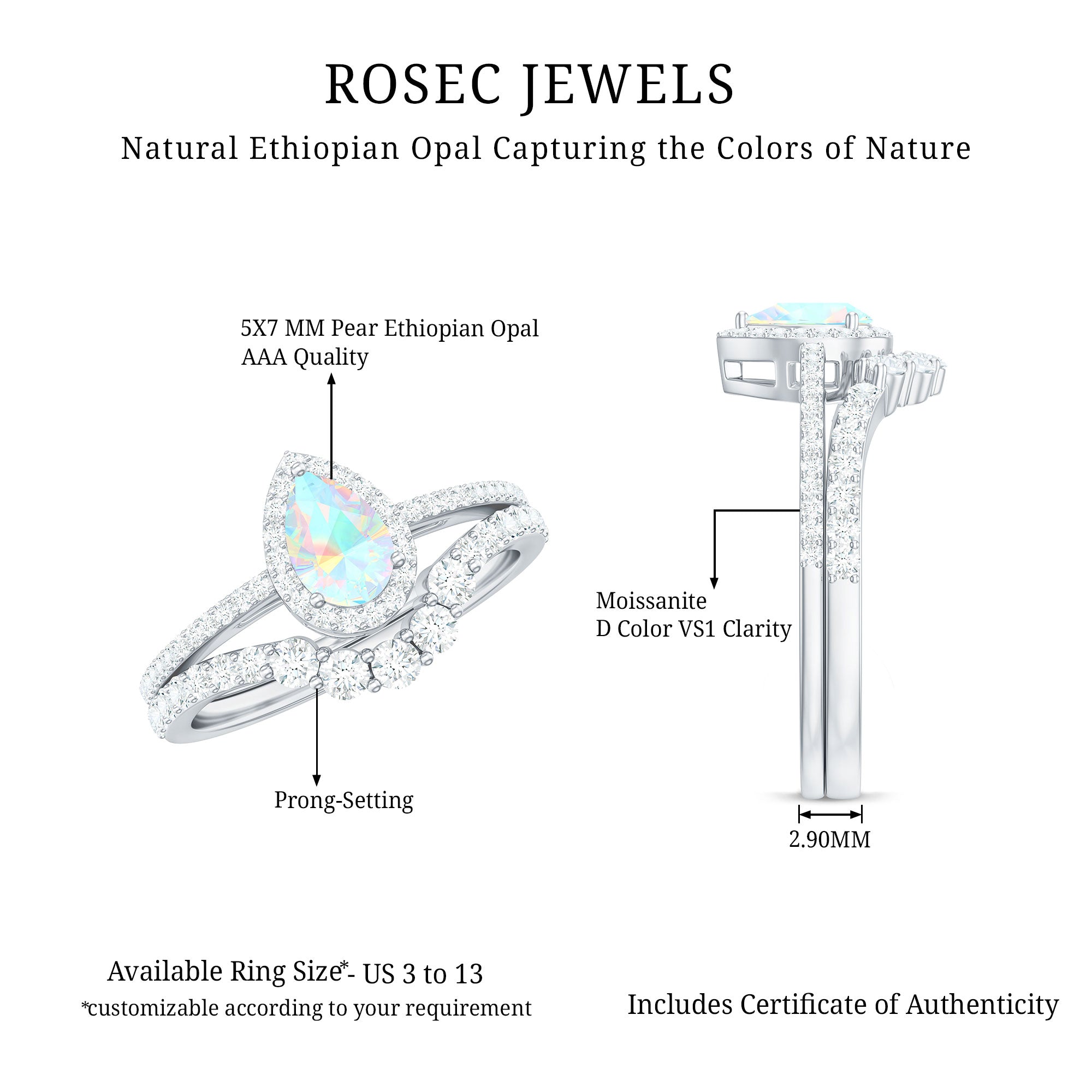 Let your love story shine with the luminous beauty of this Wedding Engagement Ring Set, a masterpiece designed for the bride-to-be who adores a touch of magic. The Teardrop Engagement Ring features a captivating 5X7 mm Pear Shape Ethiopian Opal at its center, known for its rainbow hues that shift with every movement. Wrapped in a shimmering Halo of Moissanite and accented by Moissanite Side Stones along the band, it is a piece that radiates charm and elegance. Paired seamlessly with a delicately Curved Wedding Band adorned with Round Moissanite stones, this Opal Wedding Ring Set creates a graceful and layered look that is both modern and timeless. Whether you are saying yes or celebrating a lifelong bond, this Opal Engagement Ring with Wedding Band is crafted to symbolize love. Available in a range of sizes and delivered in a signature jewelry box, this Opal Bridal Ring Set is the perfect ready-to-gift treasure for a proposal, anniversary or unforgettable moment. For the bride who wants something meaningful and refreshingly unique, this Engagement and Wedding Ring Set is love, perfectly captured in color and sparkle.