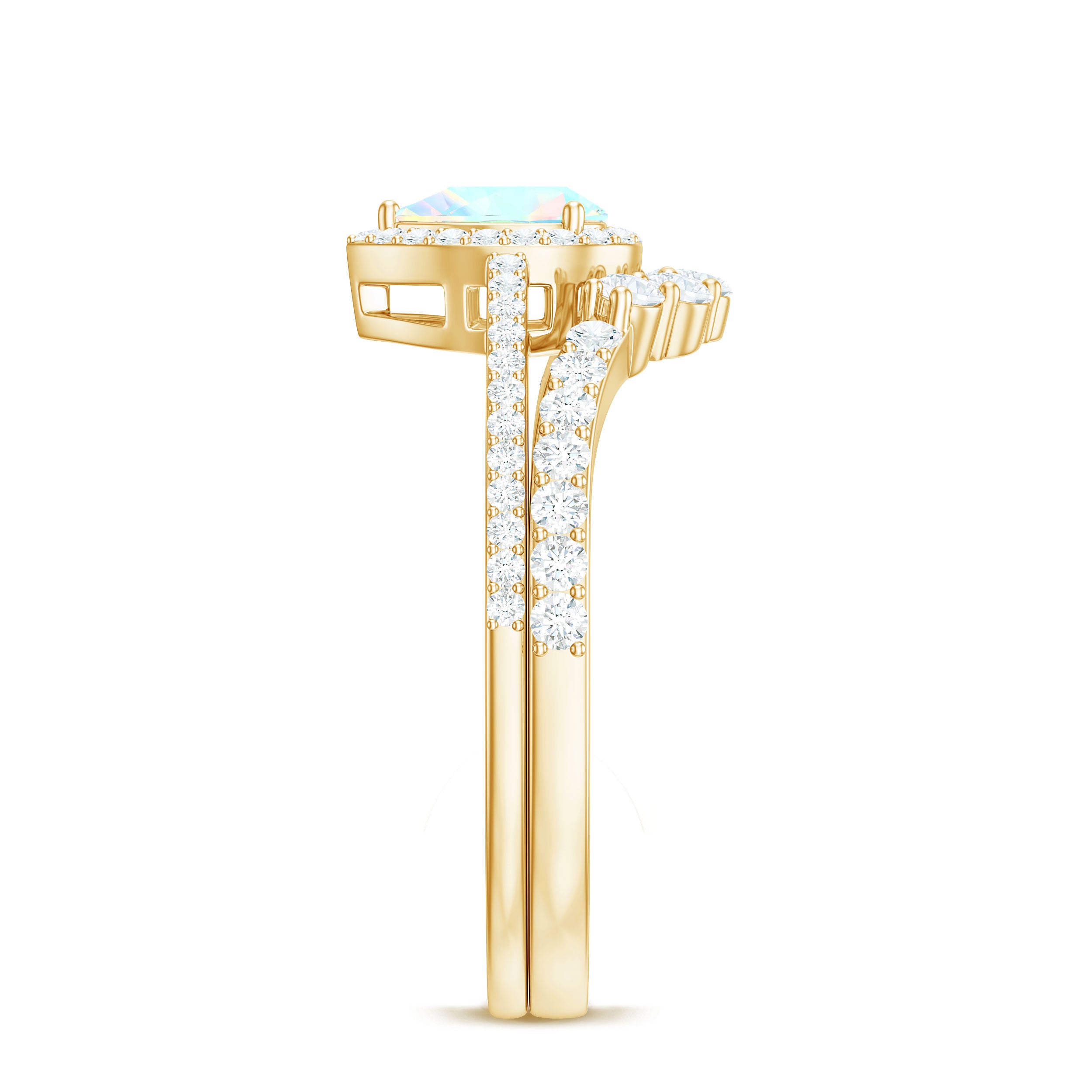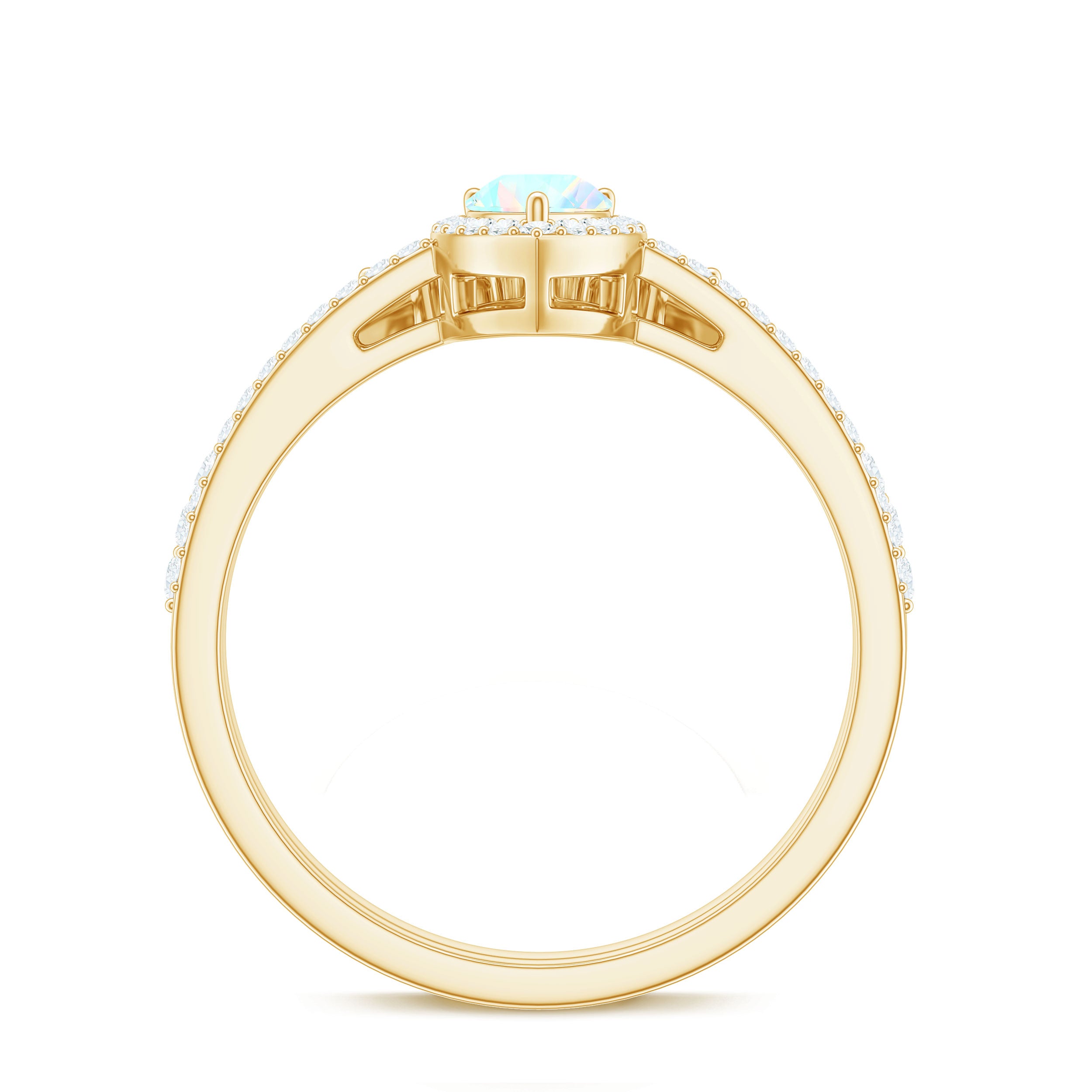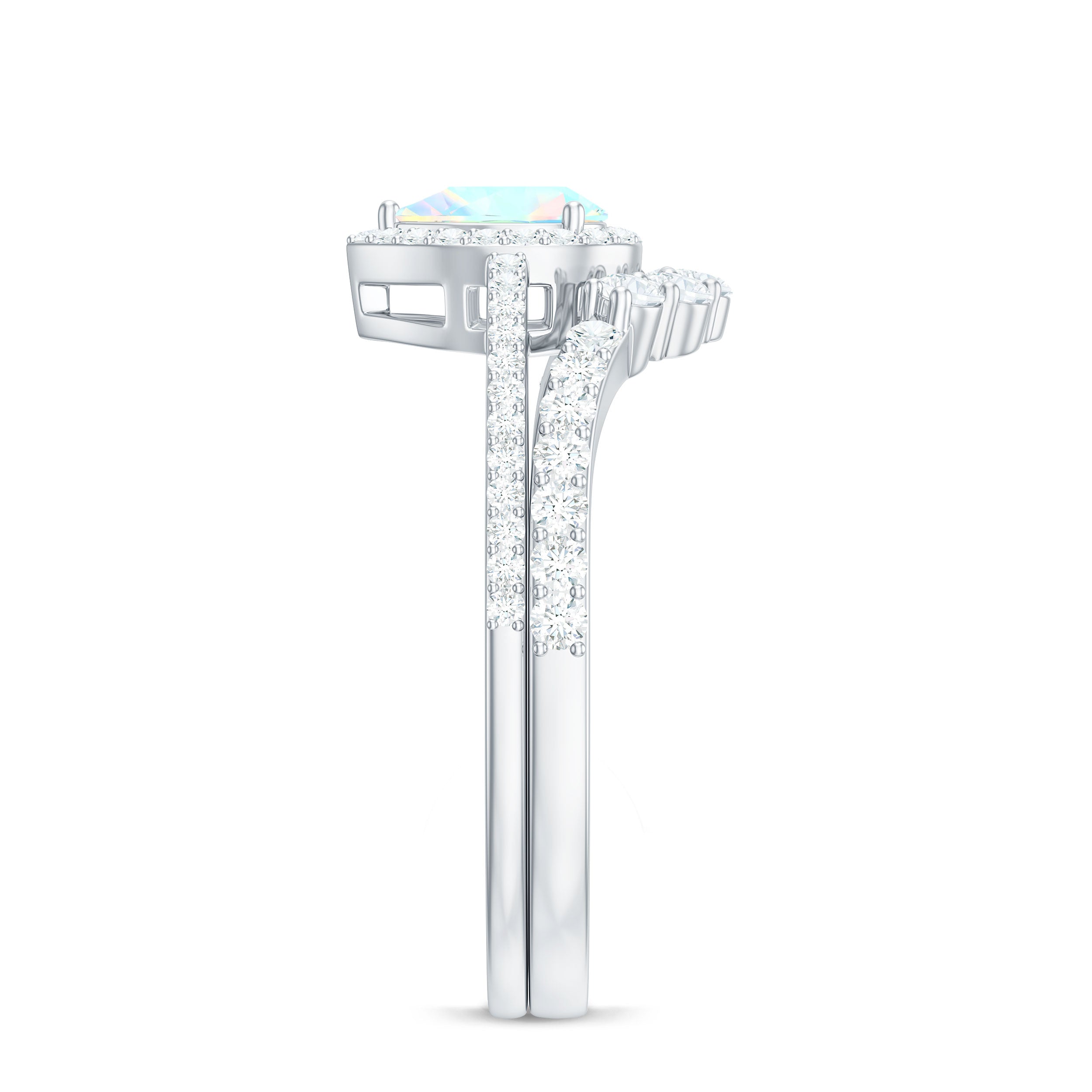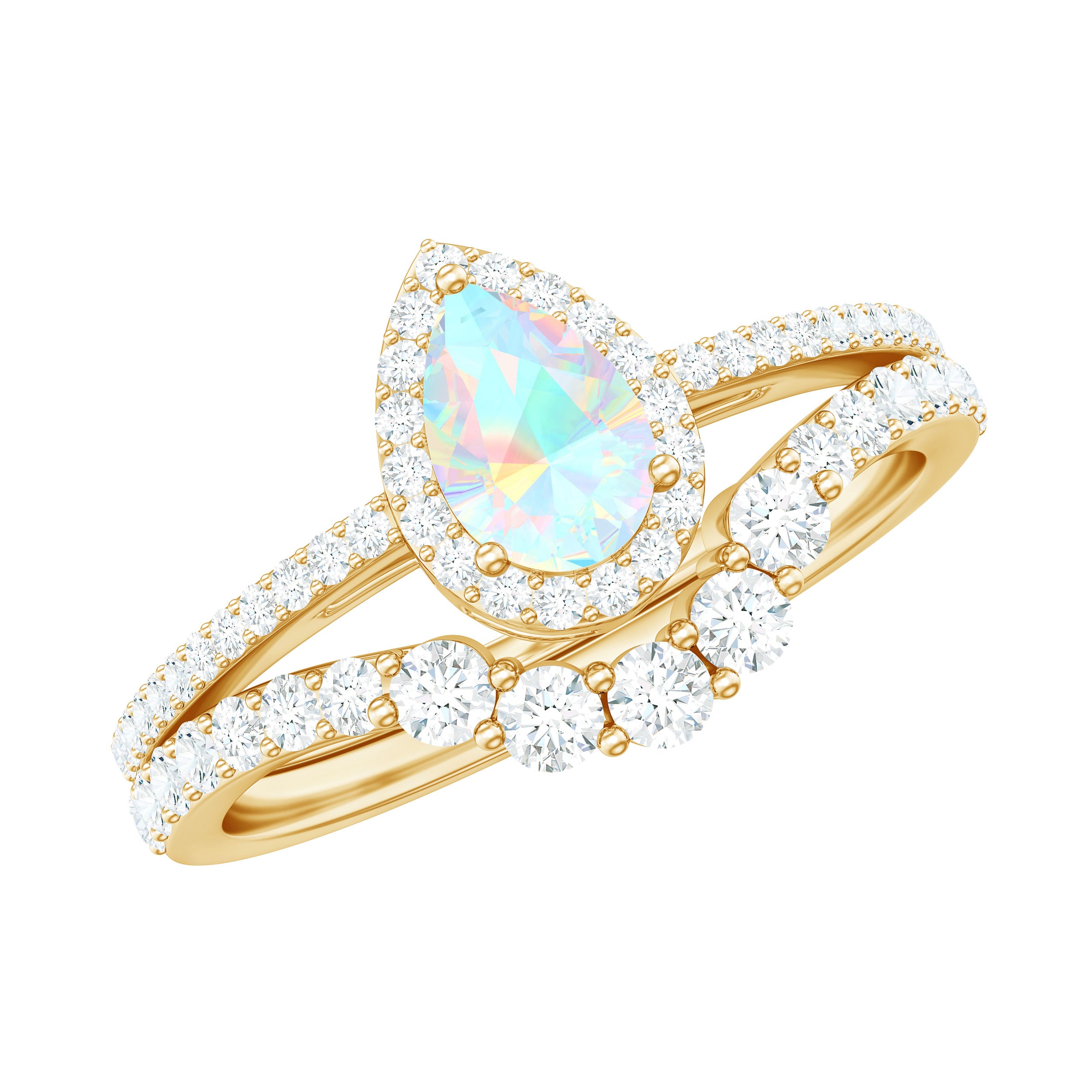 Let your love story shine with the luminous beauty of this Wedding Engagement Ring Set, a masterpiece designed for the bride-to-be who adores a touch of magic. The Teardrop Engagement Ring features a captivating 5X7 mm Pear Shape Ethiopian Opal at its center, known for its rainbow hues that shift with every movement. Wrapped in a shimmering Halo of Moissanite and accented by Moissanite Side Stones along the band, it is a piece that radiates charm and elegance. Paired seamlessly with a delicately Curved Wedding Band adorned with Round Moissanite stones, this Opal Wedding Ring Set creates a graceful and layered look that is both modern and timeless. Whether you are saying yes or celebrating a lifelong bond, this Opal Engagement Ring with Wedding Band is crafted to symbolize love. Available in a range of sizes and delivered in a signature jewelry box, this Opal Bridal Ring Set is the perfect ready-to-gift treasure for a proposal, anniversary or unforgettable moment. For the bride who wants something meaningful and refreshingly unique, this Engagement and Wedding Ring Set is love, perfectly captured in color and sparkle.