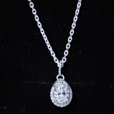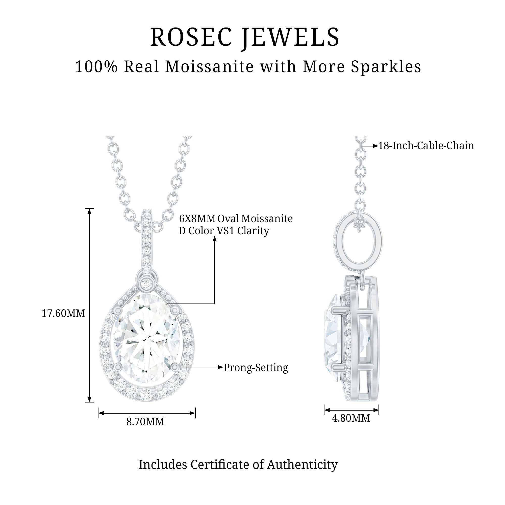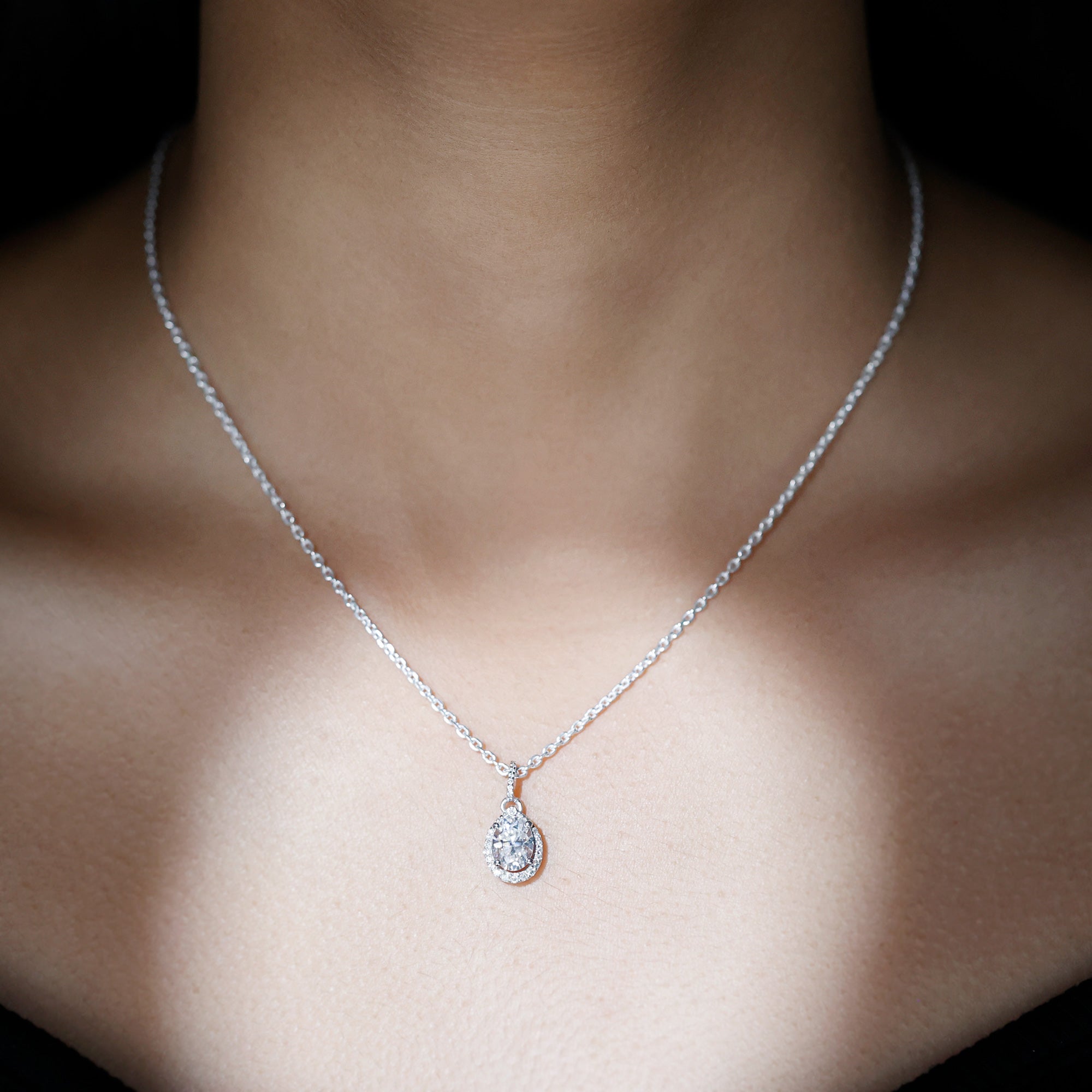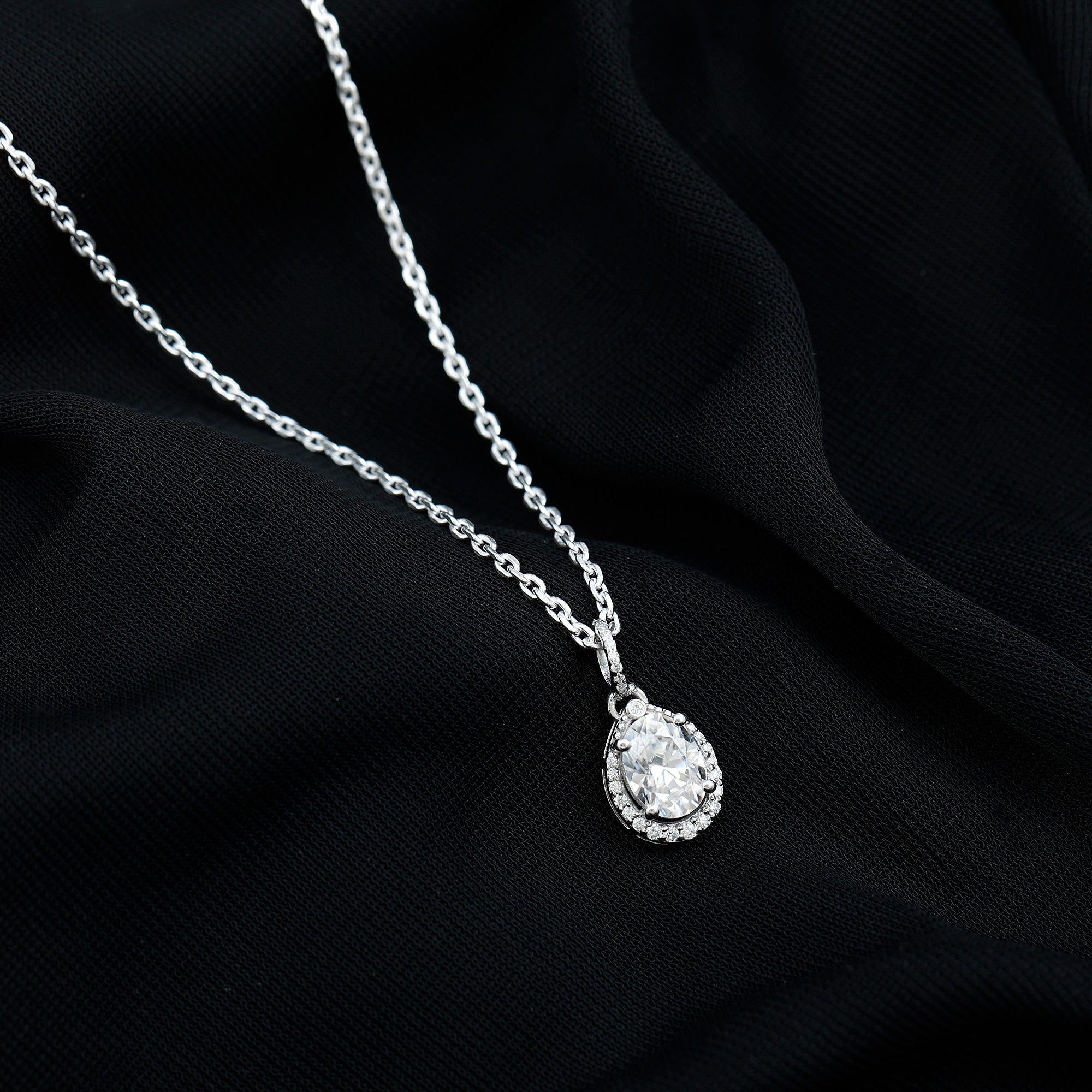 Enhance your casual or formal attire with this exquisite Moissanite Teardrop Necklace. Crafted from 14K white gold plated silver, this stunning piece showcases a 6X8 MM oval moissanite encased in a teardrop-shaped frame adorned with round moissanites. With its D Color VS1 Clarity stones and brilliant polished finish, this Oval Cut Pendant hangs gracefully from a cable chain secured by a lobster clasp. Elegant yet striking, it features a gemstone-studded bail that adds to its charm. Wear this Bride Necklace for Wedding with confidence and let it catch the light, captivating everyone around you. Transform any outfit with this unique accessory. Win her affection with this stunning Moissanite Necklace that elevates her fashion game. Transform classic beauty by highlighting everlasting sophistication with this pendant, a striking jewelry piece that radiates sparkle and style.