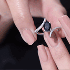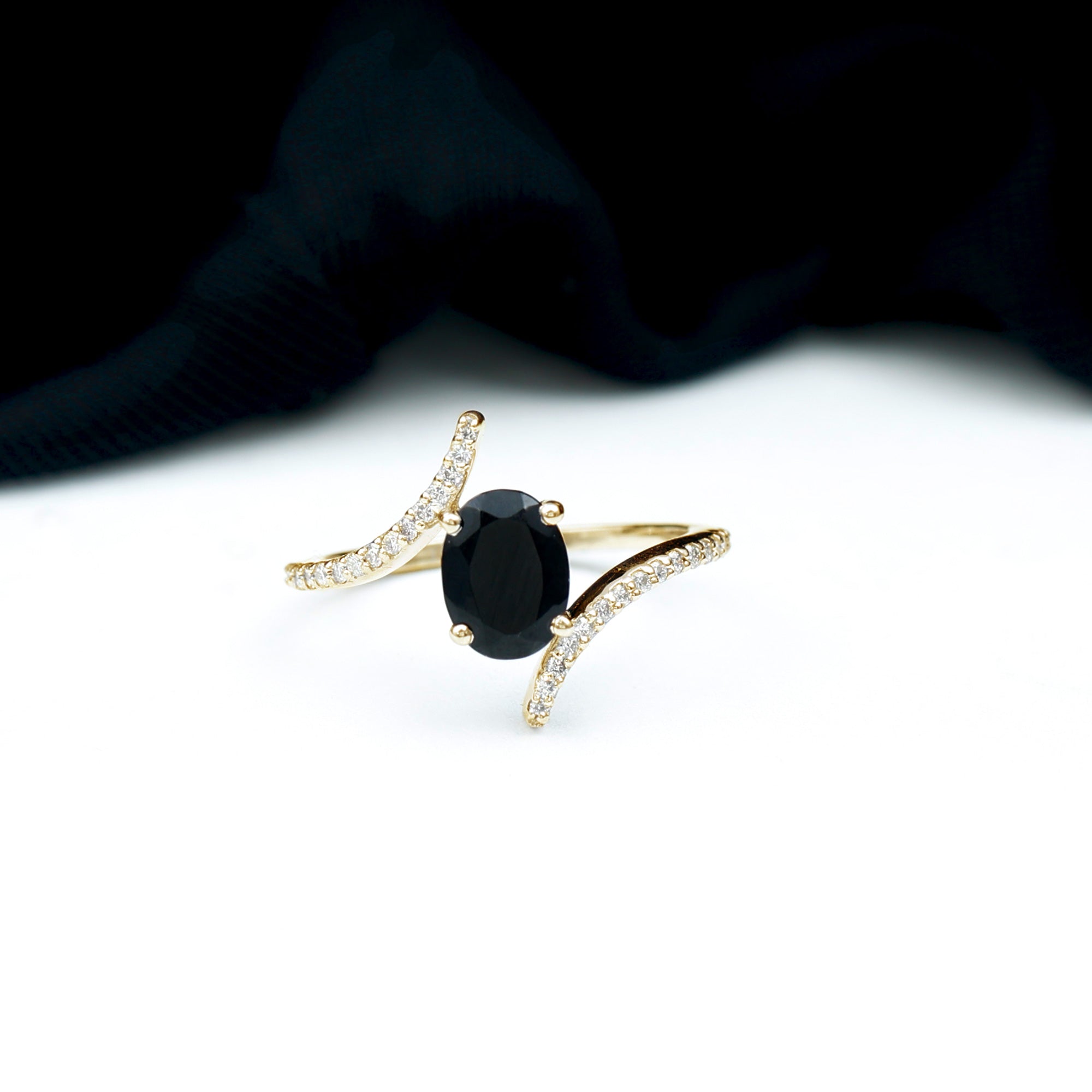 Make your moment unforgettable with this eye-catching Black Onyx Engagement Ring, designed to capture attention with its elegant and graceful details. At the center lies a 6X8 MM oval cut black onyx, securely held in prong setting. Adding a touch of brilliance, the band features a soft bypass design that gently wraps around the center stone. The bypass shank is accented with shimmering round cut diamonds, creating a beautiful contrast against the dark onyx. This design brings together classic style with a modern twist, perfect for someone who appreciates elegance. The flowing lines of the bypass band symbolize two paths becoming one, making this Onyx and Diamond Engagement Ring not only stylish but also full of meaning. Crafted with care and attention to detail, the Black Onyx Oval Ring is made for everyday comfort while still feeling special enough for life’s most important occasions. This Bypass Engagement Ring is a timeless piece that blends strength, love, and style, all wrapped into one unforgettable design. Perfect for anyone who loves unique gemstone rings with personal meaning.