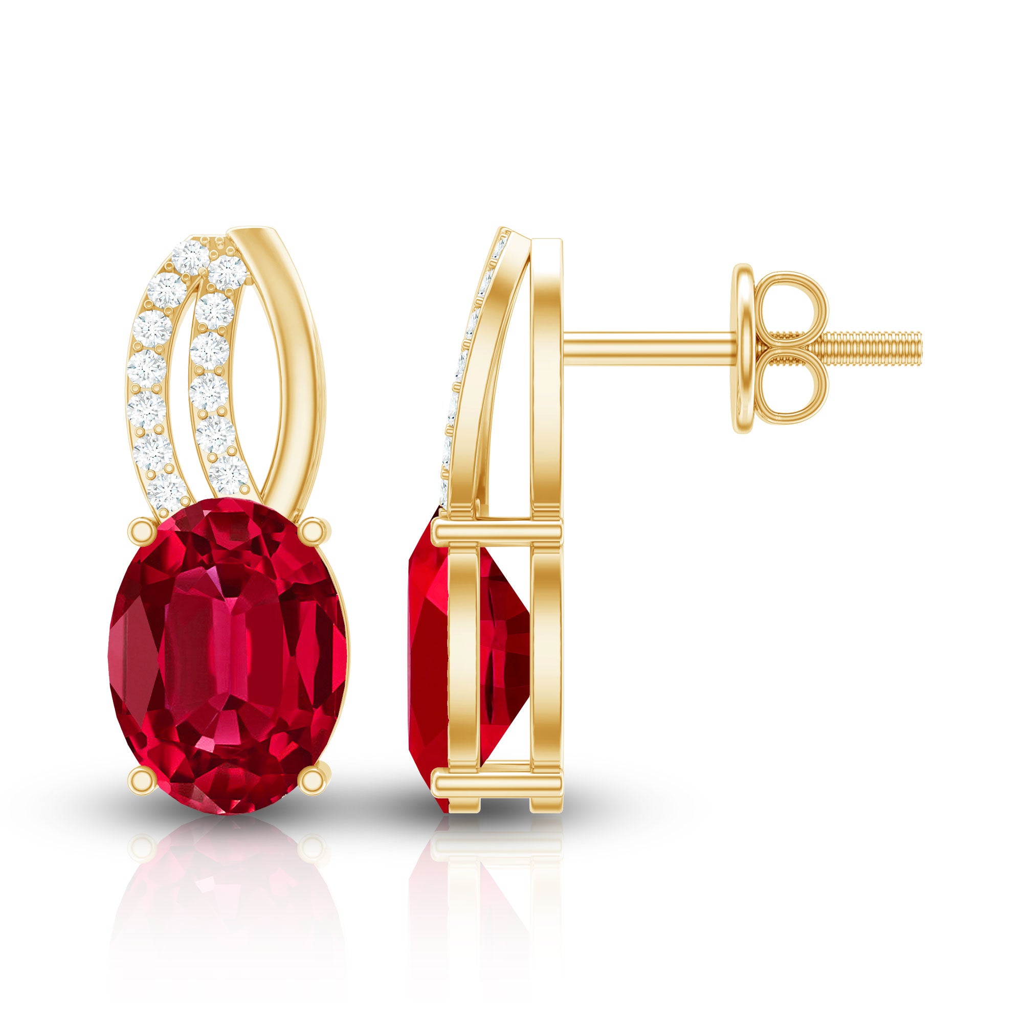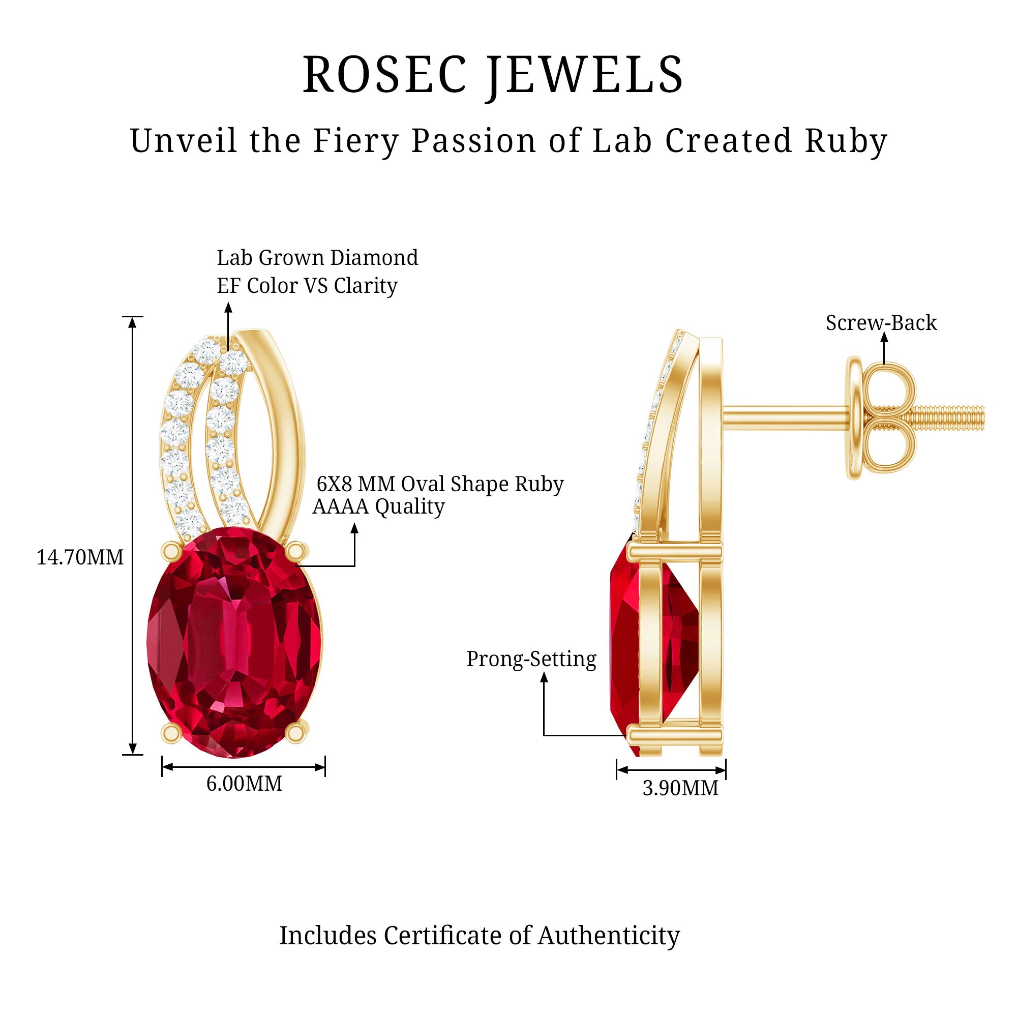 Take a chance and Indulge in the luxury of versatility with our 6x8 mm Oval Lab Created Ruby Stud Earrings, designed to be loved and flaunted on almost all types of attires. Each piece features Oval Shape Lab Created Ruby Gemstone held in prong setting and adorned with series of Round Lab Grown Diamonds at the top. Beautiful placement of Aaaa Quality Ruby and Ef-Vs Quality Diamond will impress her for sure. What sets Ruby Diamond Earrings apart is not just their aesthetic appeal but also their ethical sourcing. Dont just wear jewelry; wear confidence, wear charm, wear these earrings!
