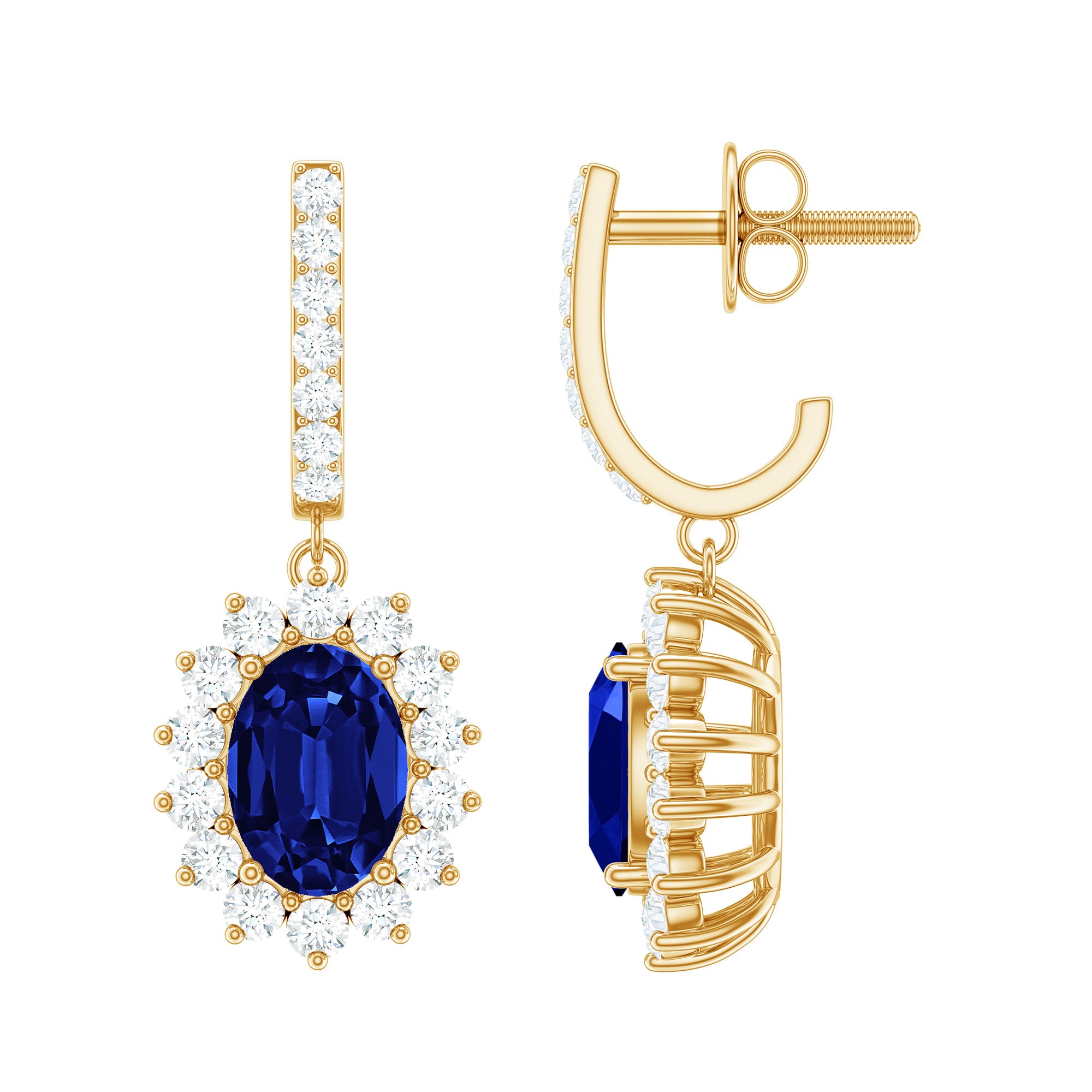 These mesmerizing Lab Grown Blue Sapphire Earrings symbolize prosperity and love. To truly elevate your special wedding day or simply to introduce a modern touch, these Hoop Drop Earrings are an excellent choice and are meticulously crafted by our skilled artisans with great attention to detail. Adorned with a 5X7 mm Oval Shape Lab Created Blue Sapphire set in Prong Setting, encircled by a Halo of Round Shape Moissanite stones, they sparkle beautifully. The J Hoop is decorated with petite Moissanite stones, making these Bridal Earrings a remarkable accessory that she will cherish forever. Contributing to a sense of royalty and sophistication, these Wedding Earrings feature a delightful detail that maintains their elegance, while their vibrant color and bold design ensure they stand out in any setting. Maximizing sparkle and brilliance, these Lab Grown Blue Sapphire Drop Earrings showcase a subtle yet elegant tone of AAAA Quality Lab Grown Blue Sapphire and D-VS1 Moissanite stones, offering exceptional brilliance.
