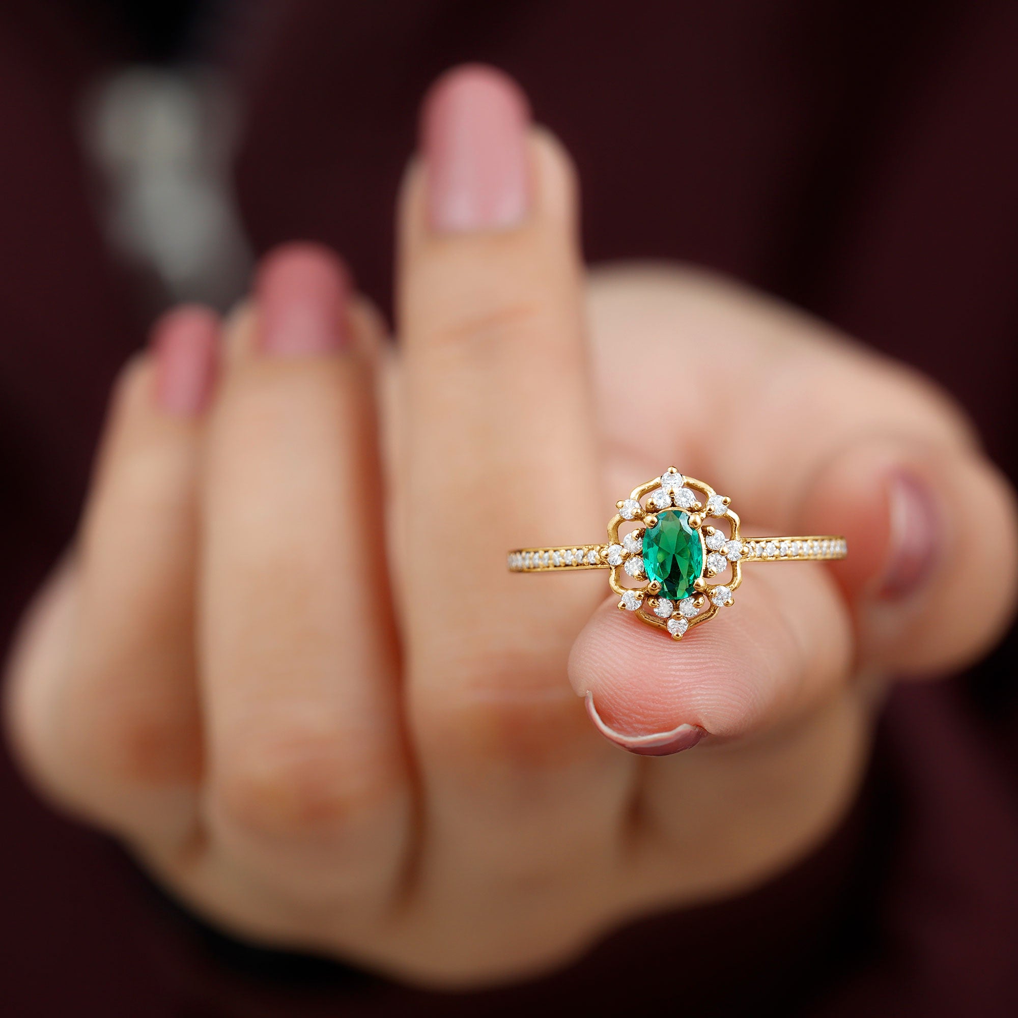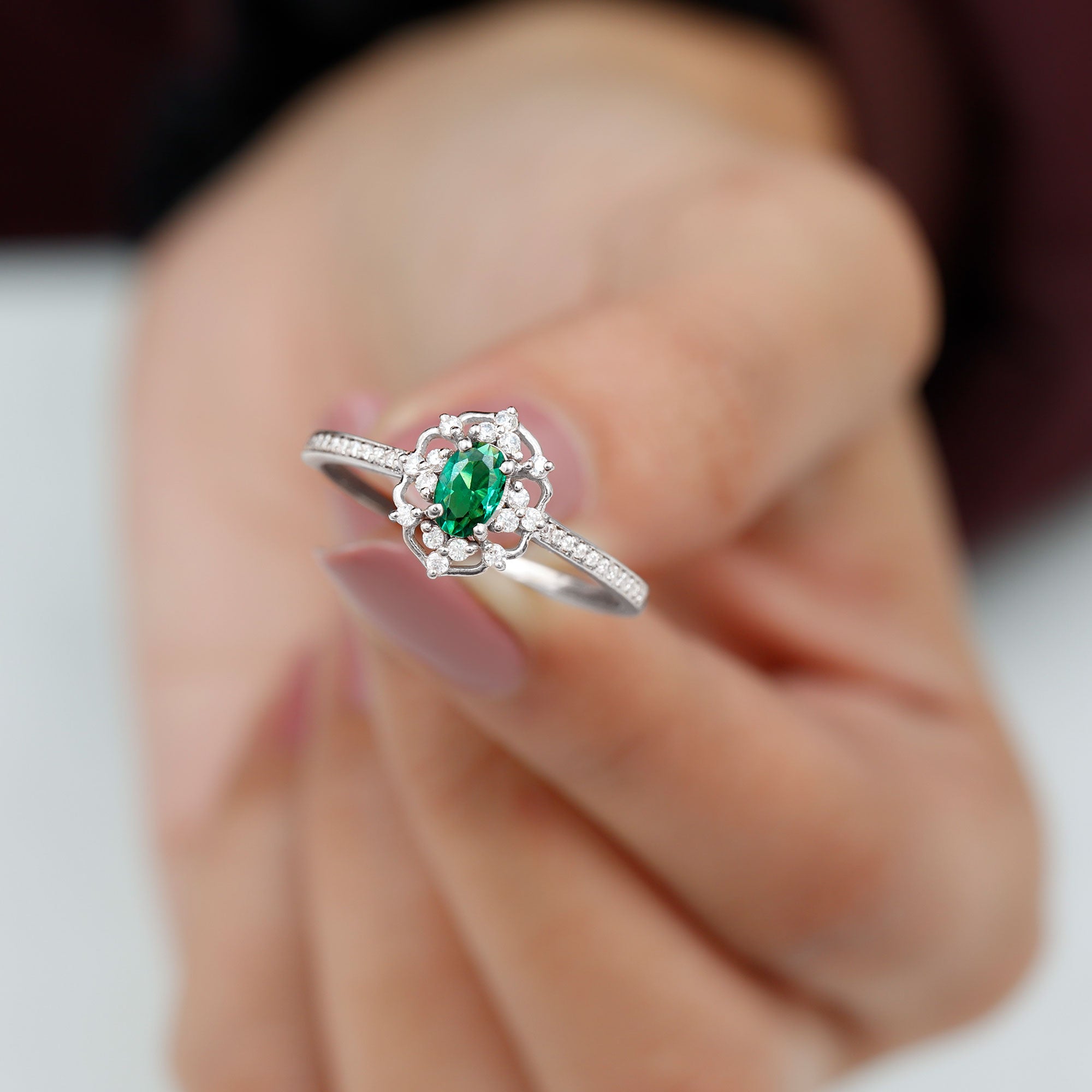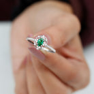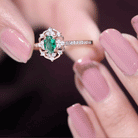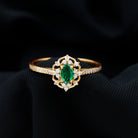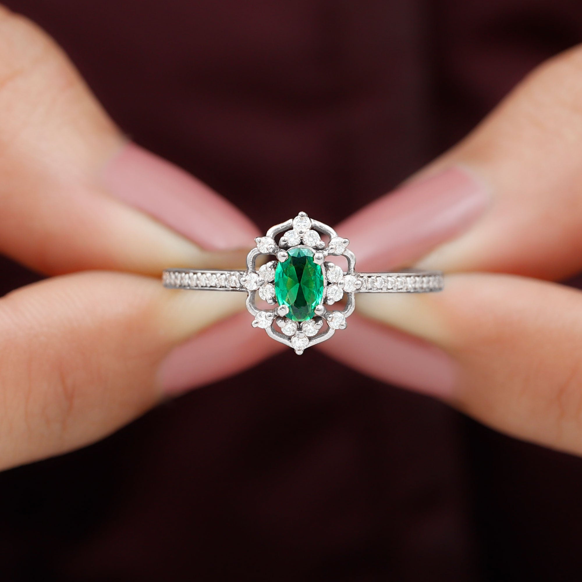 Took her breath away with this breathtaking Vintage Inspired Engagement Ring, a perfect blend of vintage charm and modern elegance. At the center of this mesmerizing ring is a vibrant 4X6 mm Oval Shape Lab Created Emerald set in Prong Setting, glowing with a rich green hue that symbolizes renewal and commitment. The AAAA Quality Lab Emerald is beautifully set in a vintage inspired design, surrounded by a delicate sparkling HI-SI Diamond stones that enhance its brilliance and draw the eye to the center. The slim band is also adorned with dainty Diamond stones that add subtle sparkle with every movement, while maintaining an elegant and timeless look. The retro design gives this Oval Emerald Engagement Ring a nostalgic feel, making it an exceptional choice for those who appreciate classic style with a unique twist. Whether you are proposing or marking a special moment, this Emerald Diamond Engagement Ring stands as a symbol of everlasting love. Its intricate design and radiant gemstones ensure it remains a cherished piece that never goes out of style. This Lab Grown Emerald Ring is a promise, a statement, and a memory to be treasured forever.