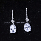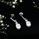 Make your wedding jewelry set complete with these Moissanite Drop Earrings, precisely crafted with 14K White Gold Plated Silver. The earrings feature a 7X9 MM Oval Shape Moissanite and are topped with a cluster of Round Shape Moissanite. These Drop Dangle Earrings dazzle with the classic shine of D-VS1 Quality Moissanite. The inner radiance of Moissanite will not only complement your outfit but also give you confidence while walking down the aisle. These Earrings with Screw on Backs will be delivered to you in a velvet pouch with the certificate of authenticity.