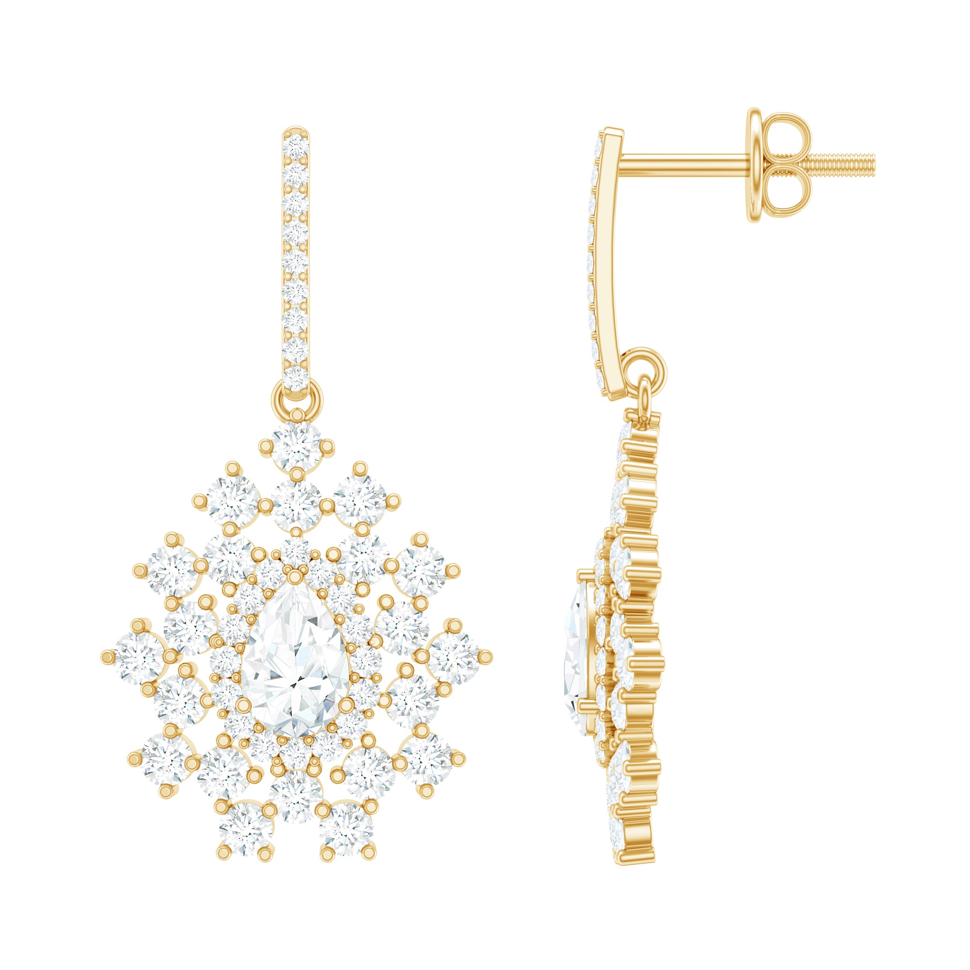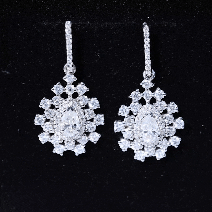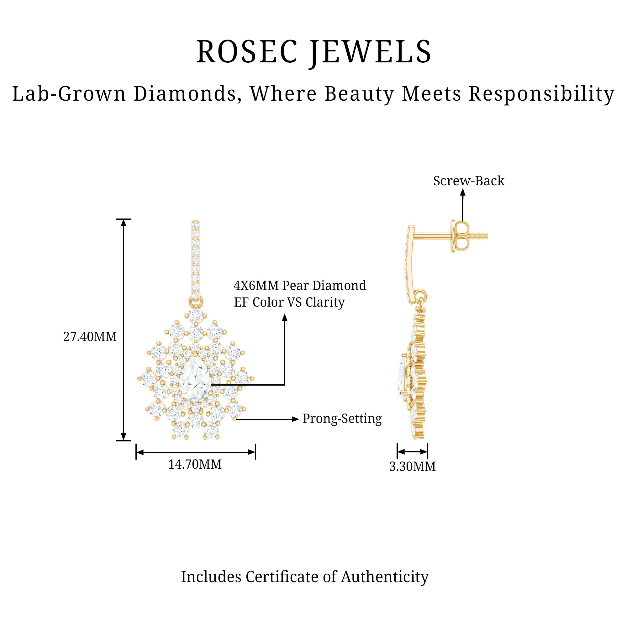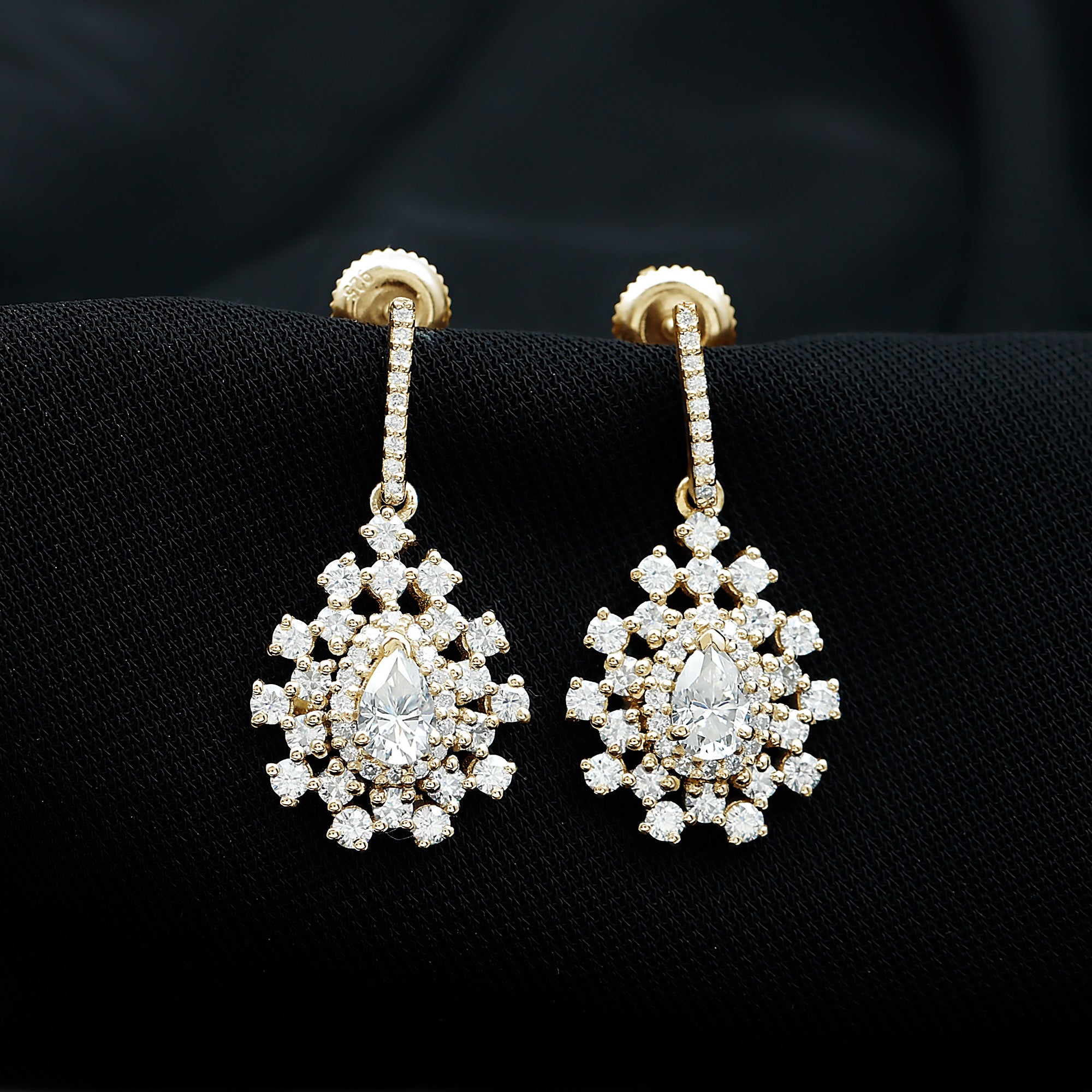 In these Bridal Earrings, a 4X6 MM pear shaped diamond takes center stage, beautifully framed by layers of round cut diamond halo and dangling from a decorative bar at the top. Secure prongs gracefully holds each gemstone in place, enhancing its brilliance, while the screw back closure ensures the earrings sit safely on your earlobes, offering a flawless fit with every wear. Our Diamond Wedding Earrings will add the perfect sparkle to your bridal glow. The Lab Grown Diamond Earrings are an affordable option for those born in April or those whose zodiac sign is Aries, these Drop Earrings hold even deeper meaning, representing clarity, love, and strength.