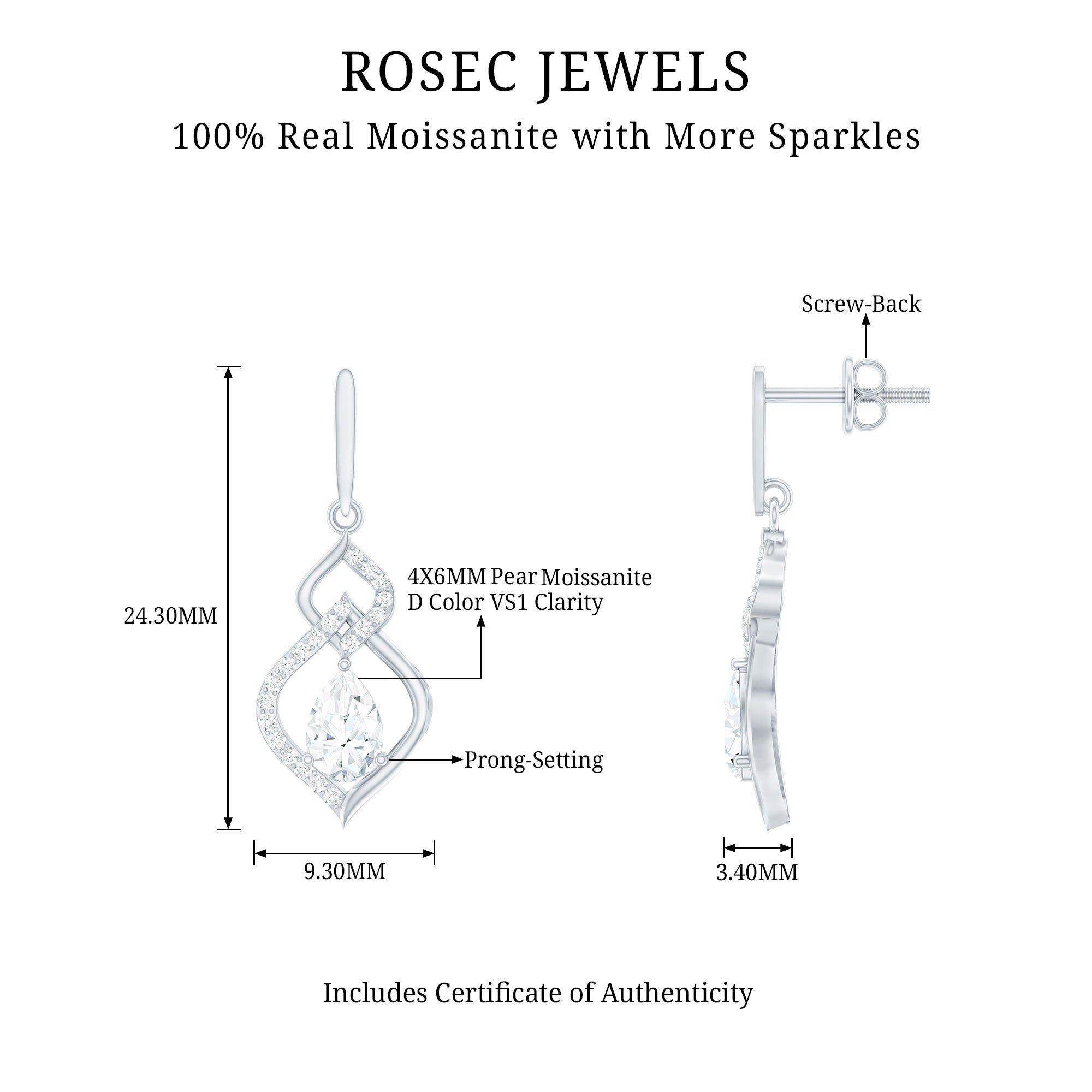 Achieve an iconic look on D-Day with these Moissanite Drop Earrings, crafted with 14K White Gold Plated Silver. The earrings feature a 4X6 MM Pear Shaped Moissanite secured in Prong Setting at the center of metallic frame partially studded with petite stones. These Drop Dangle Earrings hold the classic shine of D-VS1 Quality Moissanite. The radiance of these earrings not only completes your look but also enhances your beauty, which makes them perfect for special occasions, including walking down the aisle or celebrating a milestone in your relationship. These Earrings with Screw on Backs will be delivered to you in a signature velvet pouch with the certificate of authenticity.