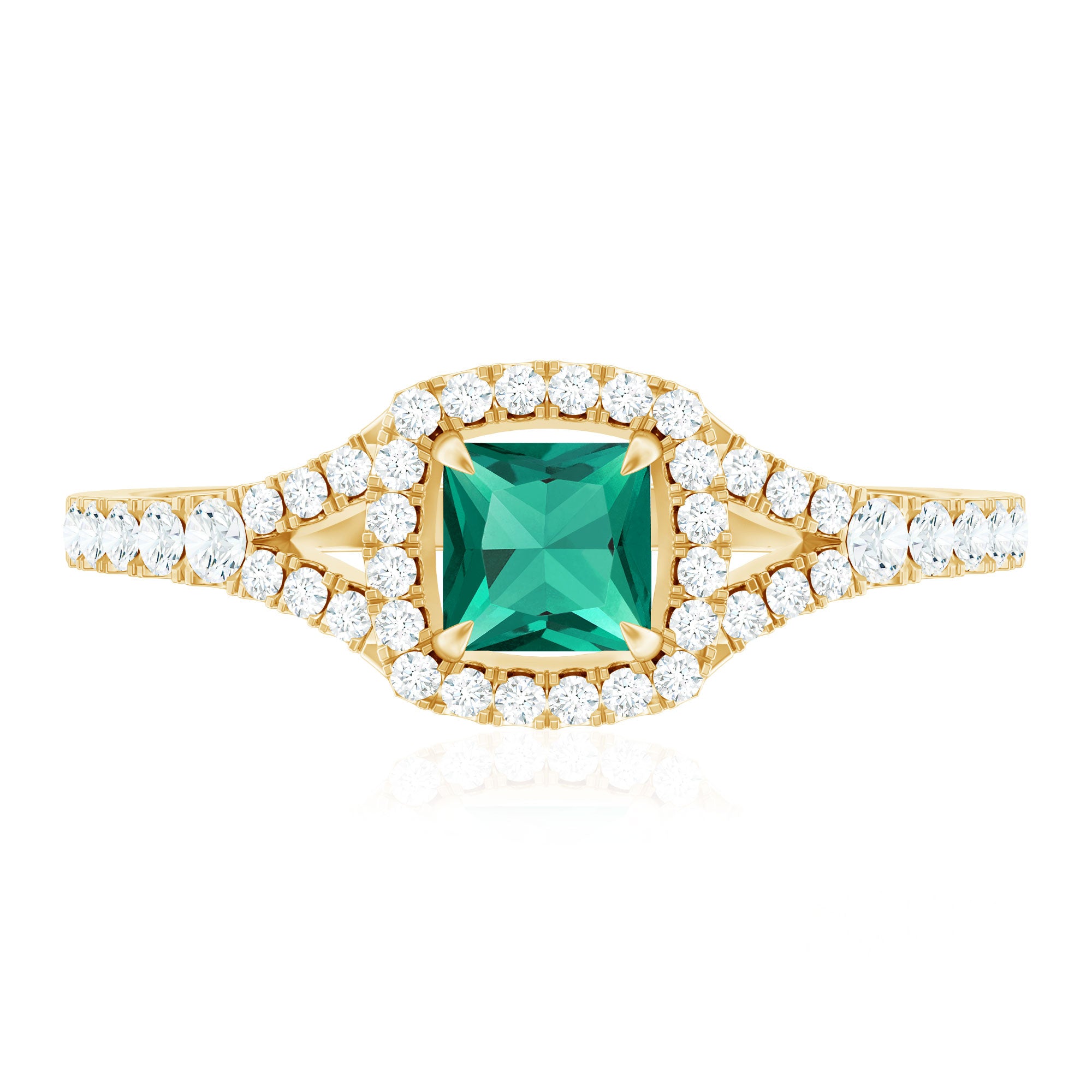 A promise is a beautiful vow, a heartfelt commitment to stand by someone through every moment, big or small. This Lab Grown Emerald Ring is the perfect symbol of that special promise, representing love, trust, and a bright future together. At the center of this stunning Proposal Ring is a 4 mm Lab Grown Emerald in a Princess Cut, surrounded by a sparkling Halo of Diamond gemstones that enhance its vibrant green glow. The Lab Emerald symbolizes growth, hope, and harmony, making this Emerald Diamond Ring a meaningful choice for expressing your deep connection. The Split Shank Band adds an elegant touch, adorned with delicate Diamond that catch the light and add extra brilliance to the design. This thoughtful arrangement creates a graceful look, perfect for both everyday wear and special occasions. Available in various ring sizes, this Princess Cut Emerald Ring offers a comfortable fit and is designed to be cherished for a lifetime. This Emerald Halo Ring comes beautifully packaged in a jewelry box, ready to be gifted as a meaningful token of your love. Whether it is to celebrate a special milestone, an anniversary, or simply a promise of forever, this Promise Engagement Ring is the ideal choice to show your love timelessly and elegantly.