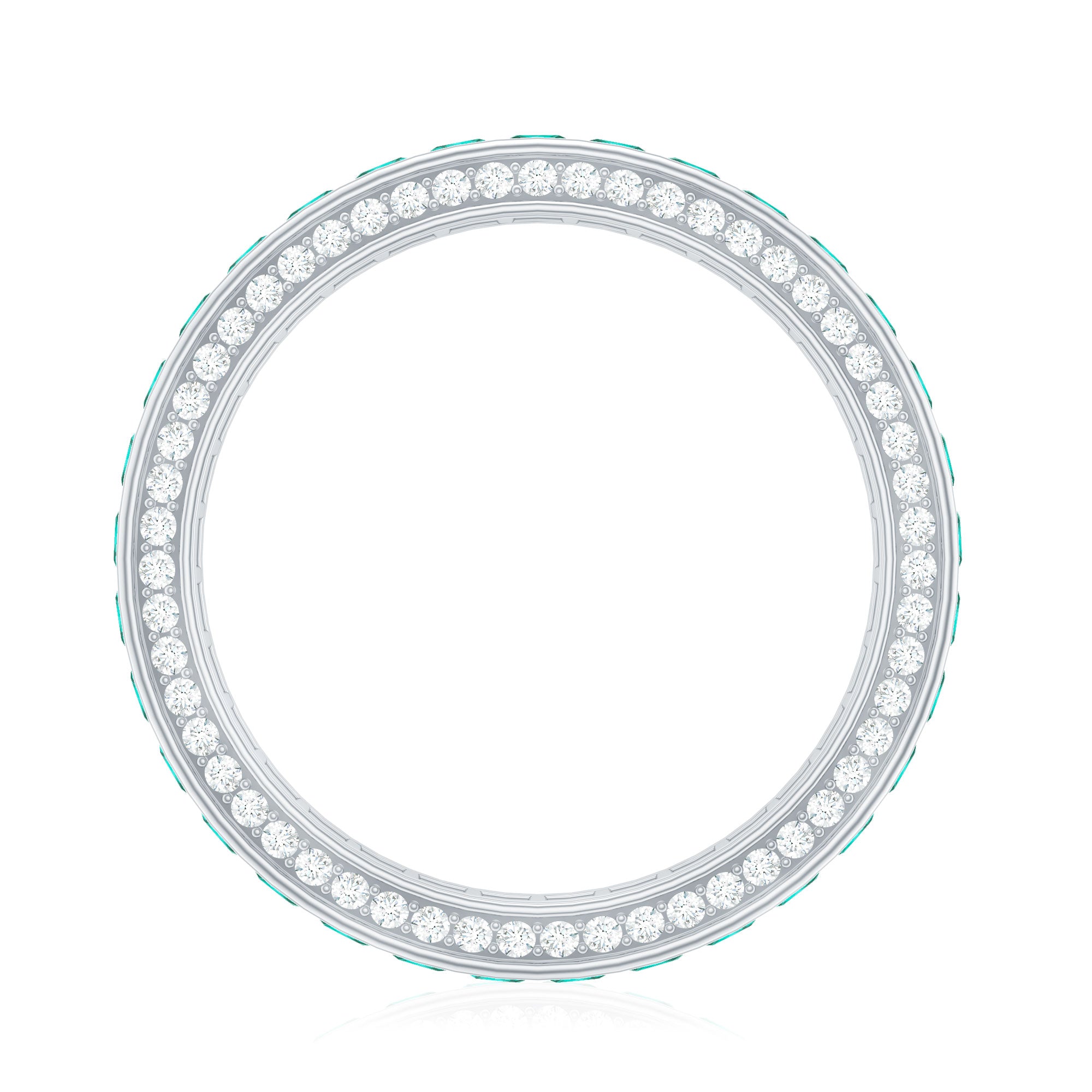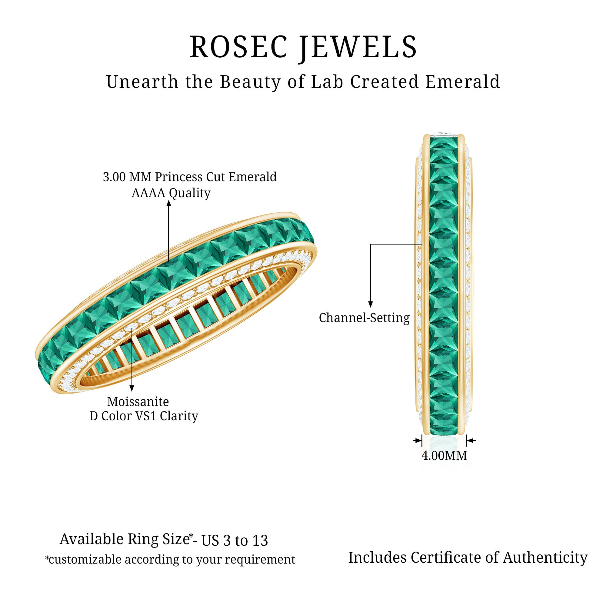 Bright, bold and full of meaning, this Princess Cut Wedding Band is a stunning twist on a classic design. At the center of the band is a continuous row of 3 mm Princess Cut Lab Created Emerald stones set in Channel Setting. Their rich green color stands for growth, loyalty and lasting love. Framing the Lab Emerald on both sides are rows of sparkling Moissanite stones, that adds contrast and fire with every move. The result is a Eternity Wedding Band that feels both modern and regal, perfect for someone who wants their love story to shine with individuality. The AAAA Quality Princess Cut Lab Emerald stones give a contemporary look, while the sparkling D-VS1 Moissanite stones add a touch of luxury and light. Whether worn as a wedding band, an anniversary ring or a meaningful gift, this Lab Grown Emerald Ring is built to turn heads and warm hearts. This Lab Emerald Eternity Ring arrives beautifully packaged in a classic jewelry box, ready for a special moment. Elegant yet powerful, this Lab Emerald Moissanite Ring is a celebration of your unique bond and bold spirit.
