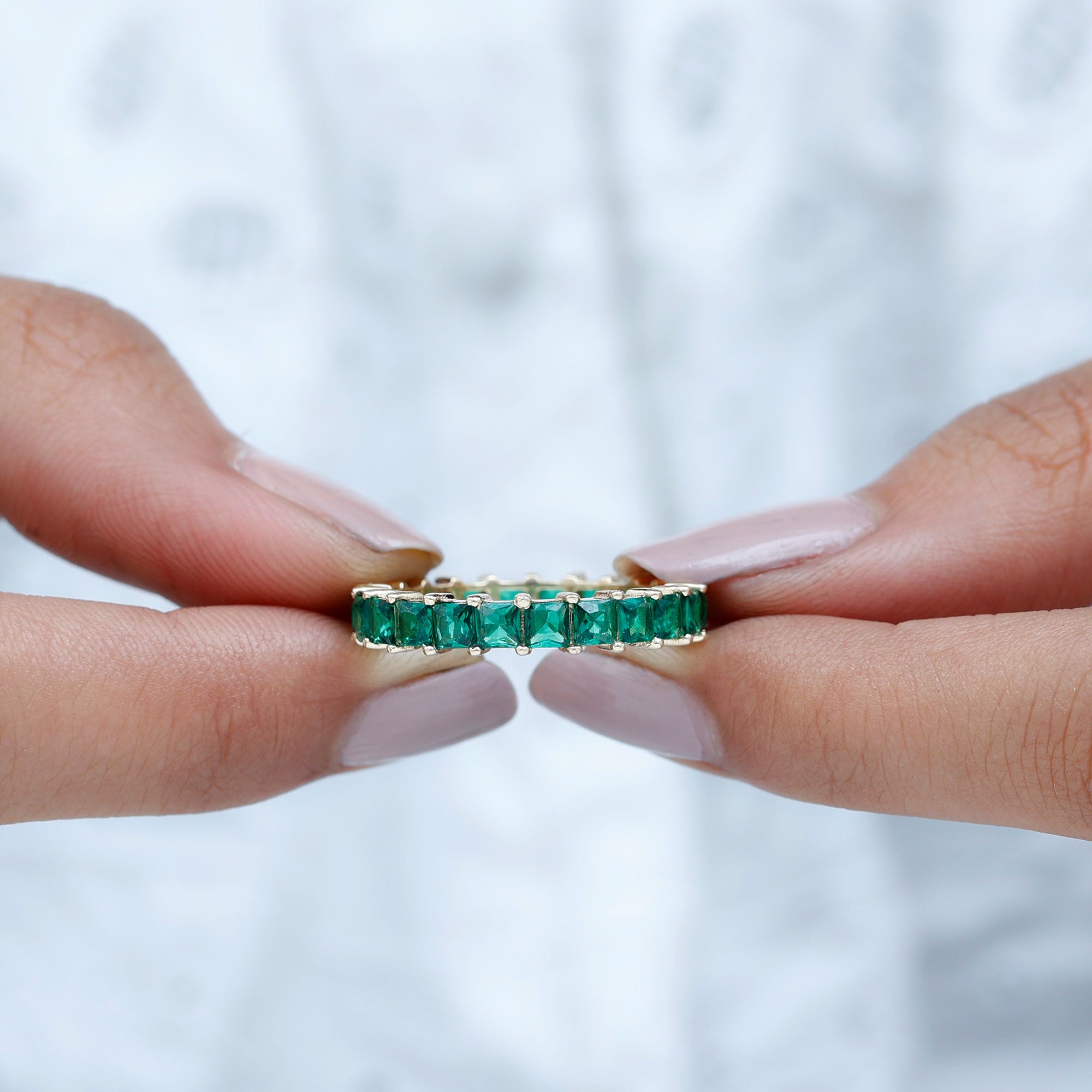 Celebrate everlasting love with this Eternity Wedding Band, a stunning blend of modern elegance and meaningful symbolism. Featuring 3 mm Princess Cut Lab Created Emerald stones in Shared Prong Setting, this Full Eternity Band radiates a vibrant green glow, symbolizing growth, harmony and renewal, perfect for a couple beginning their lifelong journey together. This Lab Grown Emerald Ring is designed to sit comfortably on the finger while adding a touch of bold sophistication. Lab grown for ethical and sustainable brilliance, each Lab Emerald offers exceptional clarity and color, that makes this Lab Emerald Wedding Band a radiant and responsible choice. Whether worn alone for minimalist elegance or paired with an engagement ring for added sparkle, this Princess Cut Wedding Band makes a timeless statement of devotion. Available in various US ring sizes, this Princess Cut Eternity Band ensures the perfect fit for every bride or groom. Rosec Jewels presents this handcrafted Wedding Band, thoughtfully packaged in a Signature Jewelry Box, ready to symbolize your unique love story and cherish forever.