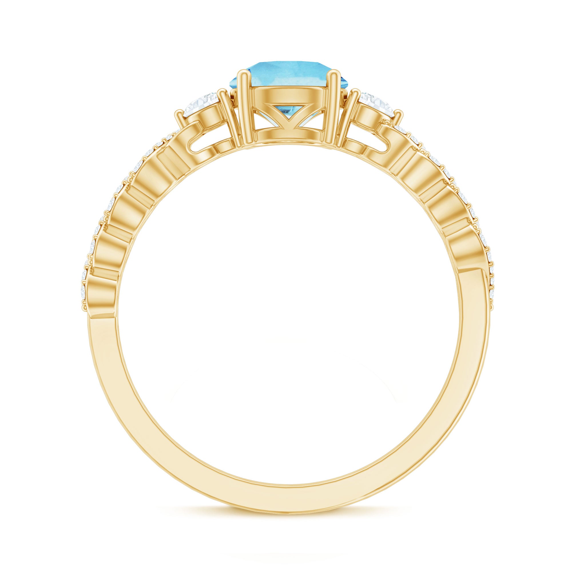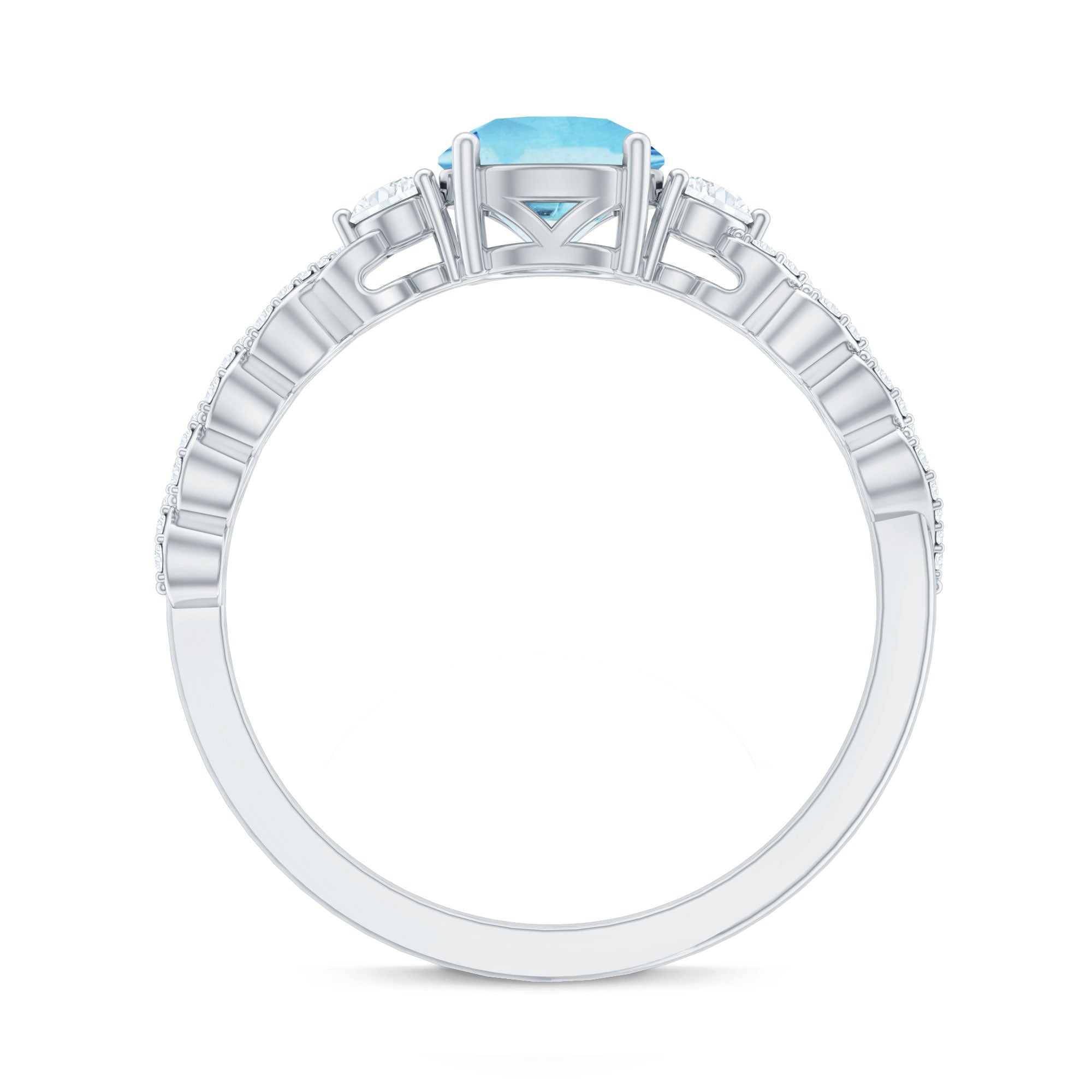 Make your special day unforgettable with this Aquamarine Engagement Ring, a breathtaking blend of elegance, romance and artistry. At its center lies a 6 mm Round Shape Aquamarine gemstone set in 4 Prong Setting, whose serene blue hue evokes calm and the deep connection of true love. Flanking the center stone are sparkling Diamond Side Stones that add brilliance and sophistication, reflecting light with every movement. The band with a unique design, thoughtfully crafted with intricate details, elevates the uniqueness and modern charm of this Aquamarine Diamond Ring while maintaining timeless elegance. Available in various ring sizes and presented in a signature jewelry box, this Aquamarine Solitaire Ring is ready to become part of your love story, capturing the promise of forever in every glance. With its dazzling AAA Quality Aquamarine, sparkling HI-SI Diamond stones and exquisite craftsmanship, this Aquamarine Ring for Women ensures your special moment is remembered for the extraordinary elegance it embodies.