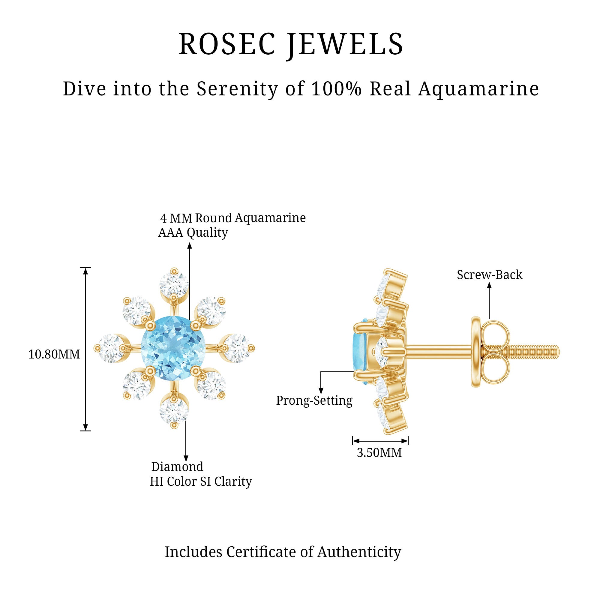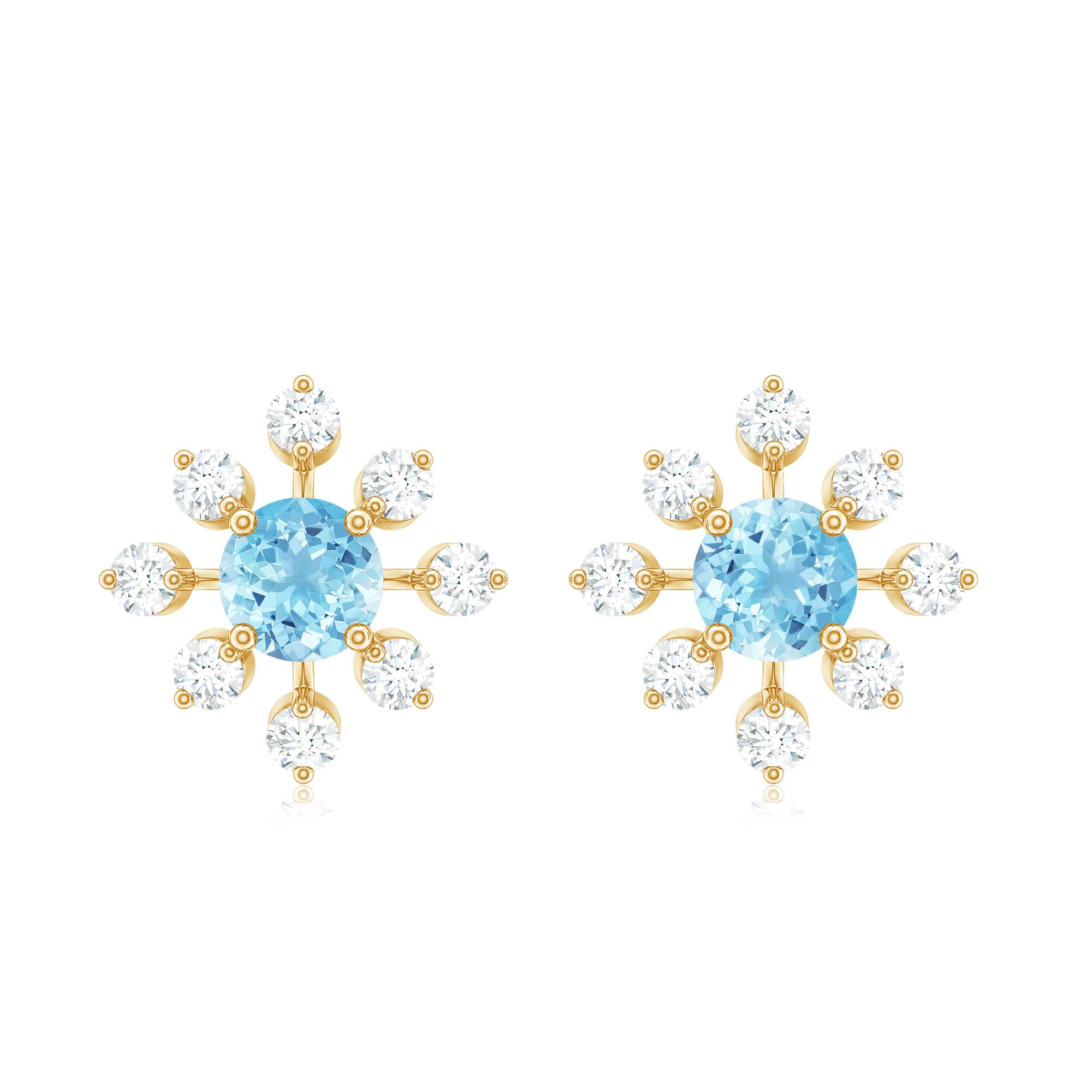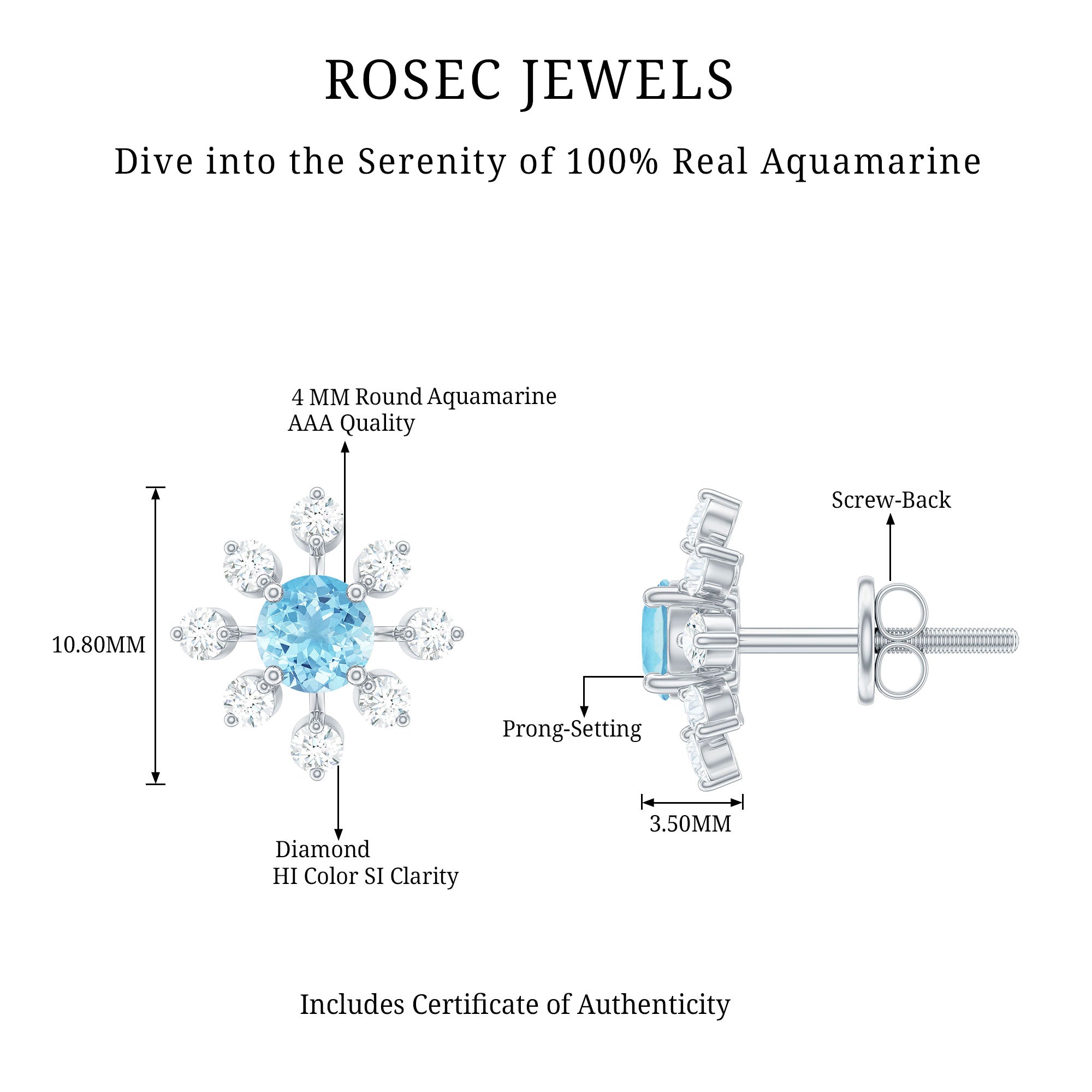 Celebrate the magic of winter’s sparkle with these enchanting Snowflake Earrings, a design that beautifully captures the essence of icy elegance and timeless charm. Each earring features a 4 mm Round Shape Aquamarine gemstone in Prong Setting, surrounded by sparkling Diamond stones that glisten like freshly fallen snow. The intricate Snowflake Inspired design symbolizes purity, individuality and the beauty of fleeting moments, while the Screw Back Closure ensures comfort and security for effortless wear. Whether you are dressing up for a festive evening, a romantic dinner or adding a touch of shimmer to your everyday style, these Aquamarine Stud Earrings promise to illuminate your look with grace and sophistication. Their blue hue and sparkling stones blend seamlessly with both modern and classic outfits, making these Aquamarine Diamond Earrings a versatile treasure for every occasion. Presented in a signature jewelry box, these Aquamarine Ear Studs also make a heartfelt gift, perfect for celebrating love, milestones or simply the joy of the season.