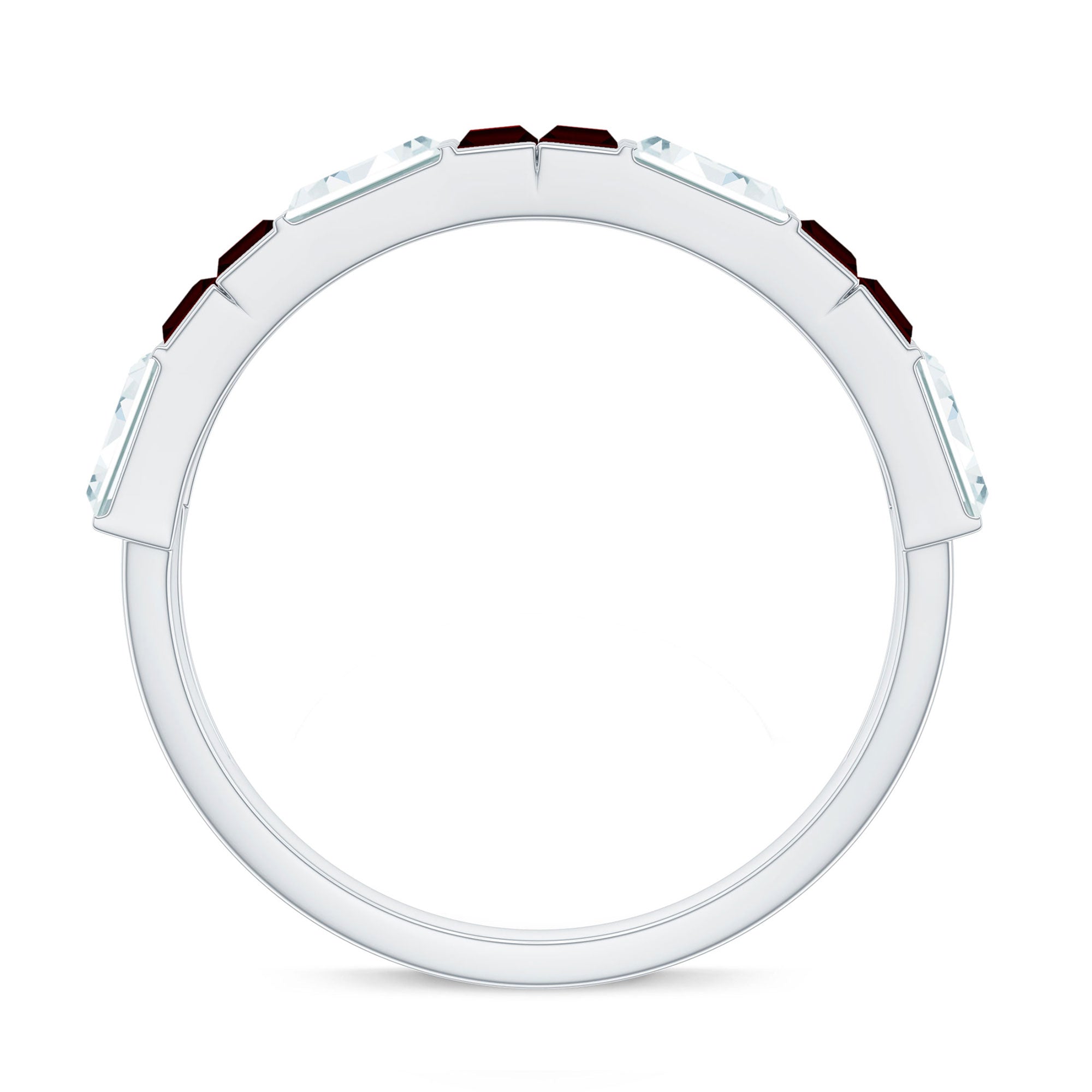Simply stunning, this Half Eternity Band brings together bold elegance and heartfelt meaning in a design that feels both modern and deeply romantic. The rich red Baguette Shape Garnet stones symbolize a chapter of your love story and the emotions that have strengthened your bond over time. Complementing their fiery beauty, horizontally placed Baguette Shape Moissanite stones add an eye-catching sparkle, creating a perfect blend of warmth and brilliance with every movement of the hand. This unique arrangement gives the band a sleek, contemporary feel while still honoring the timeless sentiment of an eternity ring. Available in various ring sizes, this Garnet Eternity Band is designed to fit comfortably and beautifully for everyday wear, making it the ideal piece for a wedding band, anniversary gift or meaningful surprise. Presented in a signature jewelry box, this Baguette Eternity Band arrives ready to be treasured, turning your moment into something unforgettable. This Baguette Garnet Ring is a symbol of devotion, unity and the forever you have chosen to build together.