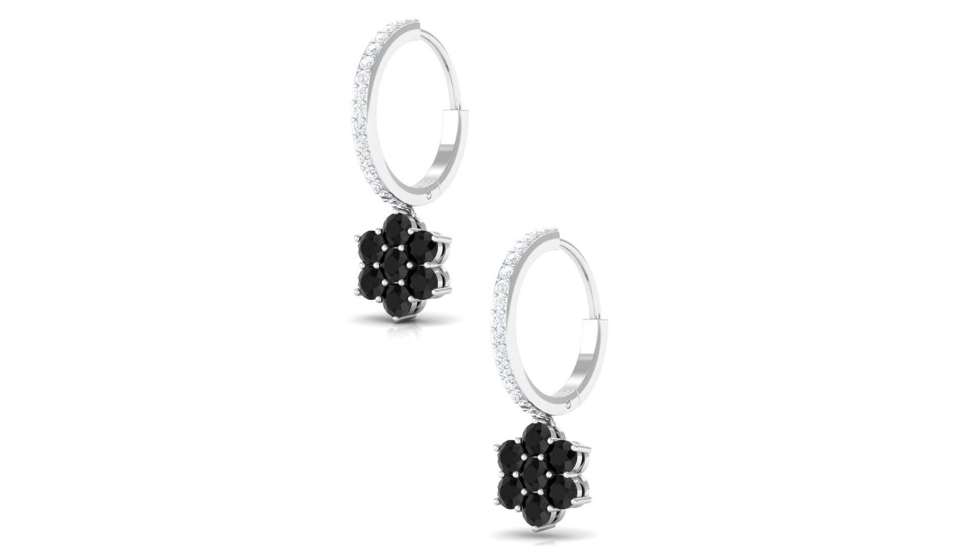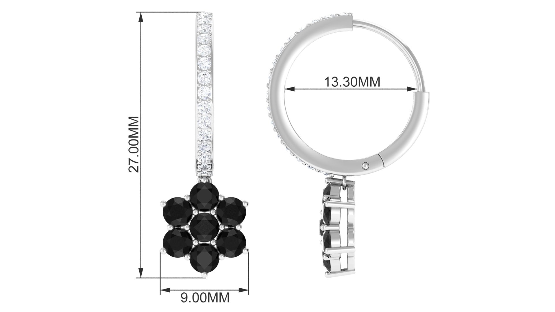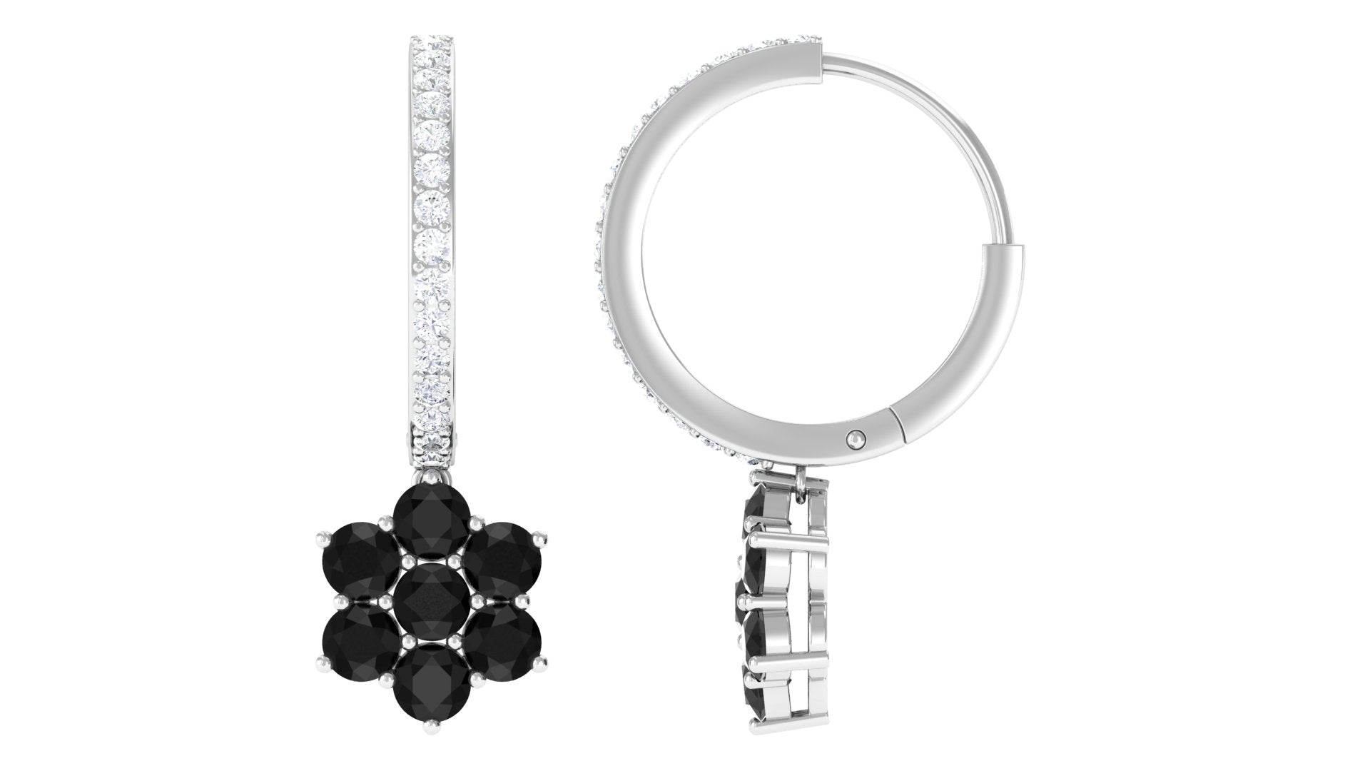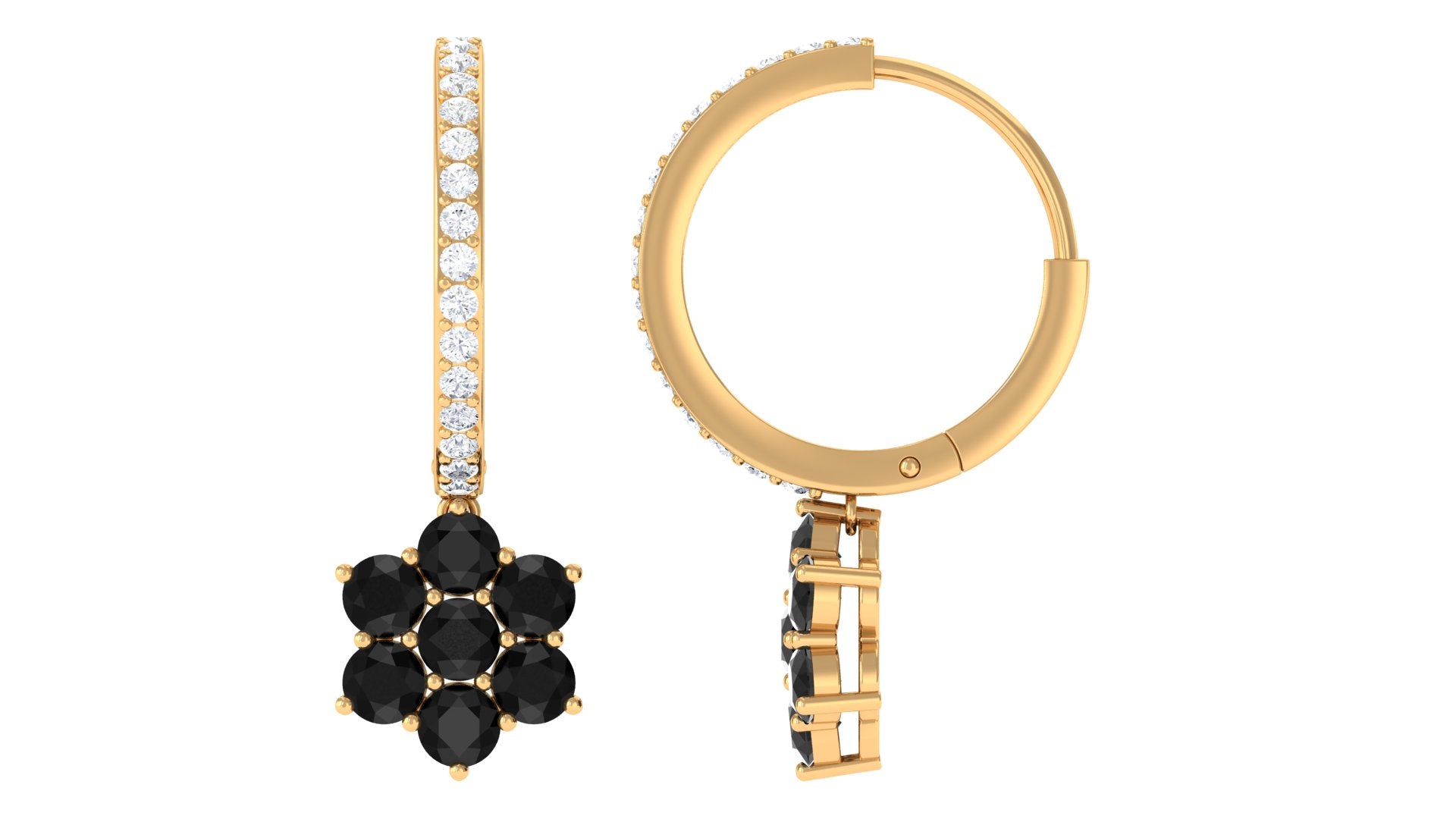 Bloom with confidence and charm wearing these exquisite Flower Drop Earrings, designed to capture the beauty of nature in every detail. Each earring features a delicate Flower crafted from lustrous 3 mm Round Shape Black Onyx gemstones set in Prong Setting, gracefully hanging from a Diamond studded Hinged Hoop that adds a brilliant touch of sparkle. The contrast between the deep Black hue of the AAA Quality Onyx and the radiant shimmer of the HI-SI Diamond stones creates a look that is both bold and feminine. Elegant and comfortable, these Black Onyx Drop Earrings move beautifully with you, adding a hint of sophistication to both casual and formal outfits. Whether you’re attending a romantic dinner or elevating your everyday style, they bring a sense of timeless elegance and grace to any occasion. Presented in a signature jewelry box, these Black Onyx Diamond Earrings arrive ready to gift, perfect for birthdays, anniversaries or simply to make someone’s day special. Romantic and effortlessly stunning, these Hinged Hoop Earrings are a celebration of beauty, confidence and everlasting style.