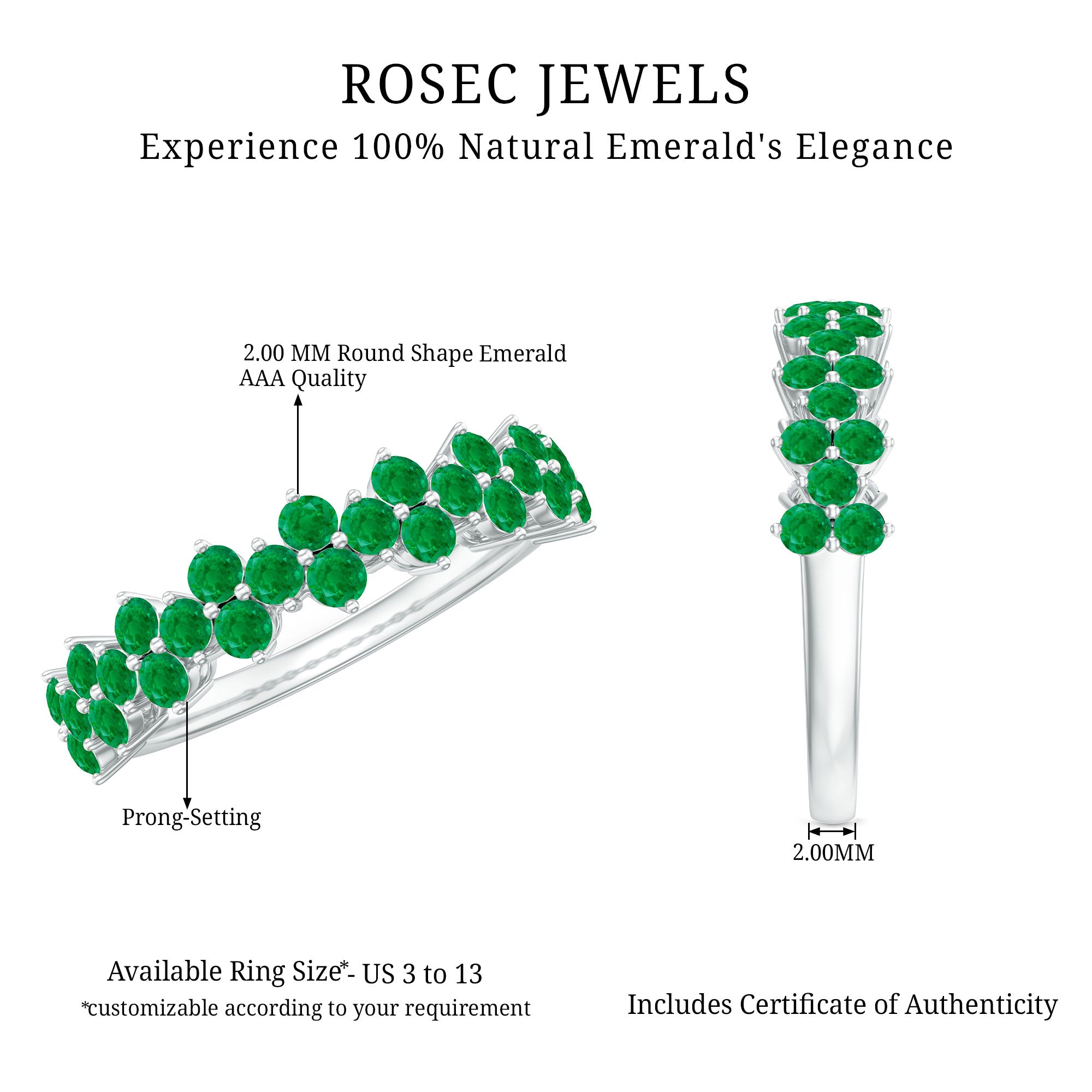 Grace her hand with timeless sophistication and a touch of enchantment, this Half Eternity Ring is a breathtaking reminder that true love never fades. This Fine Band Ring features Round Shape Emerald gemstones set in Prong Setting, that gleams with a rich green hue, symbolizing renewal, hope and an everlasting bond that only grows stronger with time. Expertly set in a Half Eternity Band, the Emerald gemstones shimmer in perfect harmony, capturing the essence of cherished memories and new beginnings. Whether you are celebrating an anniversary or a milestone, this Emerald Band Ring adds a meaningful sparkle to every moment. The refined design effortlessly blends classic elegance with modern grace, making this Emerald Anniversary Ring a piece she will treasure every day. Thoughtfully packaged in a signature jewelry box and available in various ring sizes, this Wedding Anniversary Ring is ready to gift and ready to make her heart skip a beat.
