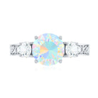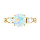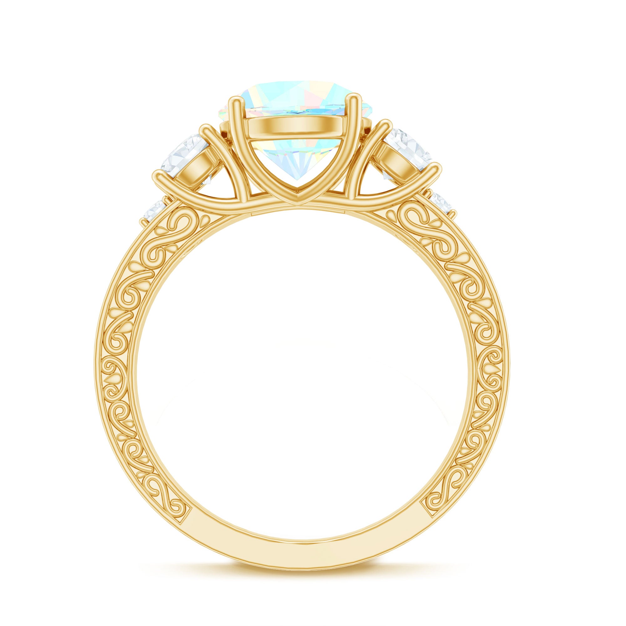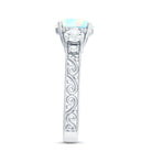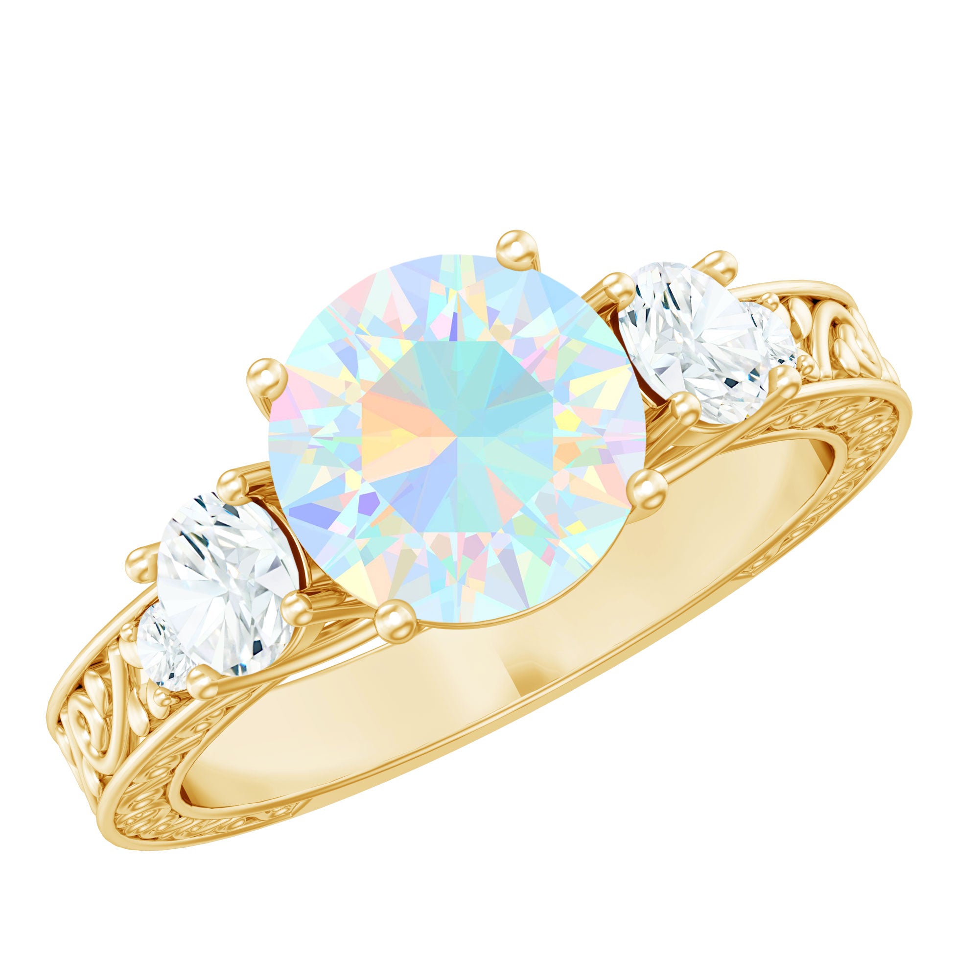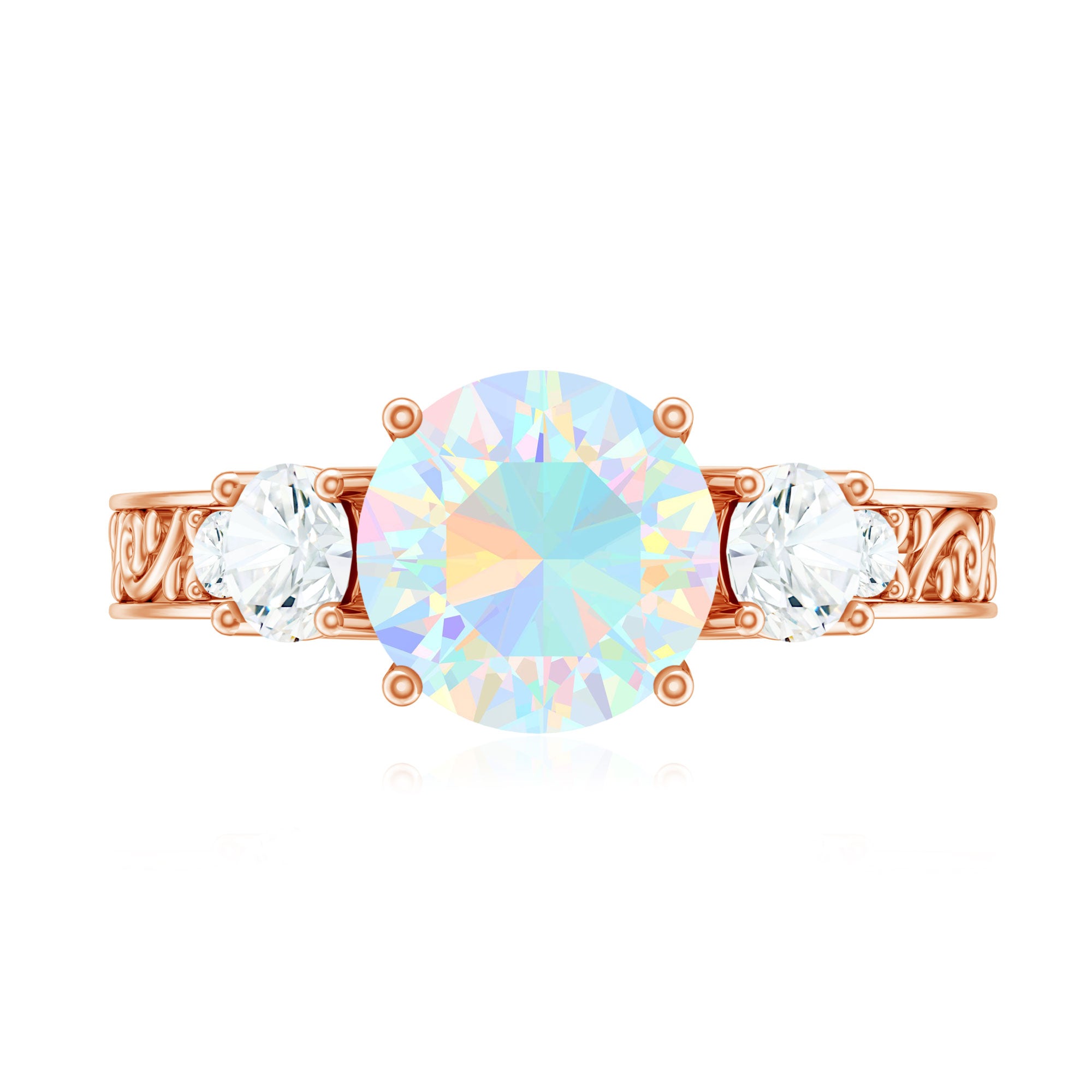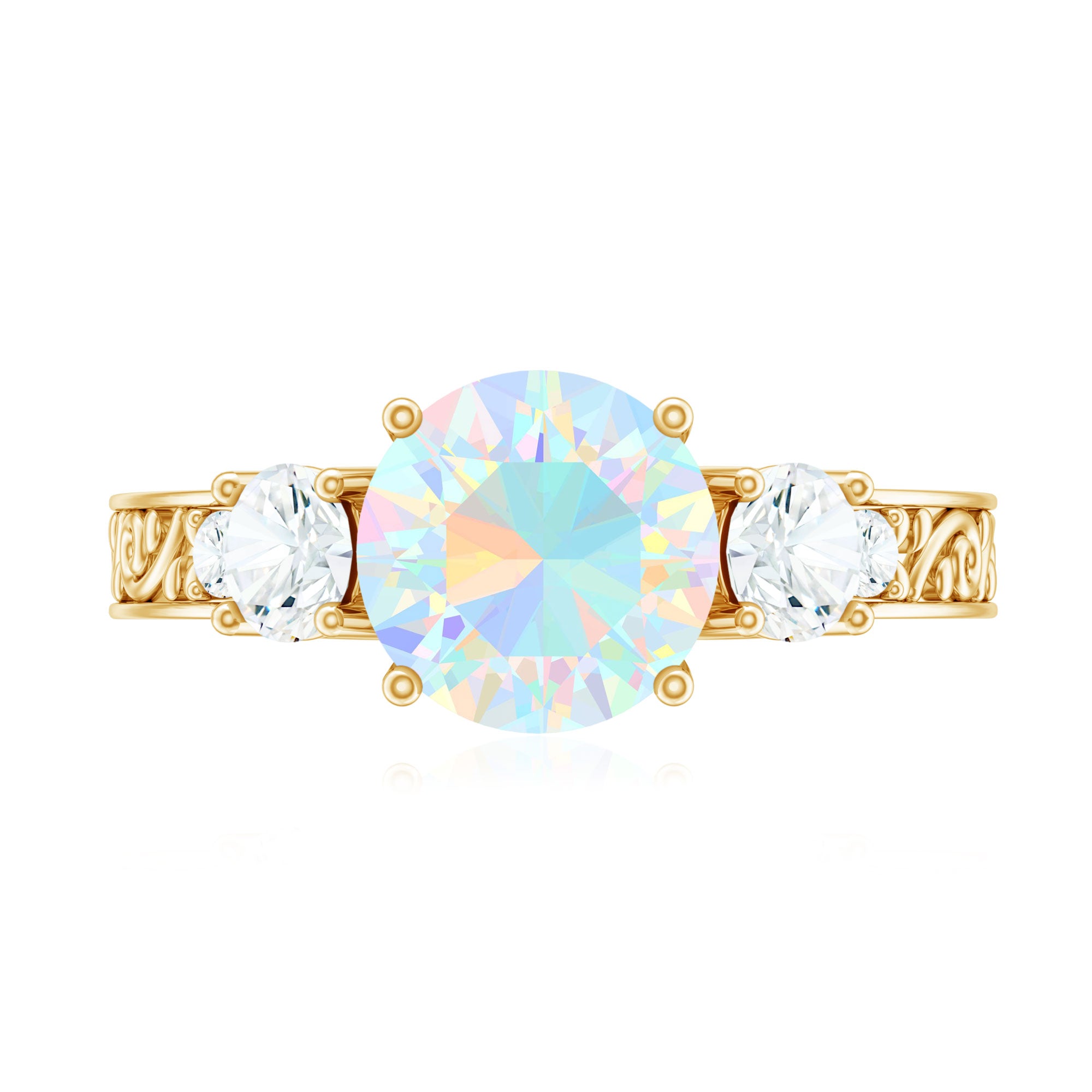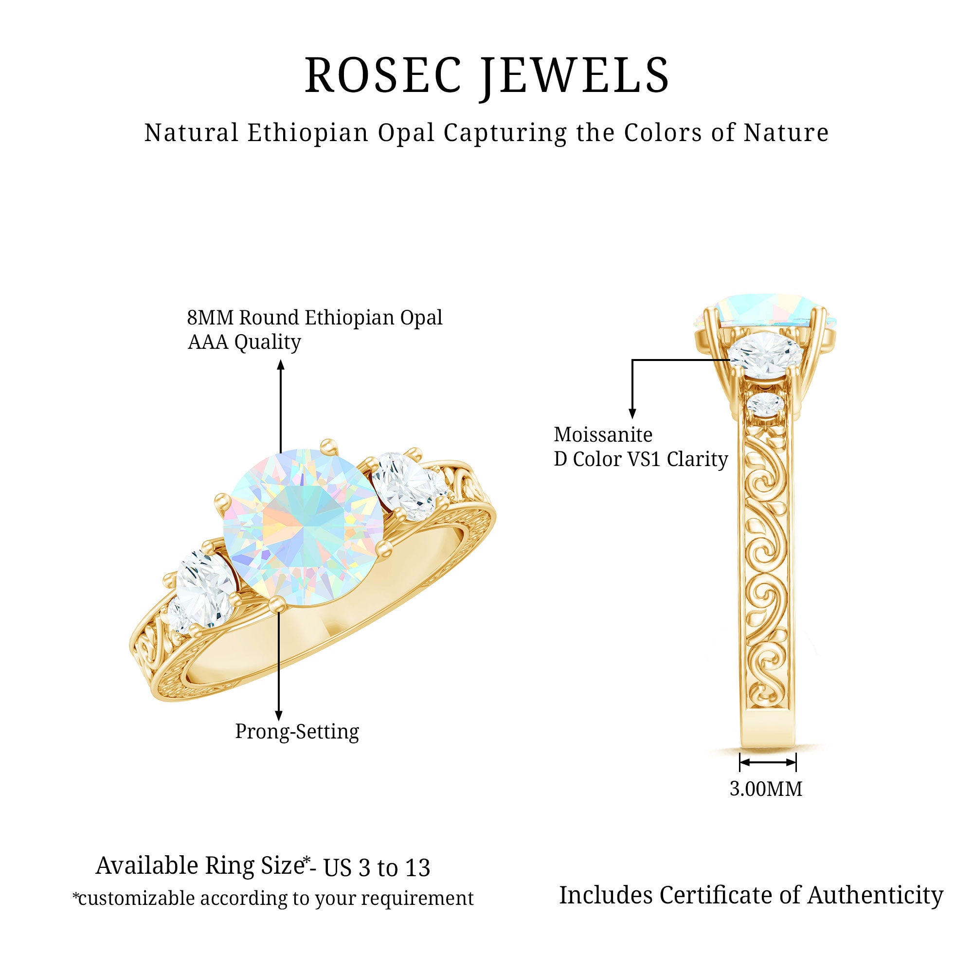 This 3 Stone Engagement Ring beautifully captures something timeless about a love that grows stronger with every chapter. At the center, a glowing 8 mm Round Shape Ethiopian Opal shimmers with ethereal color, flanked by sparkling Moissanite stones that symbolize your shared past, vibrant present and the limitless future ahead. Set on a delicately engraved band with dainty Moissanite stones, every curve and detail of this Opal Engagement Ring feels like a poetic promise. Once slipped onto the finger, this Past Present Future Ring brings a graceful, radiant charm, instantly elevating the hand with a soft, romantic glow that draws eyes and sparks conversation. Designed to fit like a dream, this Real Opal Ring for Engagement comes in a variety of ring sizes so your perfect moment gets the perfect fit. Whether you are proposing, celebrating or simply honoring your journey together, this Rainbow Opal Ring is a symbol of forever, beautifully told in stone and sparkle.