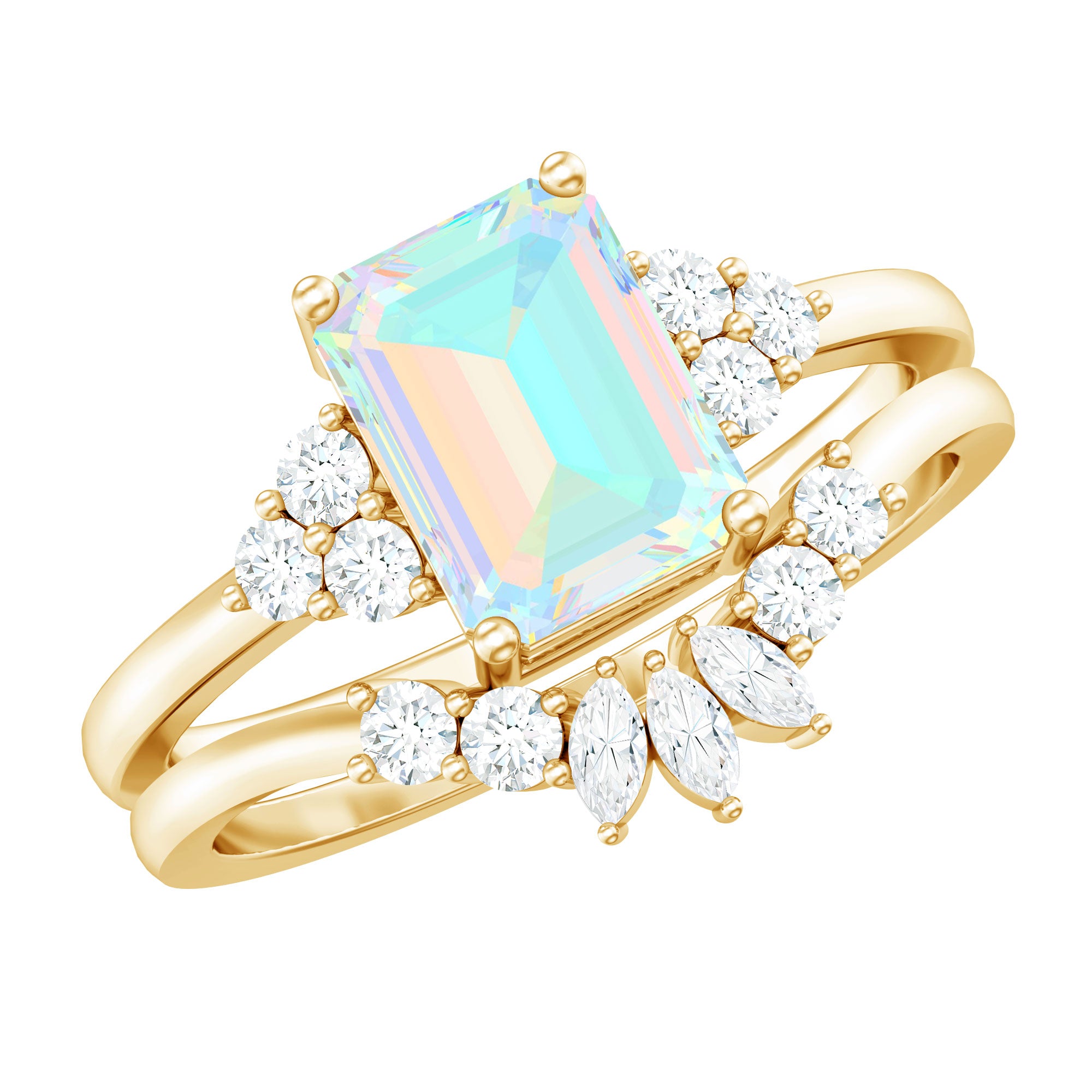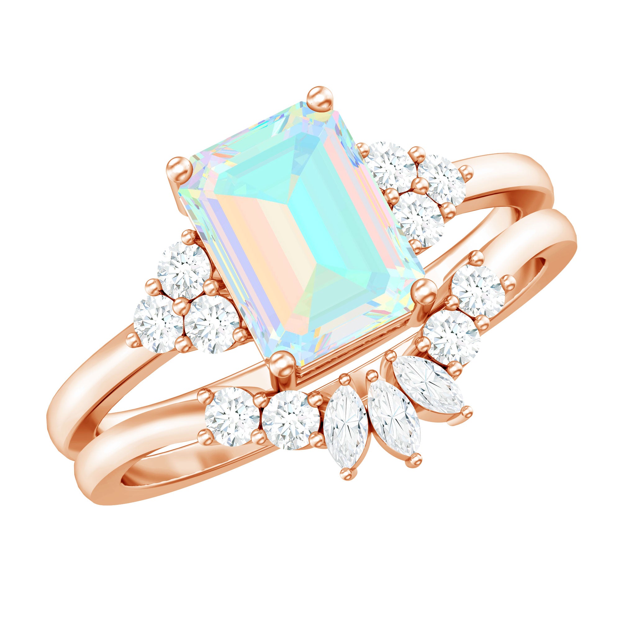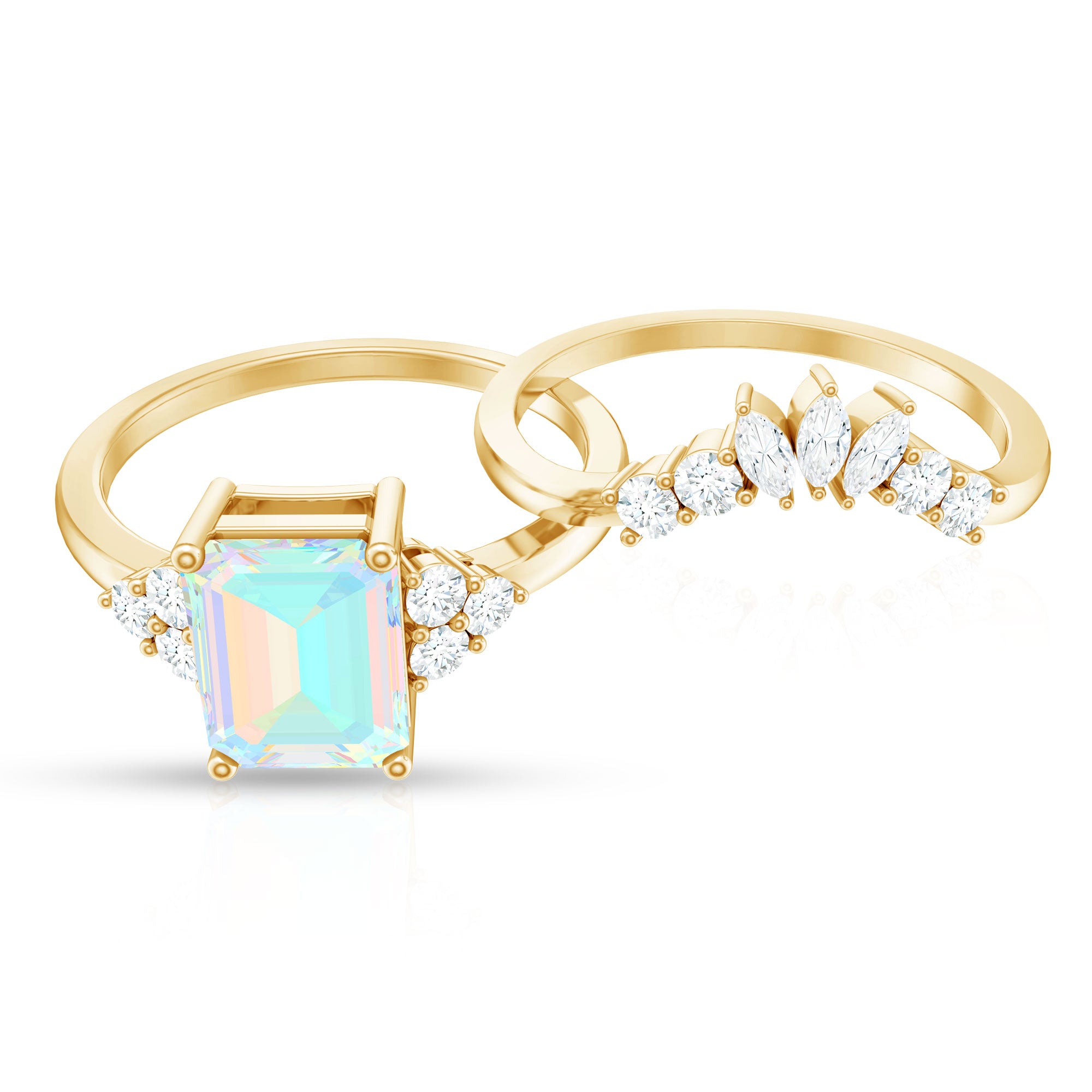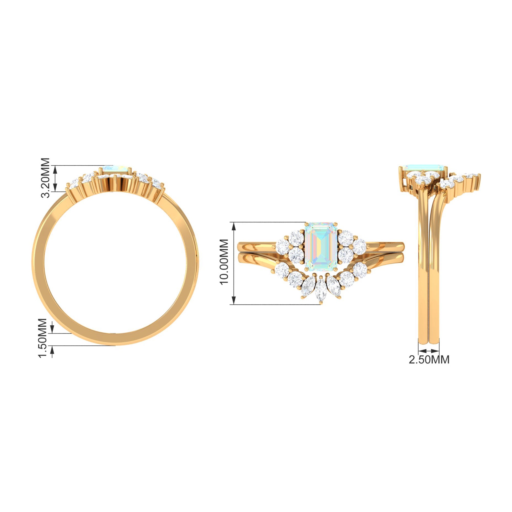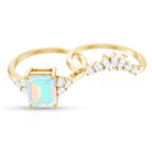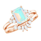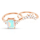 Say forever with the brilliance and bold beauty of this Wedding Bridal Ring Set, a breathtaking set designed to shine from every angle. At the center of the captivating Solitaire Engagement Ring of this 2 Piece Ring Set sits a 6X8 mm Emerald Cut Ethiopian Opal, glowing with a kaleidoscope of iridescent hues that symbolize hope, passion and an ever-evolving love. Flanked by the Diamond trio, the Emerald Cut Engagement Ring beautifully represents your love. Paired with a perfectly Curved Diamond Enhancer Band, this Wedding Engagement Ring Set creates a seamless, radiant design that hugs the center ring with graceful brilliance. Ideal for the bride who craves elegance with a touch of ethereal charm, this Opal Engagement Ring with Wedding Band is a perfect fusion of tradition and modern magic. Available in multiple ring sizes for a flawless fit and delivered in a signature jewelry box, this Engagement and Wedding Ring Set is proposal-ready and destined to be treasured for generations.