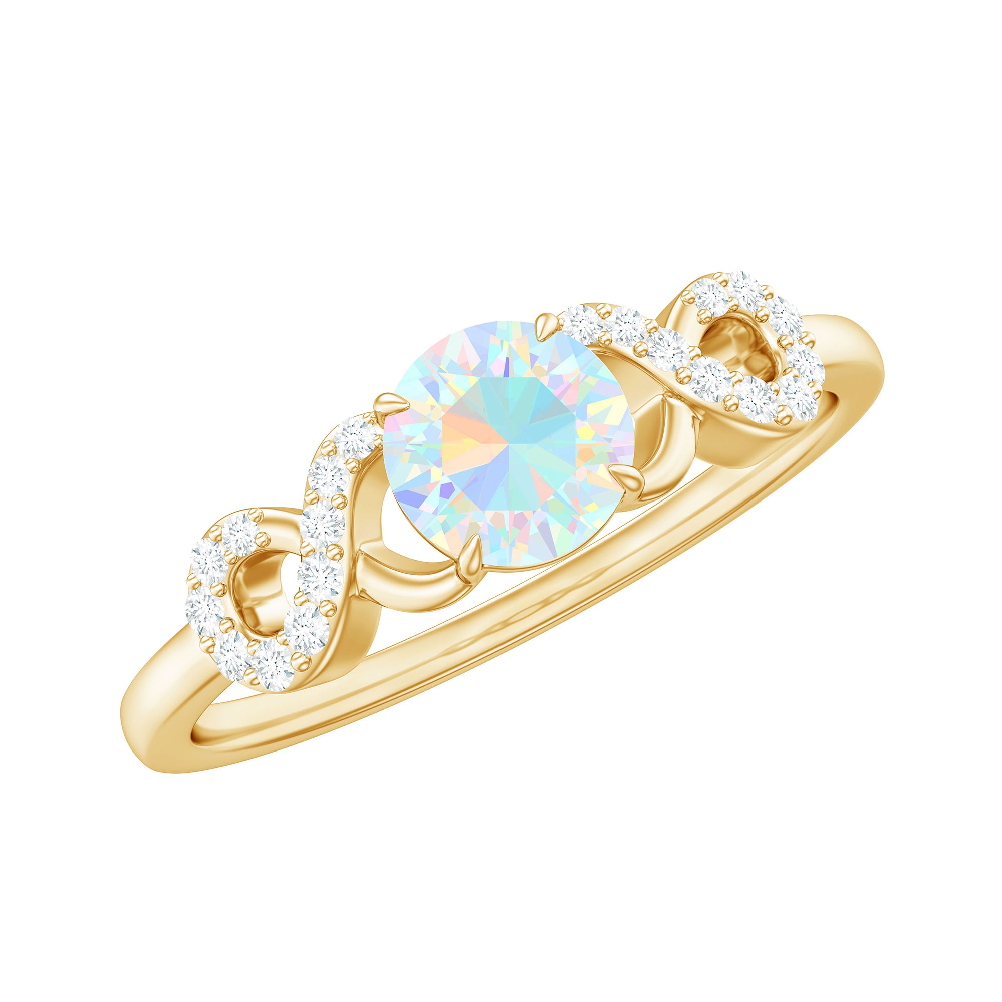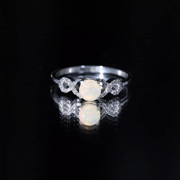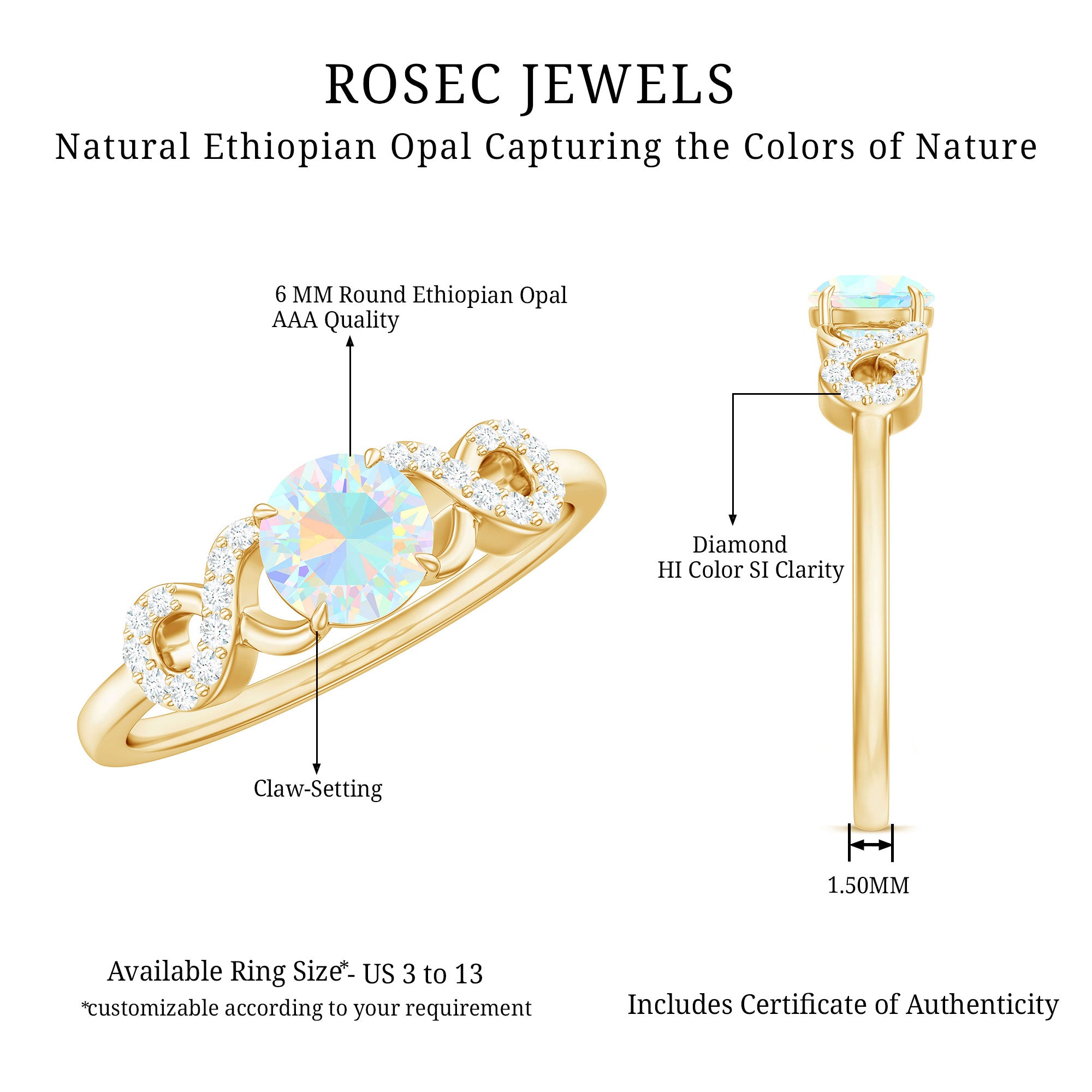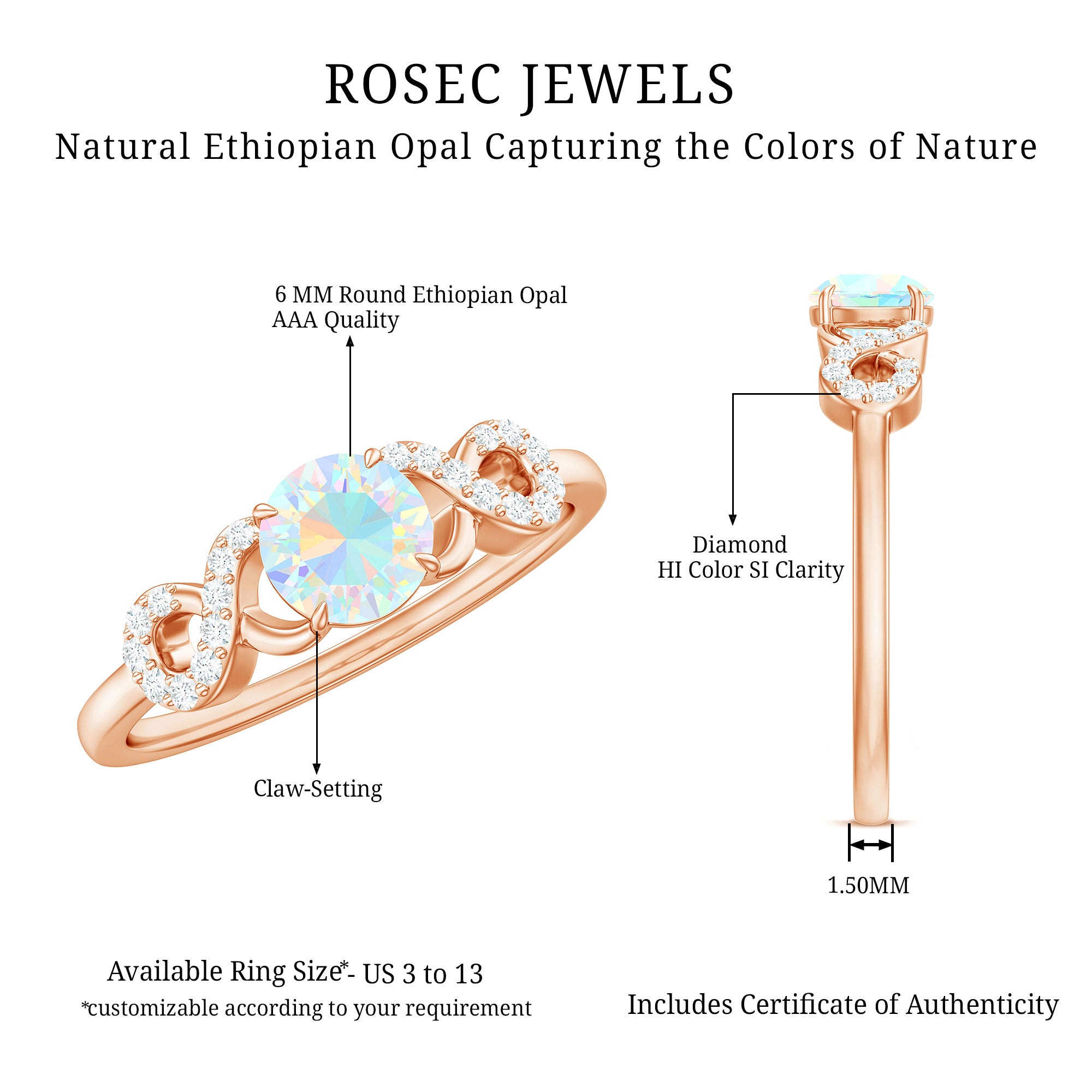 Elevate your love story with this Rainbow Opal Engagement Ring, a true masterpiece of color and elegance. At its center lies a captivating 6 mm Round Shape Ethiopian Opal that creates a mesmerizing effect. The Opal is complemented by a stunning Criss Cross shank, adorned with sparkling Diamond stones that add a touch of brilliance and sophistication, wrapping your love in a glow that is impossible to ignore. The Criss Cross design symbolizes the intertwining of two lives, making this Opal Diamond Engagement Ring a perfect representation of unity, passion and timeless commitment. Whether you are proposing or marking a milestone, this Criss Cross Ring speaks to the heart with both beauty and meaning. This Ethiopian Opal Ring arrives in a signature jewelry box, ready to make an unforgettable impression. Available in a range of sizes for the perfect fit, this Real Opal Engagement Ring is a celebration of love that transcends time, radiating every color of your shared journey together.