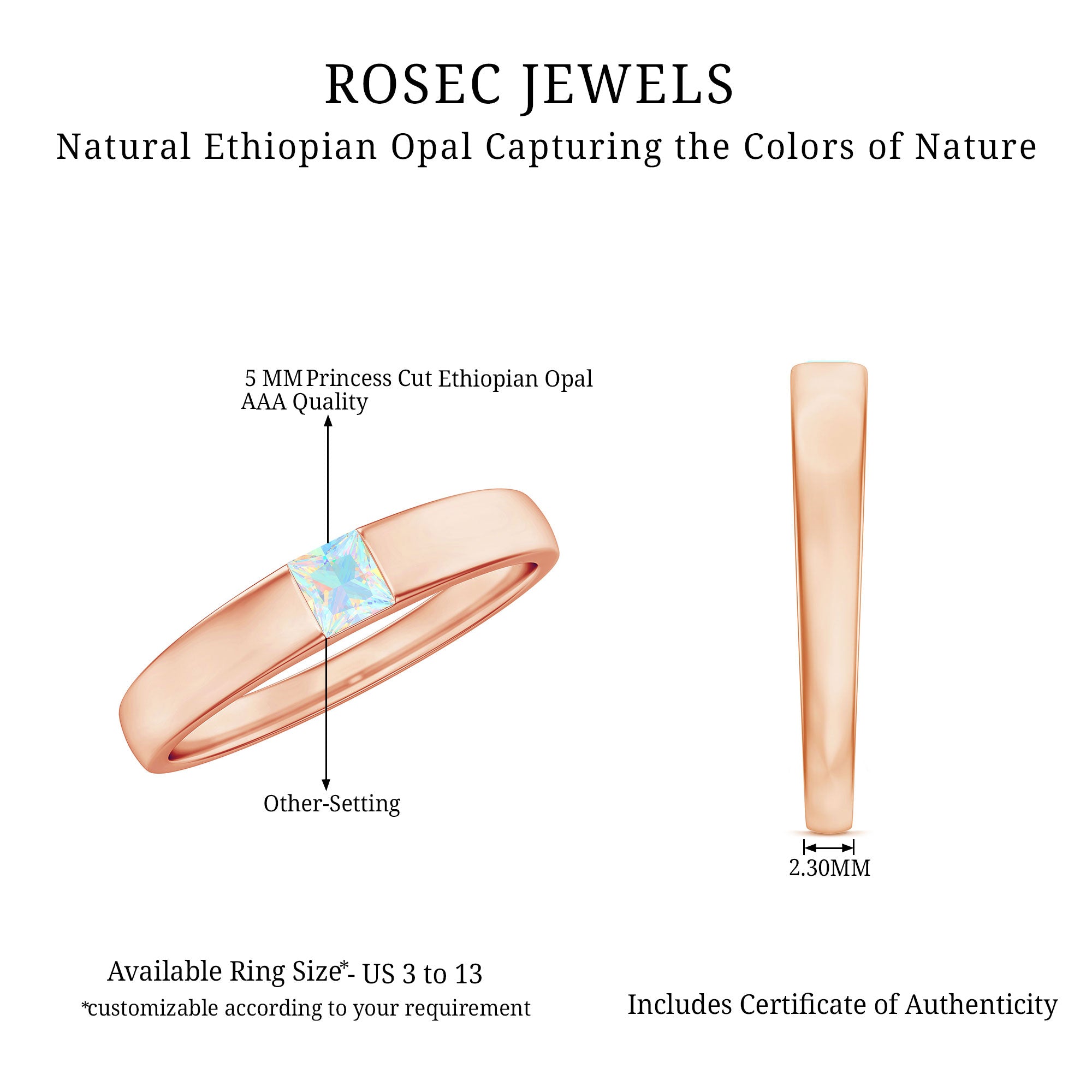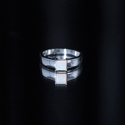 The Certified Real Ethiopian Rainbow Opal Princess Cut Engagement Ring offers a bold alternative to traditional center stones. Featuring a princess cut opal, this design combines structured geometry with the natural play of color that makes rainbow opal uniquely expressive.