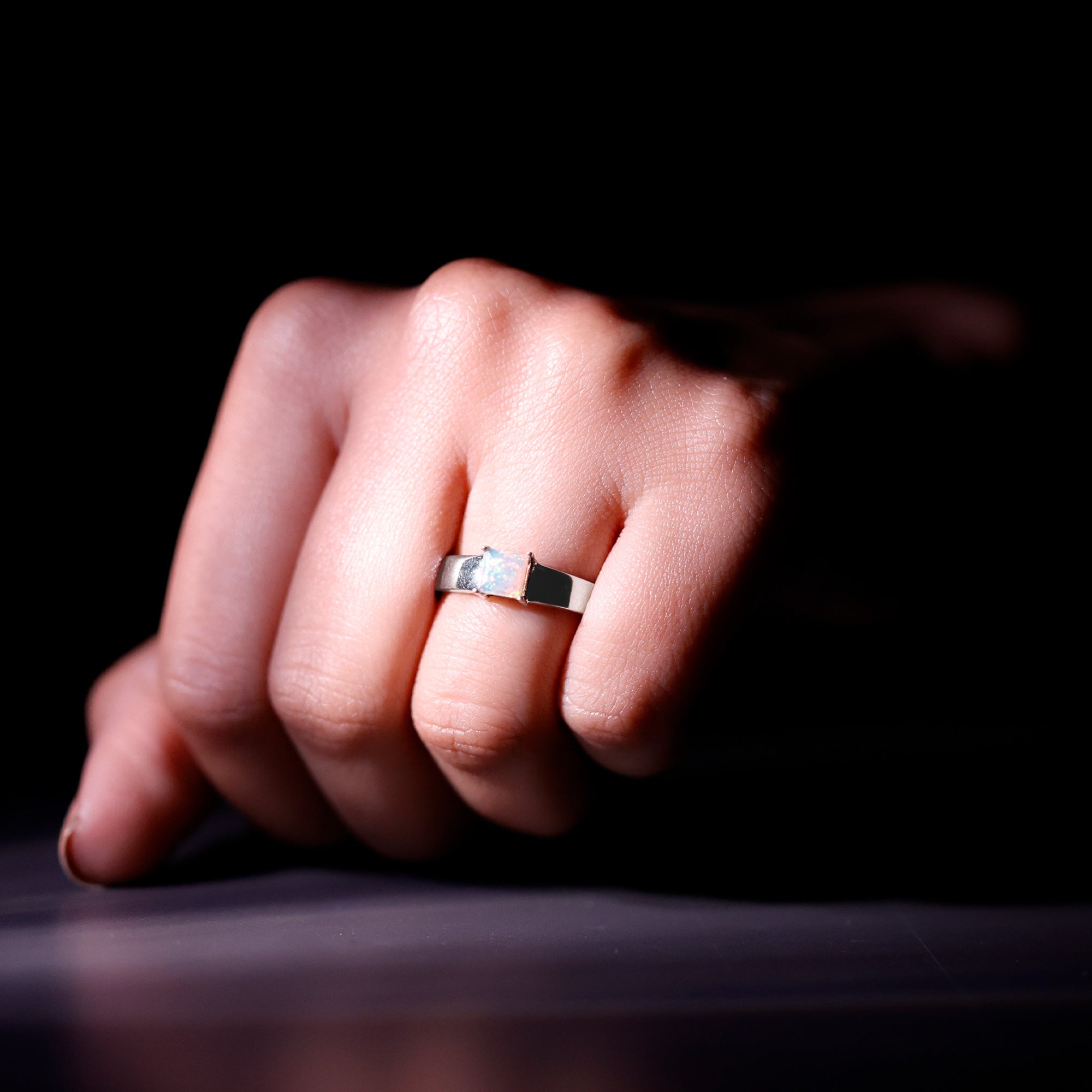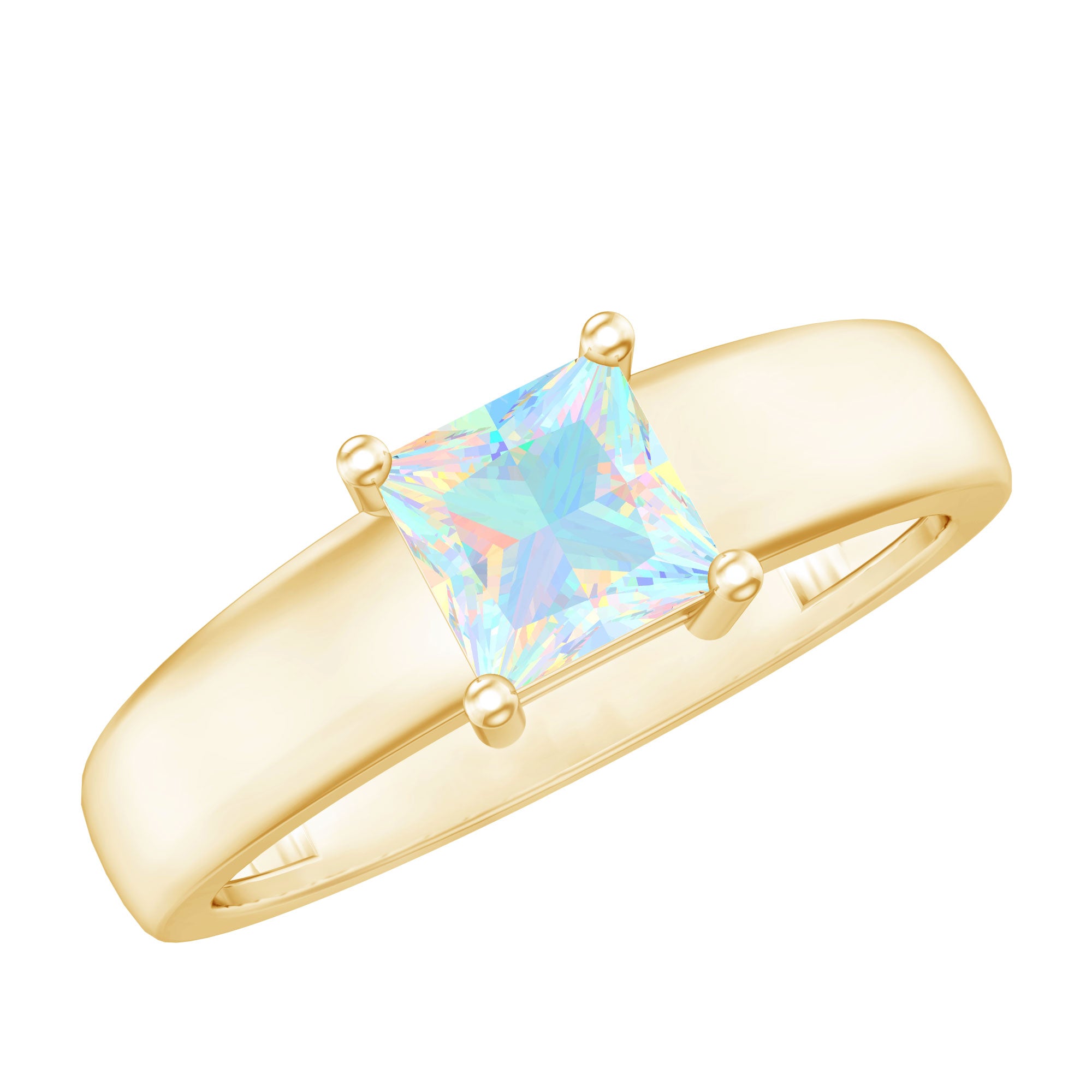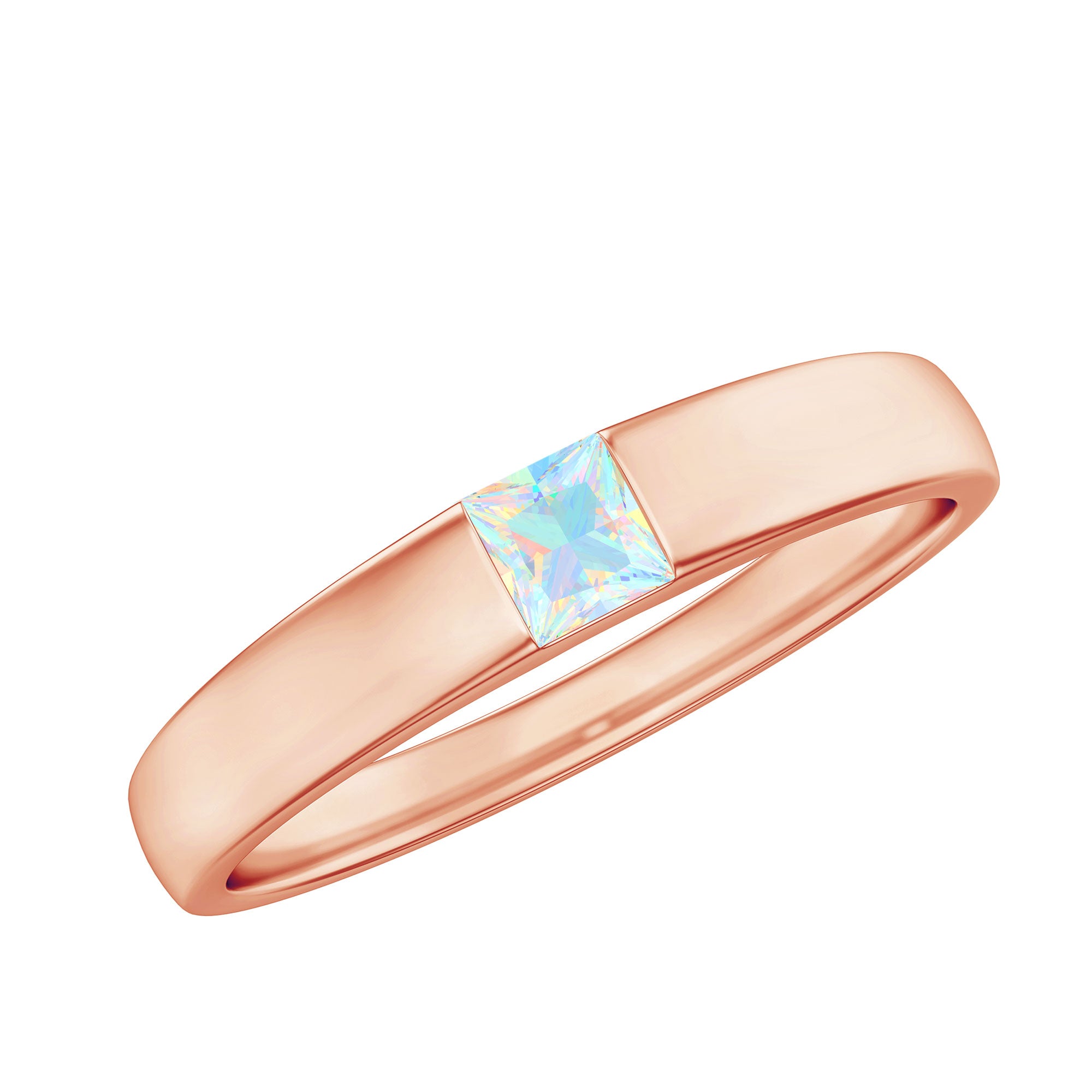 The princess cut is defined by its clean square shape and sharp, symmetrical lines. This structured silhouette creates a contemporary look while highlighting the internal color movement of the opal. The setting is crafted to secure the center stone while maintaining a balanced profile suitable for engagement wear.
