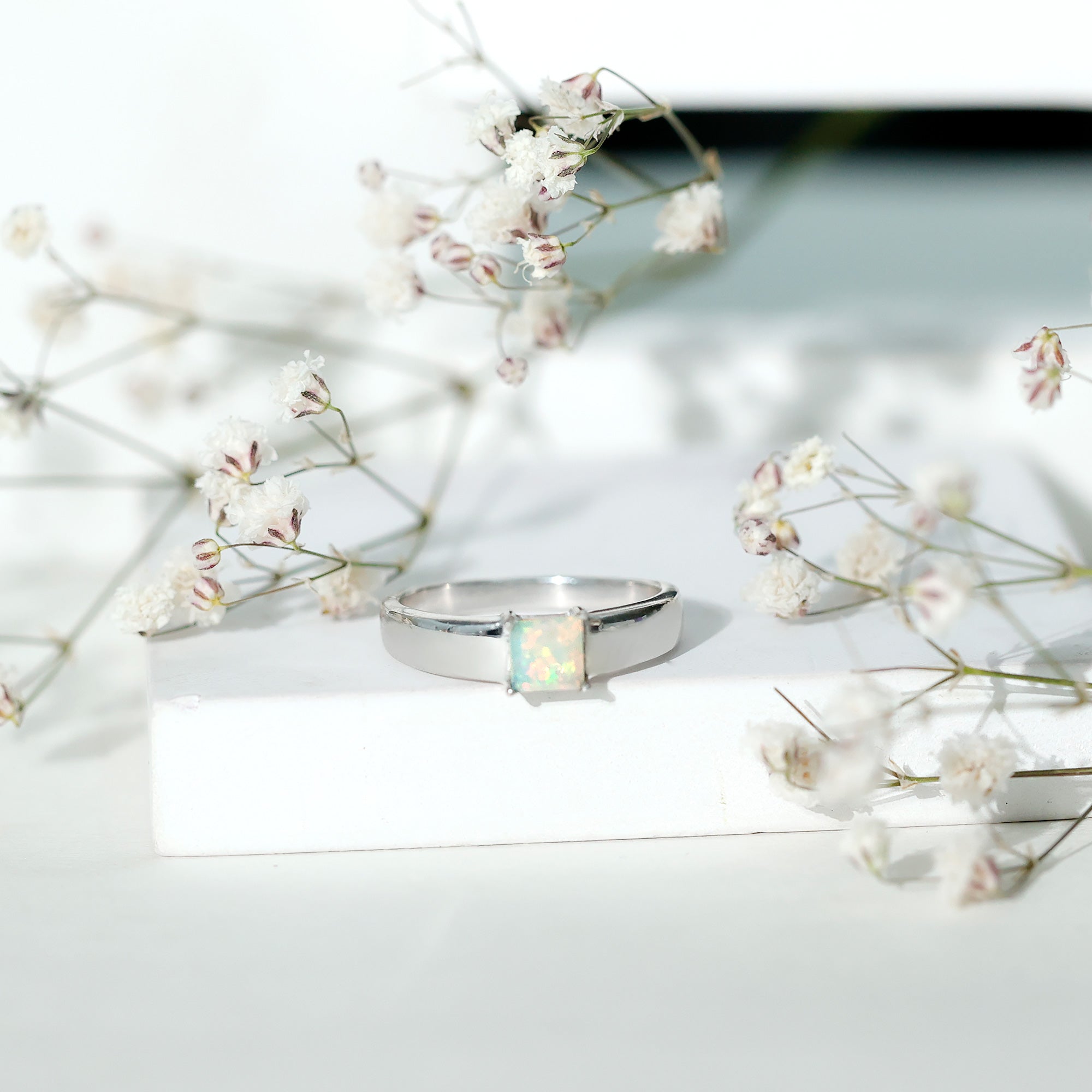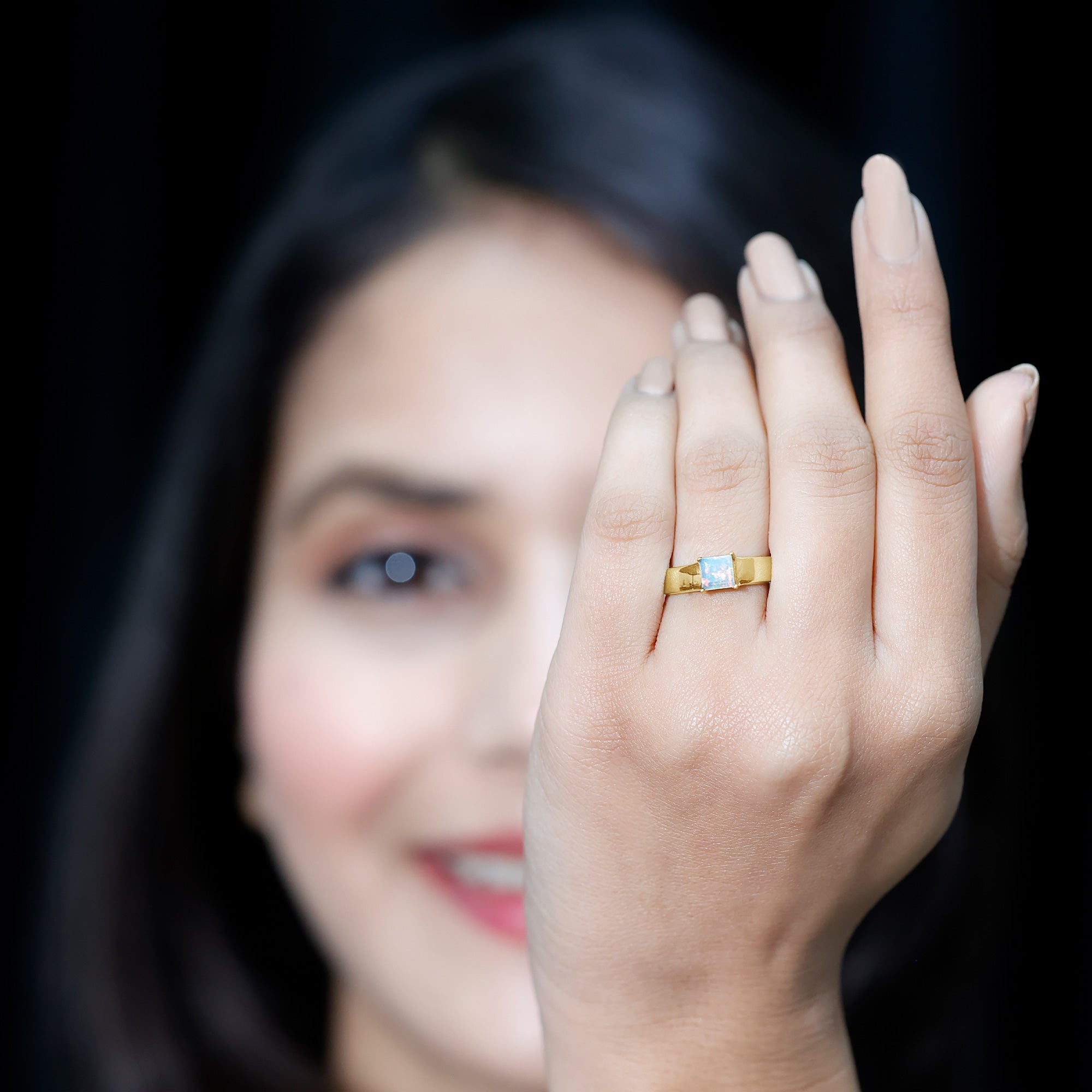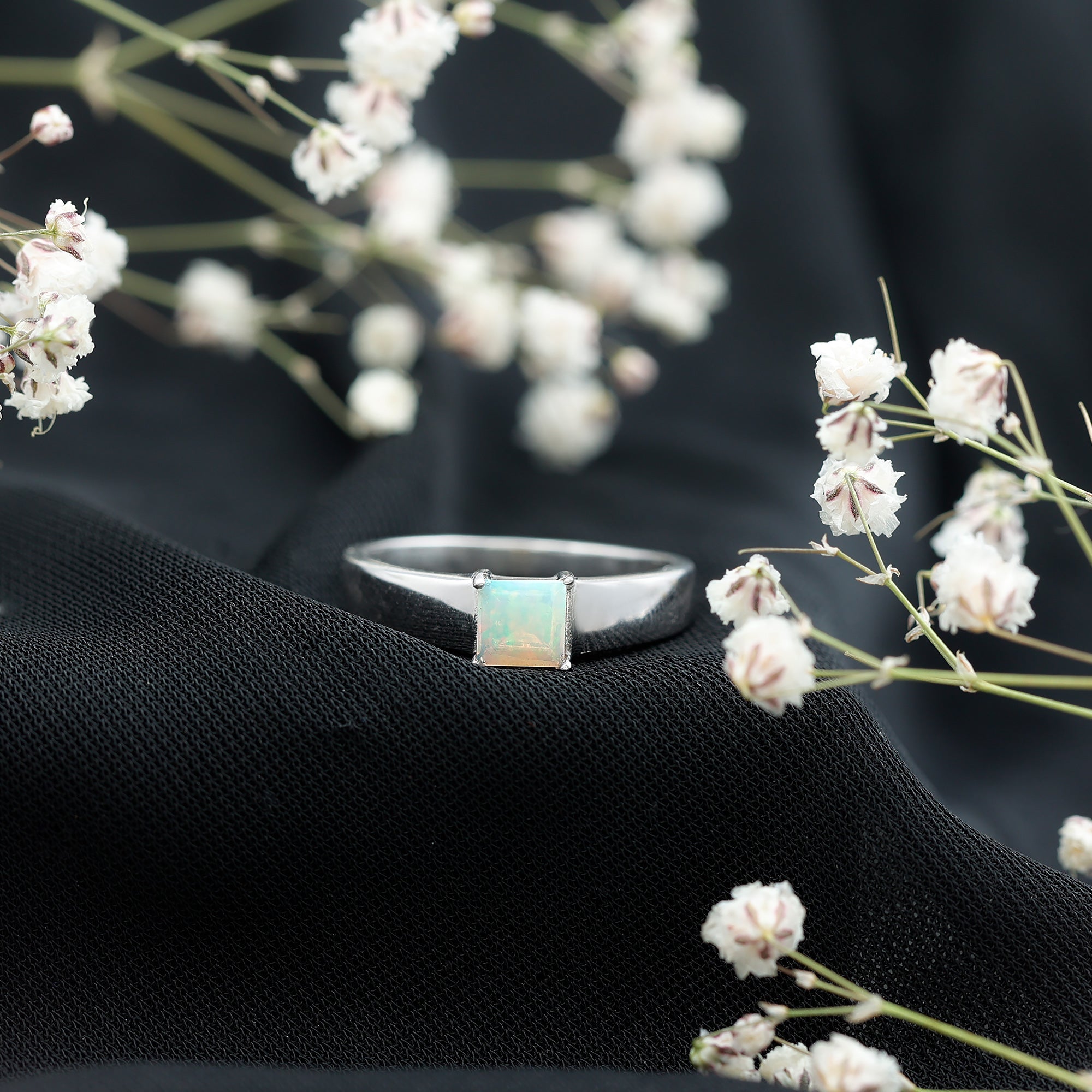 The princess cut is defined by its clean square shape and sharp, symmetrical lines. This structured silhouette creates a contemporary look while highlighting the internal color movement of the opal. The setting is crafted to secure the center stone while maintaining a balanced profile suitable for engagement wear.