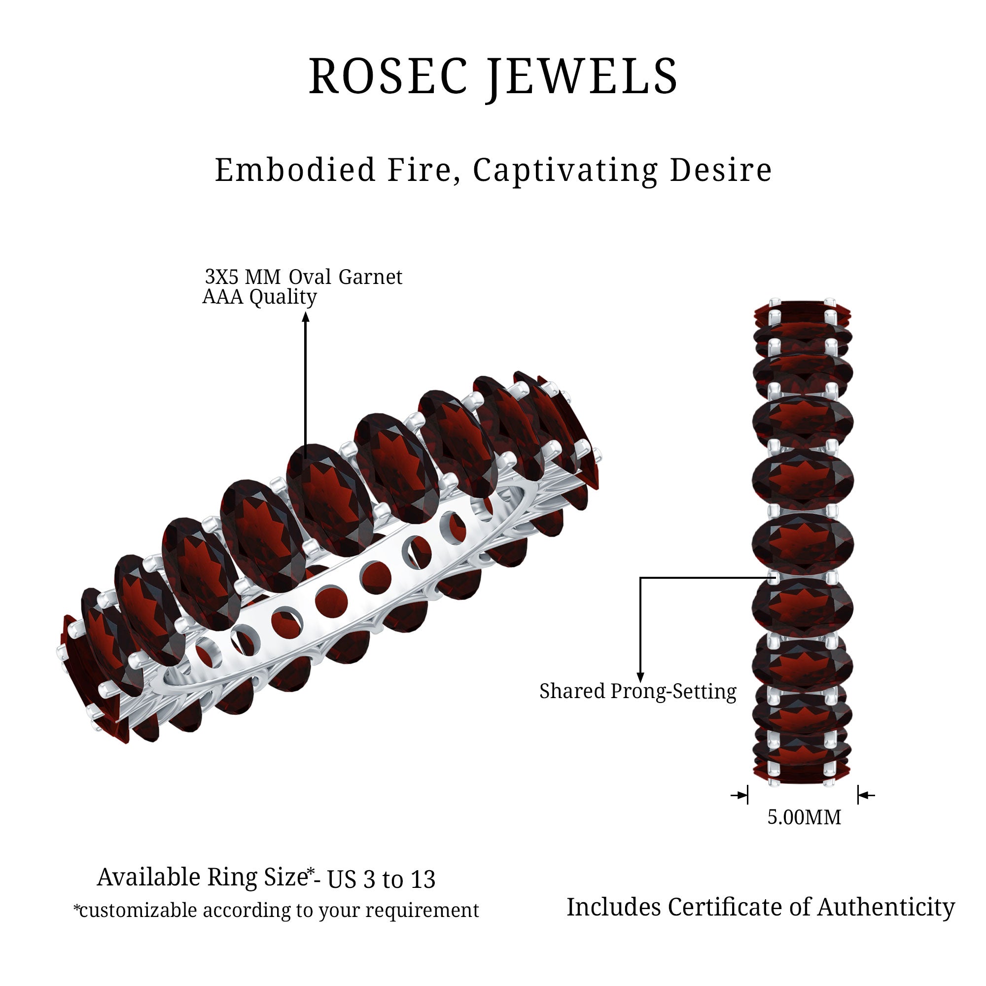 Crafted with love and timeless elegance, this Garnet Eternity Ring is a stunning tribute to enduring romance. Each 3X5 mm Oval Shape Garnet gemstone set in Shared Prong Setting encircling the band radiates a deep, passionate red, capturing the warmth and devotion of a love that only grows stronger with time. The continuous line of gemstones symbolizes an unending bond, making this Oval Garnet Ring is the perfect choice for anniversaries, milestones or simply as a beautiful reminder of your eternal connection. The refined design balances classic sophistication with a modern touch, ensuring this Oval Eternity Ring shines effortlessly on any hand. Whether worn alone to make a subtle yet striking statement or stacked with other rings to create a personalized look, this Red Garnet Ring adds a spark of romance to every moment. Delivered in a signature jewelry box, this Full Eternity Ring is ready to gift and to become a cherished keepsake. Available in various US ring sizes, the Garnet Birthstone Ring is a heartfelt expression of commitment and love that never fades.