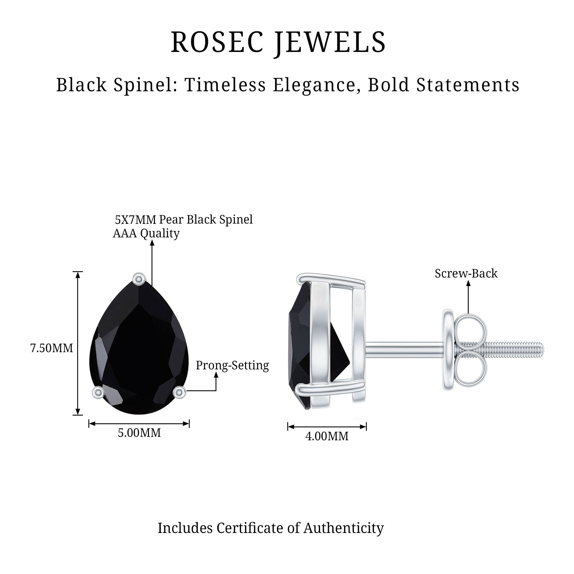 A perfect choice to enhance your everyday look, these Black Spinel Earrings bring a touch of understated elegance and bold sophistication. These Solitaire Stud Earrings feature 5X7 mm Pear Shape Black Spinel set in 3 Prong Setting, offering a modern twist on classic beauty. Their teardrop design is both timeless and trendy, making them the ideal accessory to wear from day to night. The Screw Back Closure ensures a secure and comfortable fit, so you can wear them with confidence wherever you go. Whether you are dressing up for a dinner date, a special event or simply elevating your everyday style, these Pear Shaped Earrings are versatile enough to complement any outfit. The elegant Black Spinel adds a refined pop of dark sparkle, making them perfect for pairing with everything from casual looks to evening attire. Beautifully packaged in a jewelry box, these August Birthstone Earrings are ready to gift for birthdays, anniversaries or as a thoughtful surprise. These Teardrop Stud Earrings are designed to make every day feel a little more glamorous.