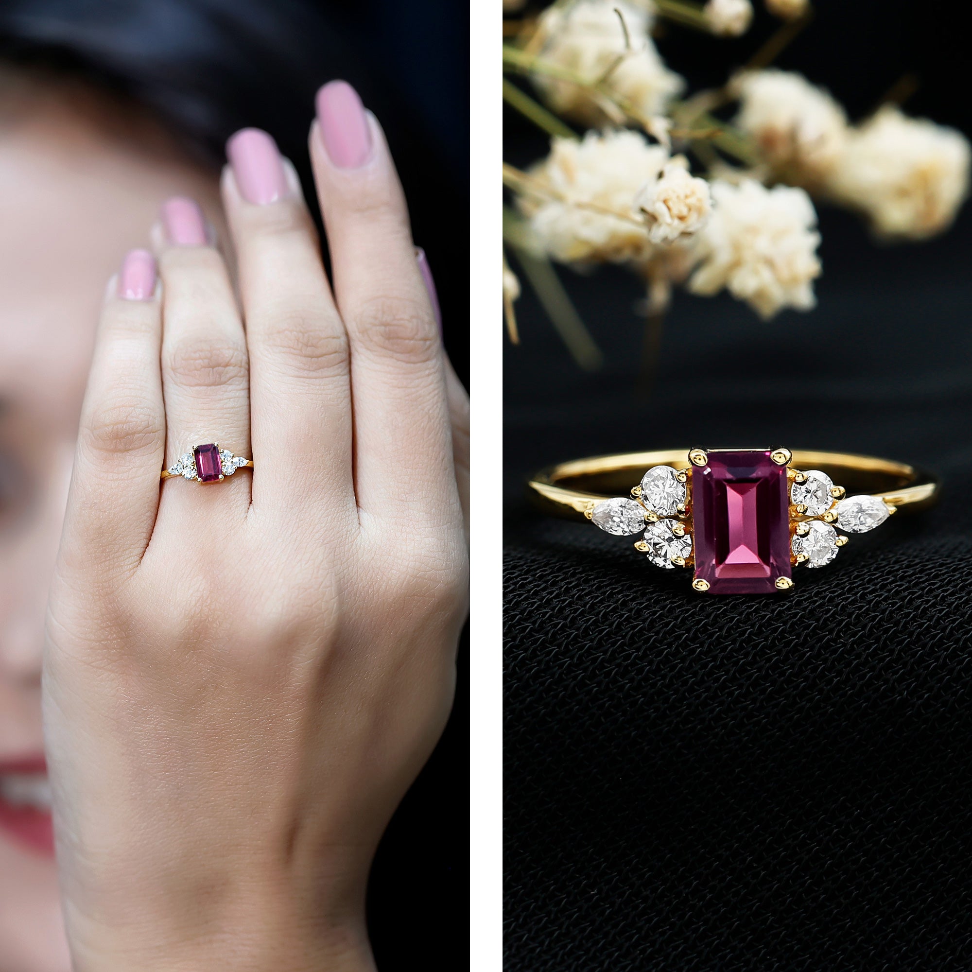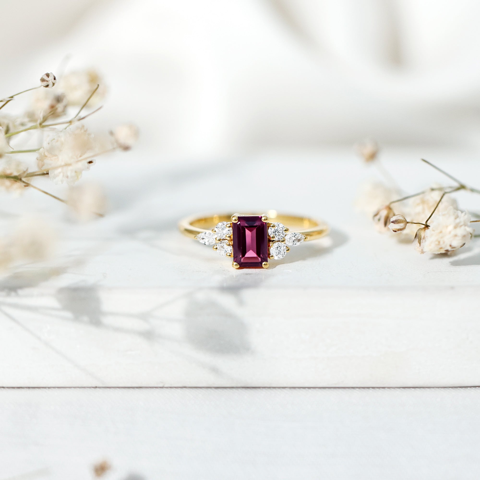 Crafted to leave a lasting impression, this Rhodolite Garnet Engagement Ring captures timeless sophistication. Crafted in 14K yellow gold plated silver, this Promise Engagement Ring is a perfect balance between classic style and modern elegance. The centerpiece features a 4X6 MM emerald cut rhodolite set in a secure prong setting. On both sides of the center stone, you will find a trio of sparkling round and marquise cut lab grown diamonds that add just the right amount of shine without being over the top. Whether you are looking for an Alternative Engagement Ring, a meaningful promise ring, or just a beautiful piece to celebrate a special moment, this ring fits the moment. It is a wonderful choice for someone who appreciates subtle beauty, detailed craftsmanship, and jewelry that tells a story. Comfortable to wear and easy to pair with other pieces, this Emerald Cut Ring is more than just a piece of jewelry, it is a reflection of style, sentiment, and thoughtful design. Whether you are treating yourself or gifting it to someone special, this Rhodolite Ring is a lasting peace that will always feel timeless.
