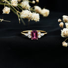 Certified Rhodolite Emerald Cut Engagement Ring with Diamond Trio