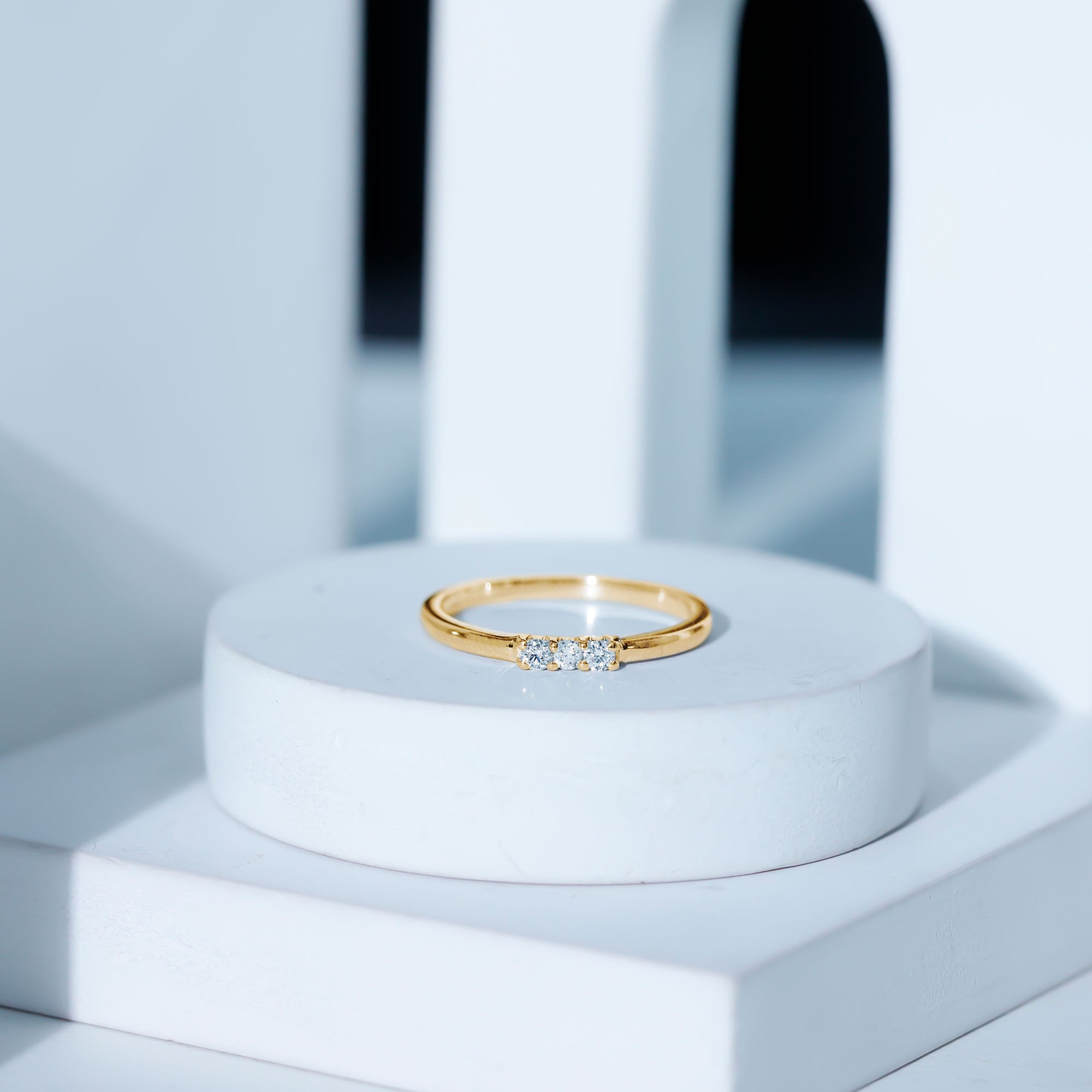 This eye-catching and subtle piece of the Diamond Stackable Ring is an expression of undying love and affection. If she is the one who loves timeless and dainty pieces of jewelry, then surely this Diamond 3 Stone Ring is an ideal choice to surprise her on her special day. This Minimalist Ring is adorned with three Round Shape Diamond sitting elegantly in the center, secured in the Prong Setting. Add beauty to your stacking look with this sophisticated Diamond Promise Ring. You can also wear it alone also for showcase your love for simple and cute jewelry pieces. This Proposal Ring beautifully encapsulates the past, present, and future of your relationship within a single design. It is a beautiful way to express your promise, whether it is for a special occasion or just to show your feelings. With its versatile design, this 3 Stone Promise Ring features a minimalist look, making it an ideal commitment ring, a birthday gift, or a daily accessory.