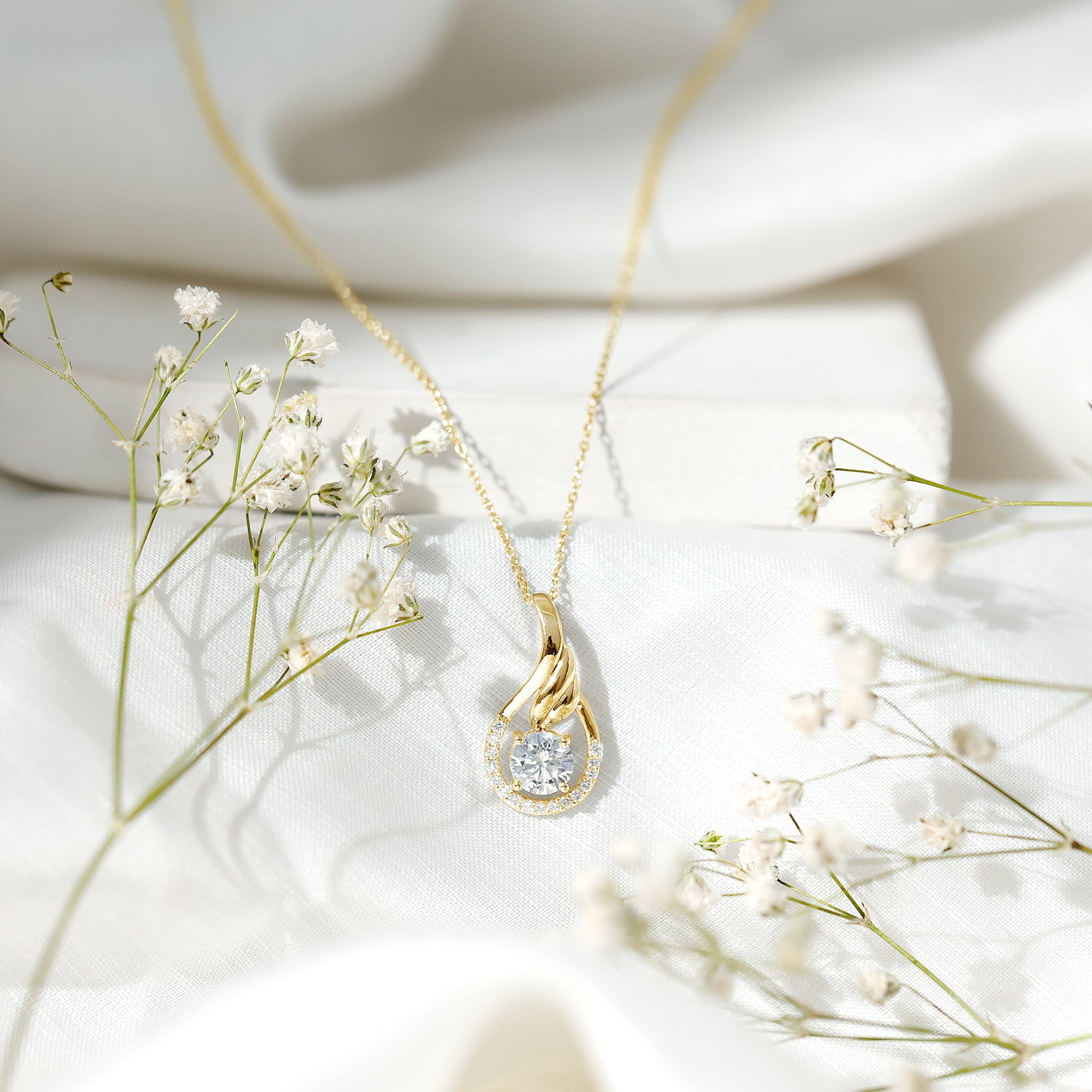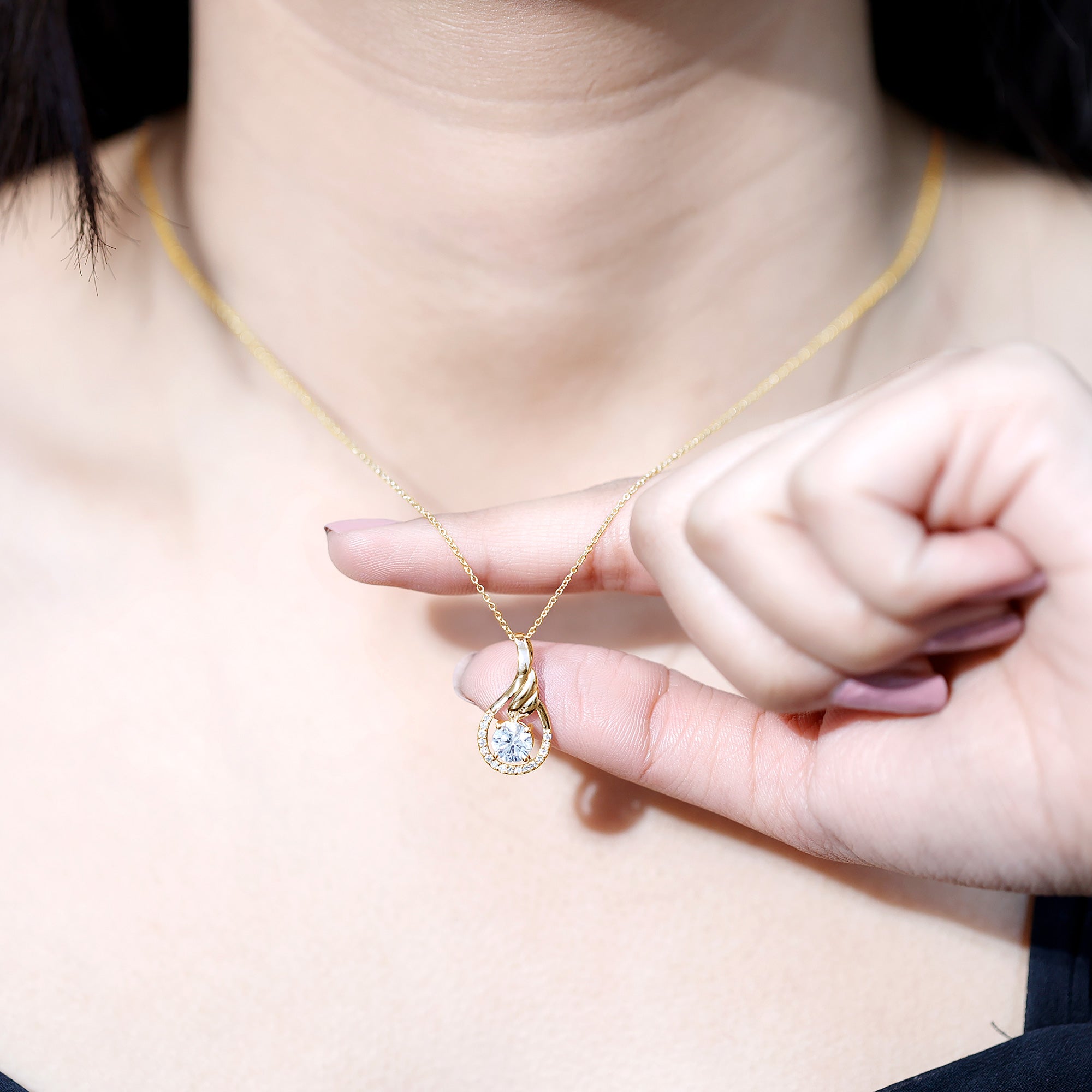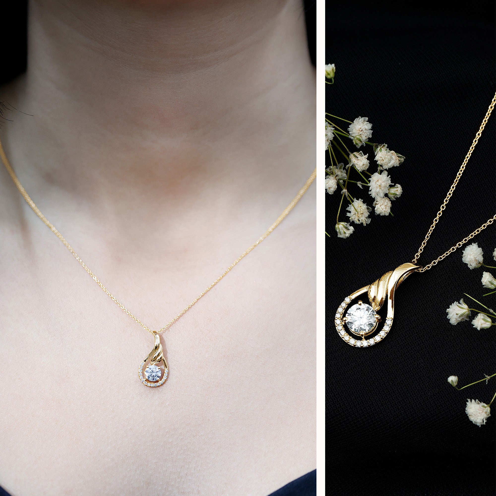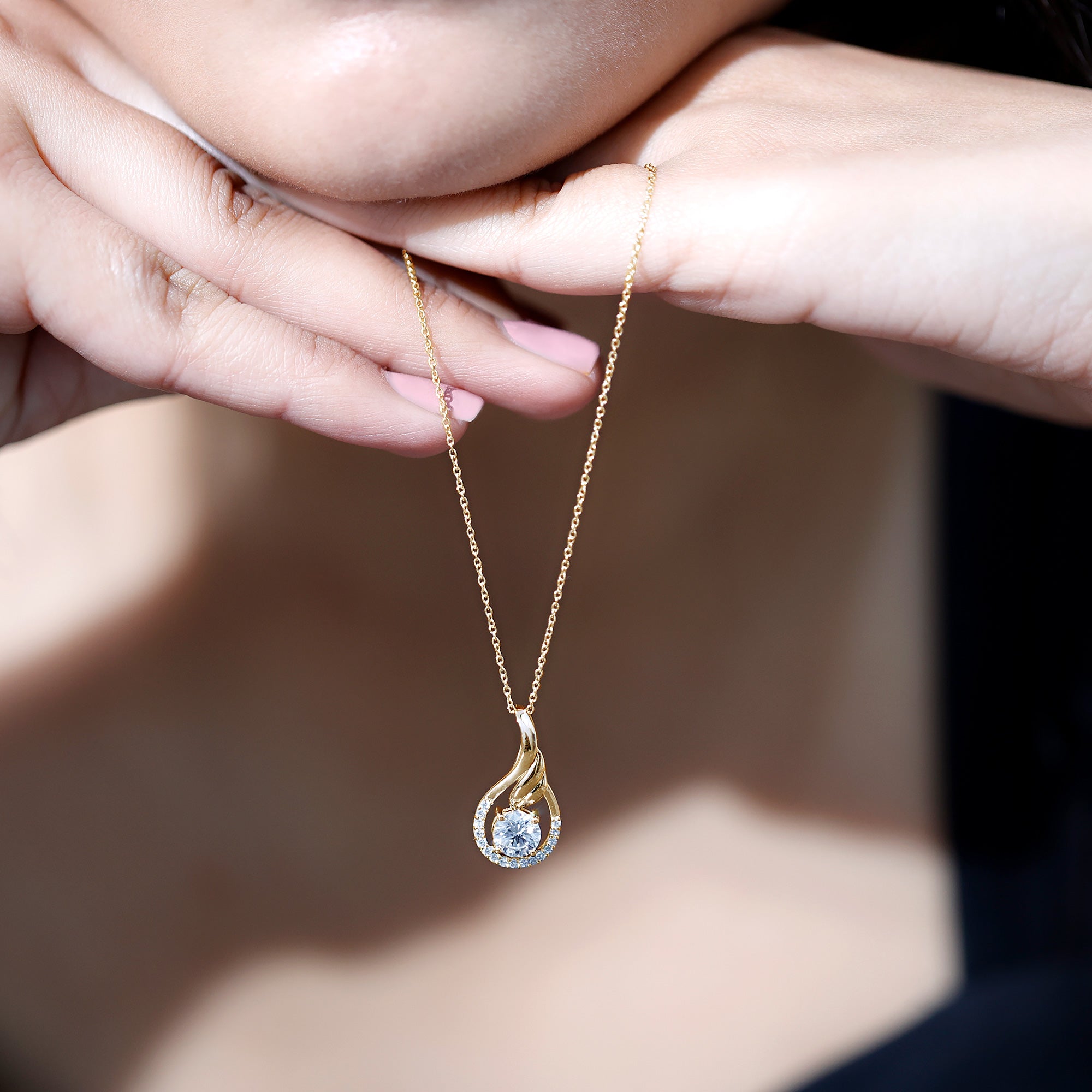 Adorn your neckline by wearing this Minimal Diamond Pendant Necklace. This captivating Teardrop Pendant Necklace is adorned with a 6 mm Round Shape Diamond of Ef-Vs quality set in prong setting in the center, the Drop Pendant is further beautified with dainty lab grown diamonds and features a delicate leaf motif. The minimalist design exudes timeless charm, making this April Birthstone Necklace a versatile accessory for any occasion like - anniversaries, birthdays, and Valentines Day. Elevate your look with this enchanting Man Made Diamond Necklace from Rosec Jewels, where sophistication meets conscience.