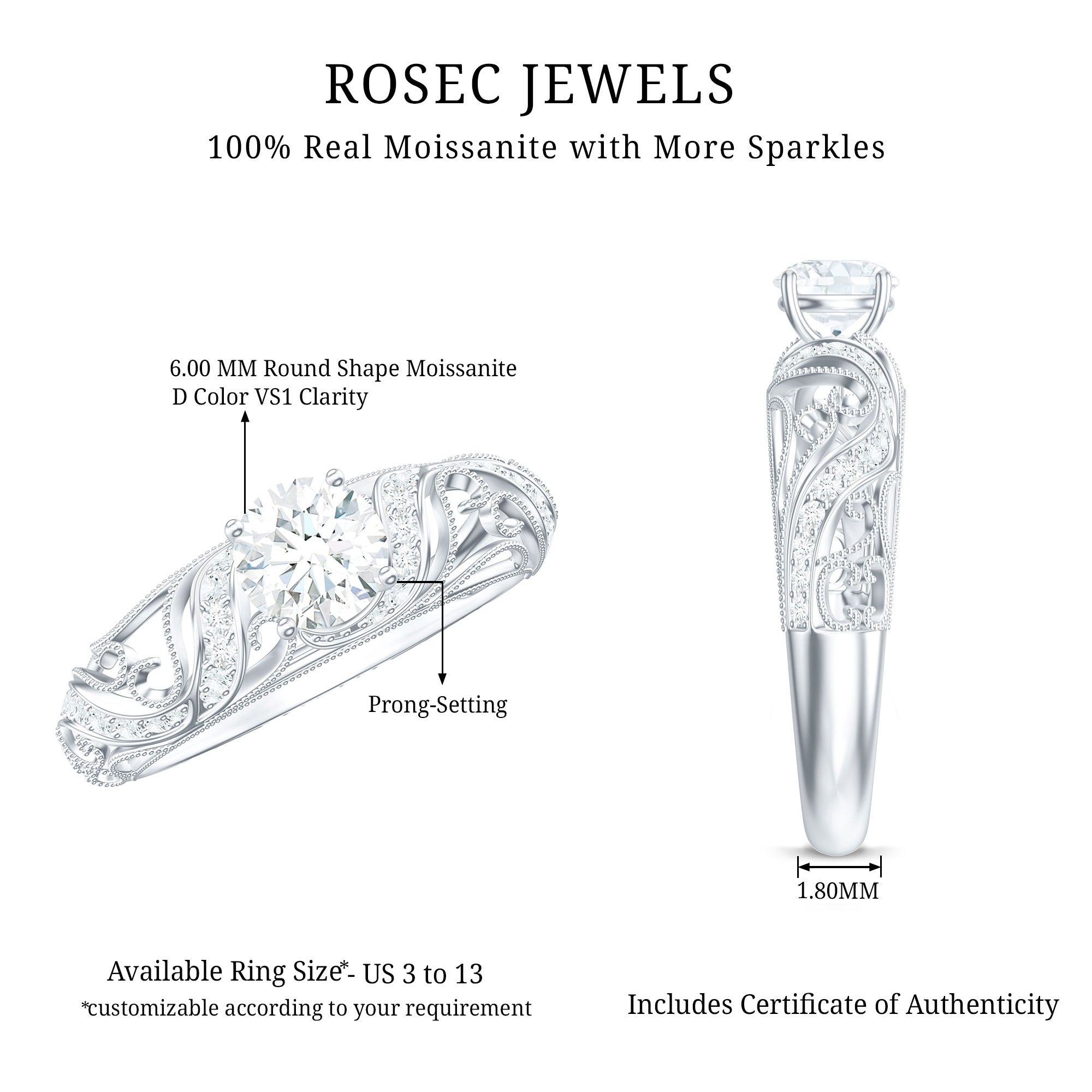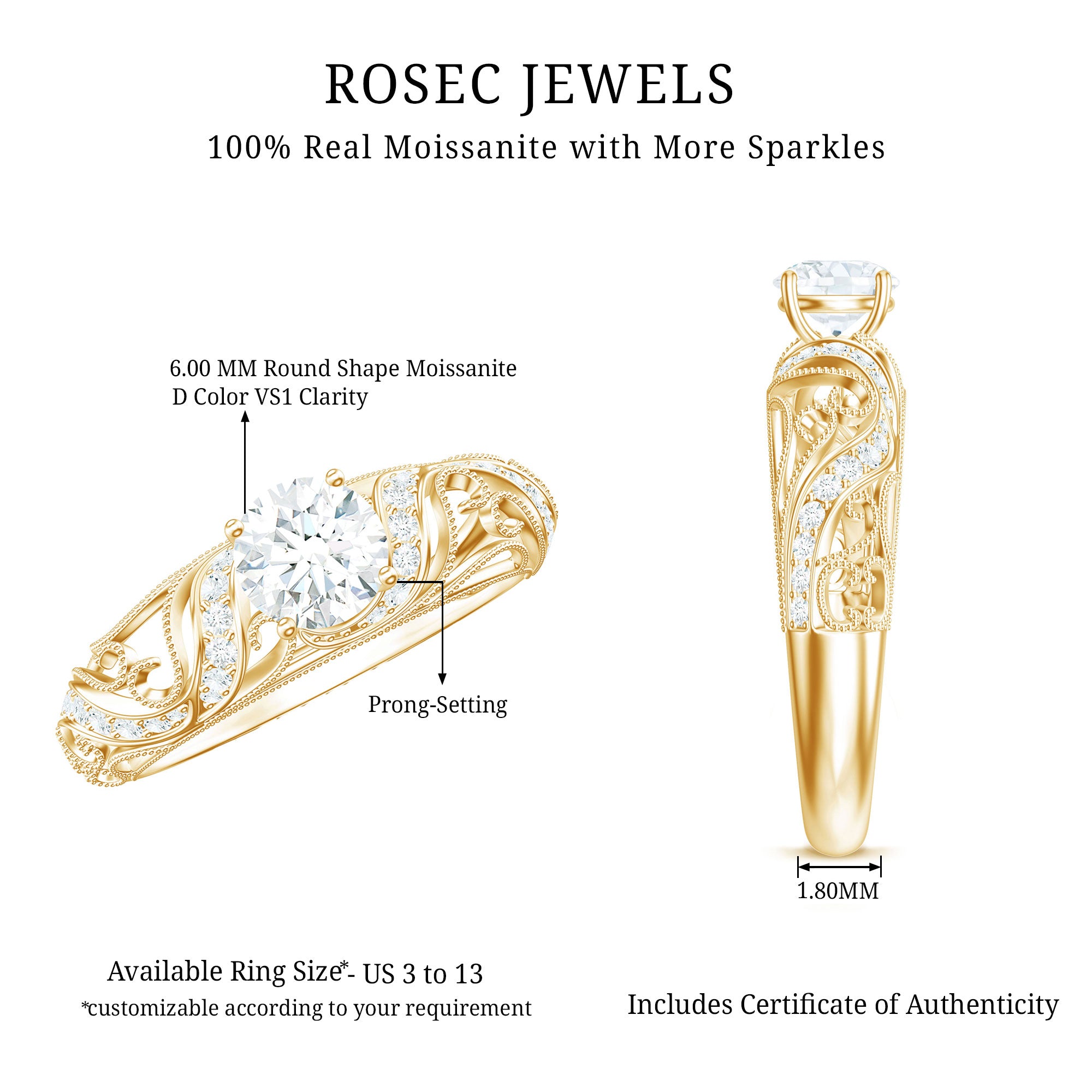 Celebrate every moment with the most beautiful and precious Vintage Inspired Moissanite Engagement Ring, a timeless piece of jewelry that will never go out of style. The 6 mm Round Shaped Moissanite in Prong Setting sits beautifully in the center and on the ivy scroll shank with beaded details of the Art Deco Engagement Ring making it the most gorgeous one that will always set you apart. This Retro Engagement Ring is ideal for an engagement day, wedding or commemorating any special occasion. Whether you are saying yes for the first time or renewing your vows, this Vintage Moissanite Ring is a celebration of your unique love story capturing timeless elegance and radiant brilliance. Elevate your forever with this D Color Vs1 Clarity Moissanite that is as beautiful and enduring as your love.