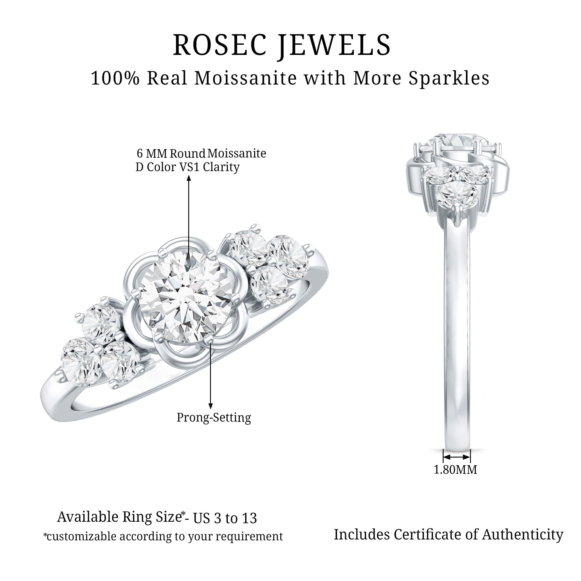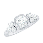 Celebrate love in full bloom with this enchanting Flower Engagement Ring, thoughtfully designed to capture the gentle beauty of heartfelt moments. At the center of this romantic piece glows a brilliant 6 MM round cut moissanite, cradled in secure prong setting. Inspired by floral elegance, the design features a flower frame surrounding the main gem that adds charm and delicacy to the rings look. On each side of the center stone, dainty trios of moissanite stones shimmer like drops of light, symbolizing the past, present, and future of your promise. Their sparkle adds a graceful balance to the design, while the soft curves of the band bring a sense of flow and harmony. Every stone in this Moissanite Engagement Ring is offering the brilliance and fire of fine jewelry with a more thoughtful, sustainable choice. The D-VS1 quality moissanites ensure crystal clarity and radiant shine, making this piece a standout in both sentiment and style. Whether you are sealing a promise, expressing love, or gifting a meaningful piece, this Moissanite Flower Ring tells a story of connection and care. Crafted with attention to detail and a modern heart, this 1 CT Moissanite Ring arrives in an elegant jewelry box, making it perfect for keeping or gifting. With floral charm and a timeless design, it is a ring meant not just to wear, but to remember, forever.