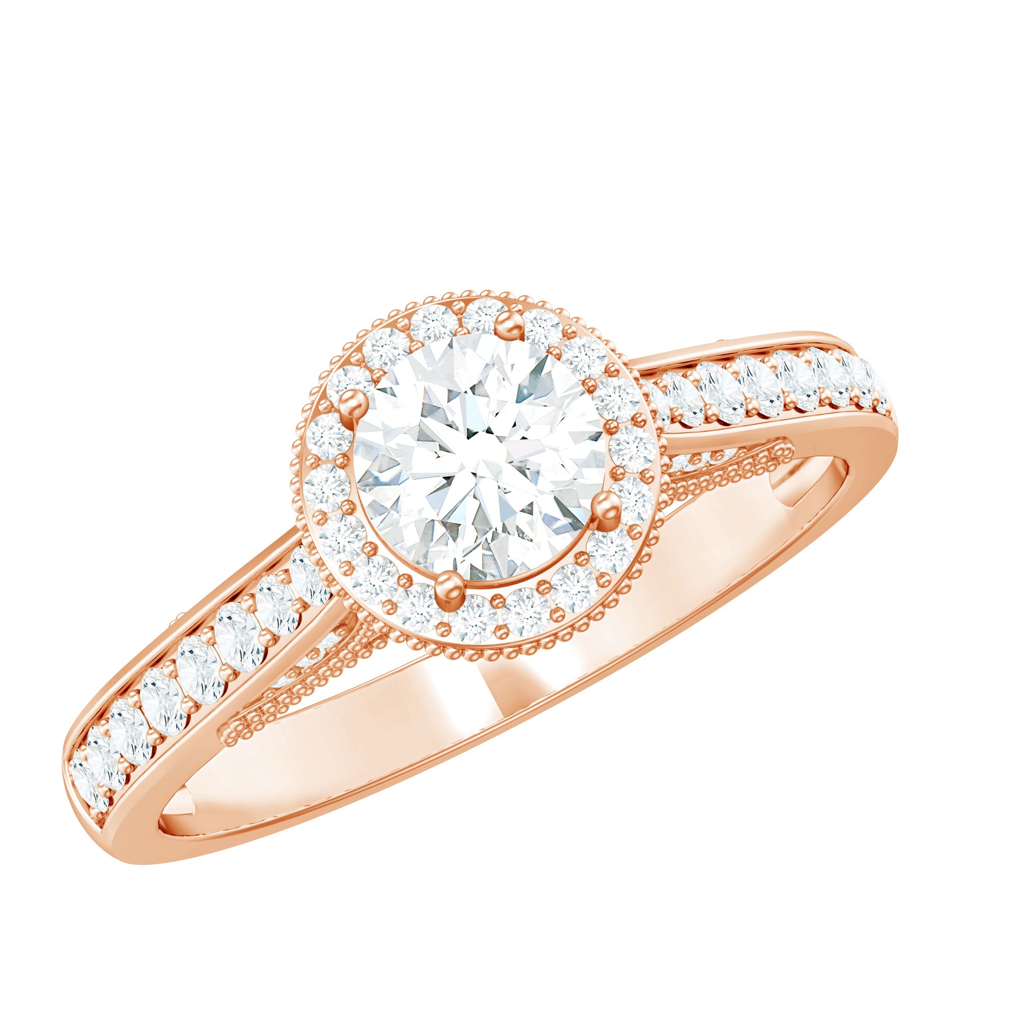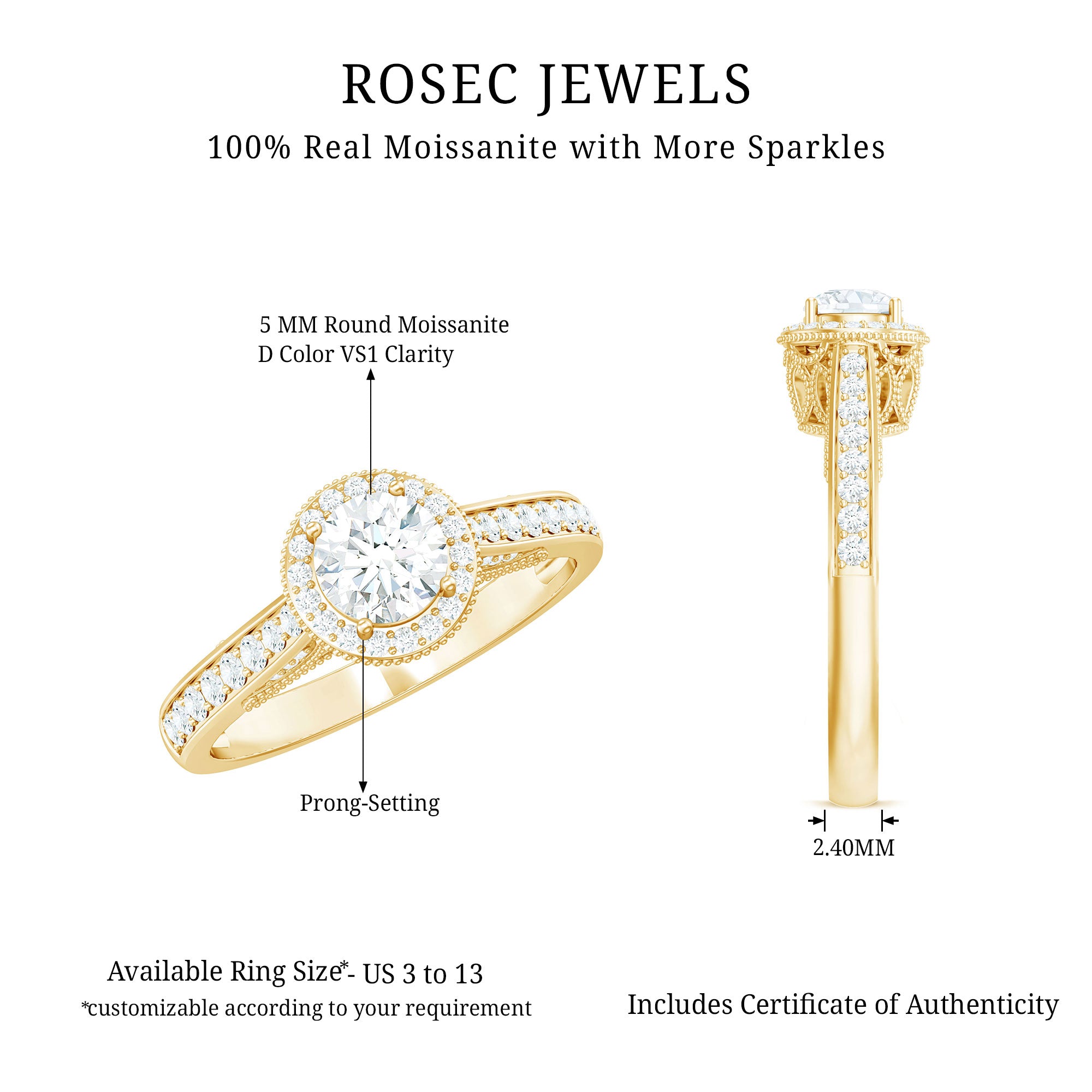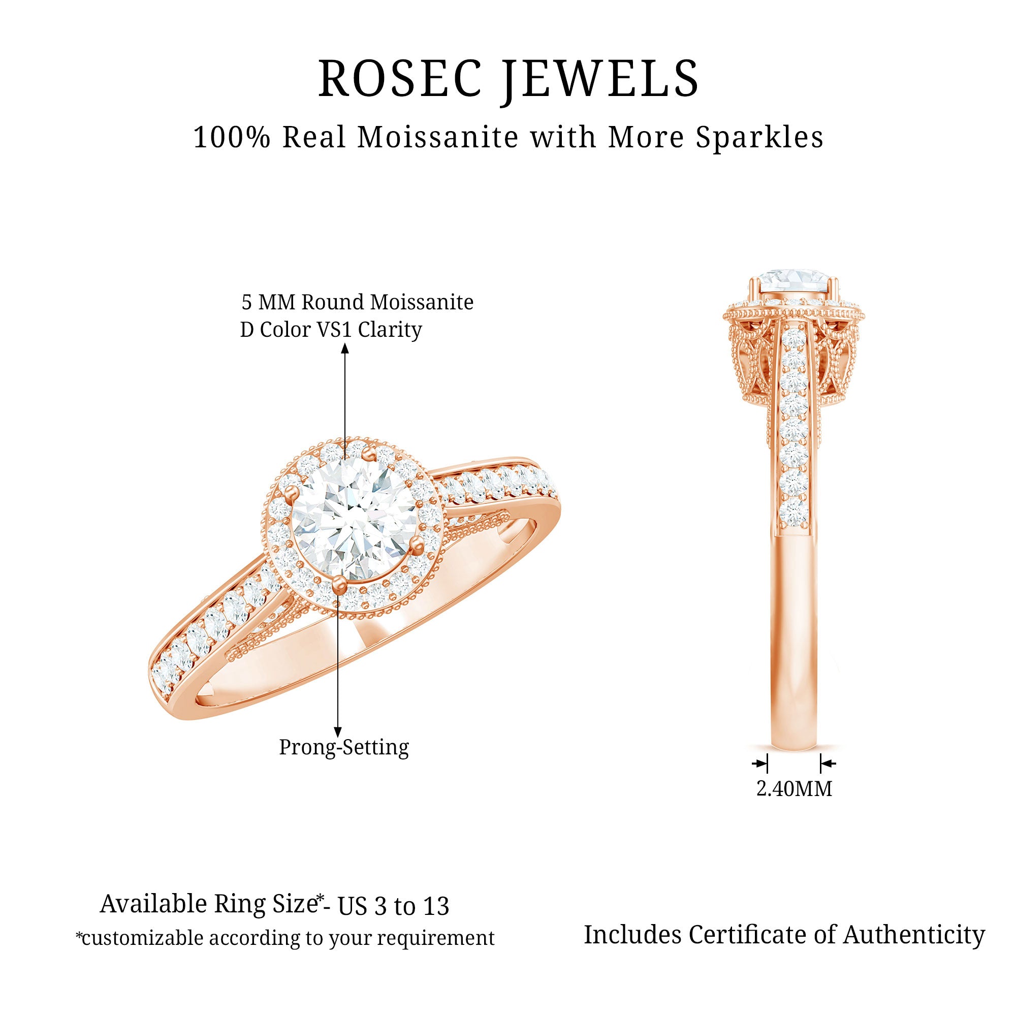 Looking for a perfect engagement ring for your special one, we got your back with this Moissanite Engagement Ring. This ring is embellished with a 5 MM moissanite at the heart secured in Prong Setting. The center stone is encircled with a dainty moissanite accent with the milgrain detail that gives a decorative appeal to the Ring. This Vintage Engagement Ring will make your lady fall in love again with the captivating shine of D-VS1 Quality Moissanite. This 1 Carat Engagement Ring beholds the timeless charm that is perfect for your bride-to-be on a special day.