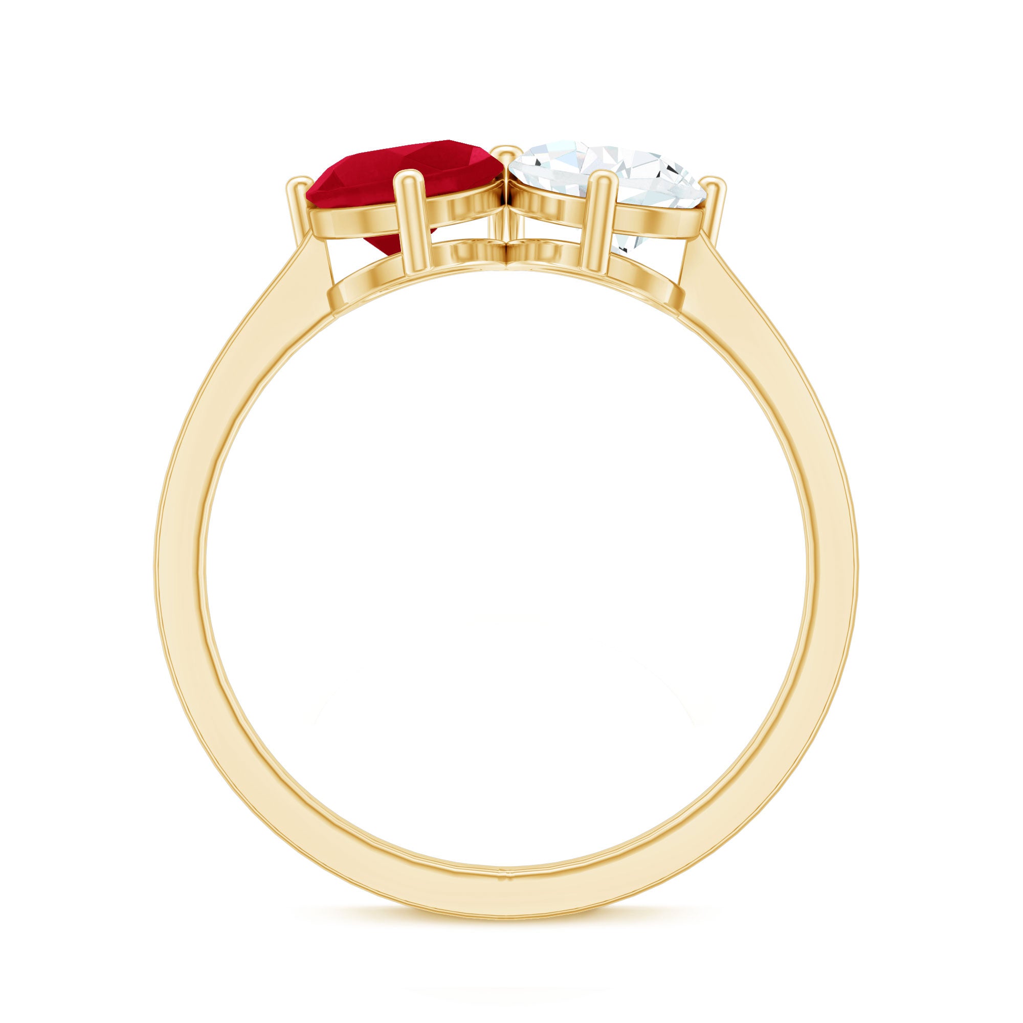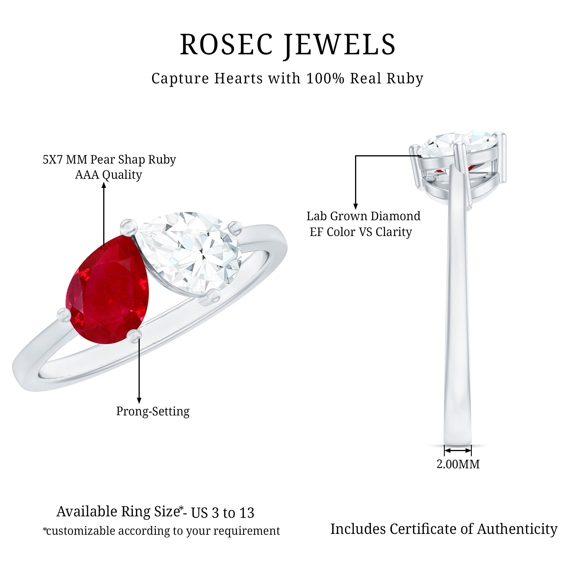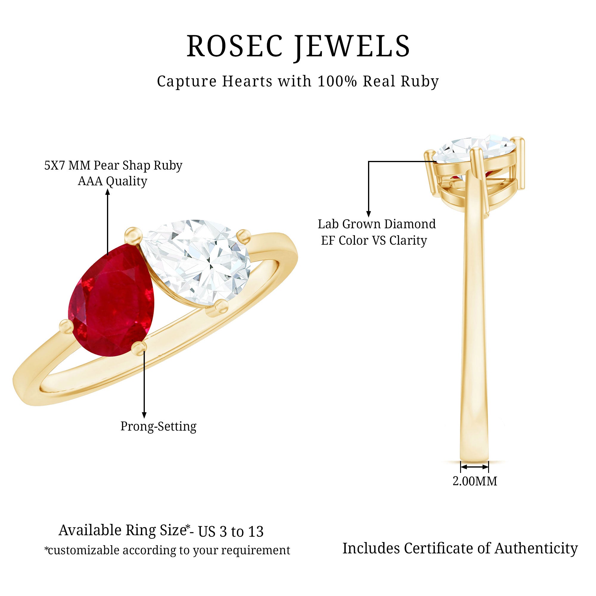 This beautiful Ruby Promise Ring is truly one-of-a-kind and a must-have addition to any jewelry collection. Its delicate and understated design makes it a charming and subtle statement piece that any woman would adore. Show your love and affection by gifting her this stunning Ruby Two Stone Ring, which she will treasure forever. The ring features a 5X7 MM Pear shaped Ruby in a secure Prong Setting, complemented by a shimmering Pear Shaped Lab Grown Diamond stone. With a beautiful representation of you and me, this Toi Et Moi Ring is an ideal Valentines Day gift for your special someone. Truly embody your love and commitment, this Ruby and Diamond Ring, with symbolism and beauty. Dazzle with the enchanting refinement of this Pear Shape Promise Ring has luxury that ensures brilliance from every angle. So, fall in love with this 2 Stone Promise Ring and add a romantic touch to your look.
