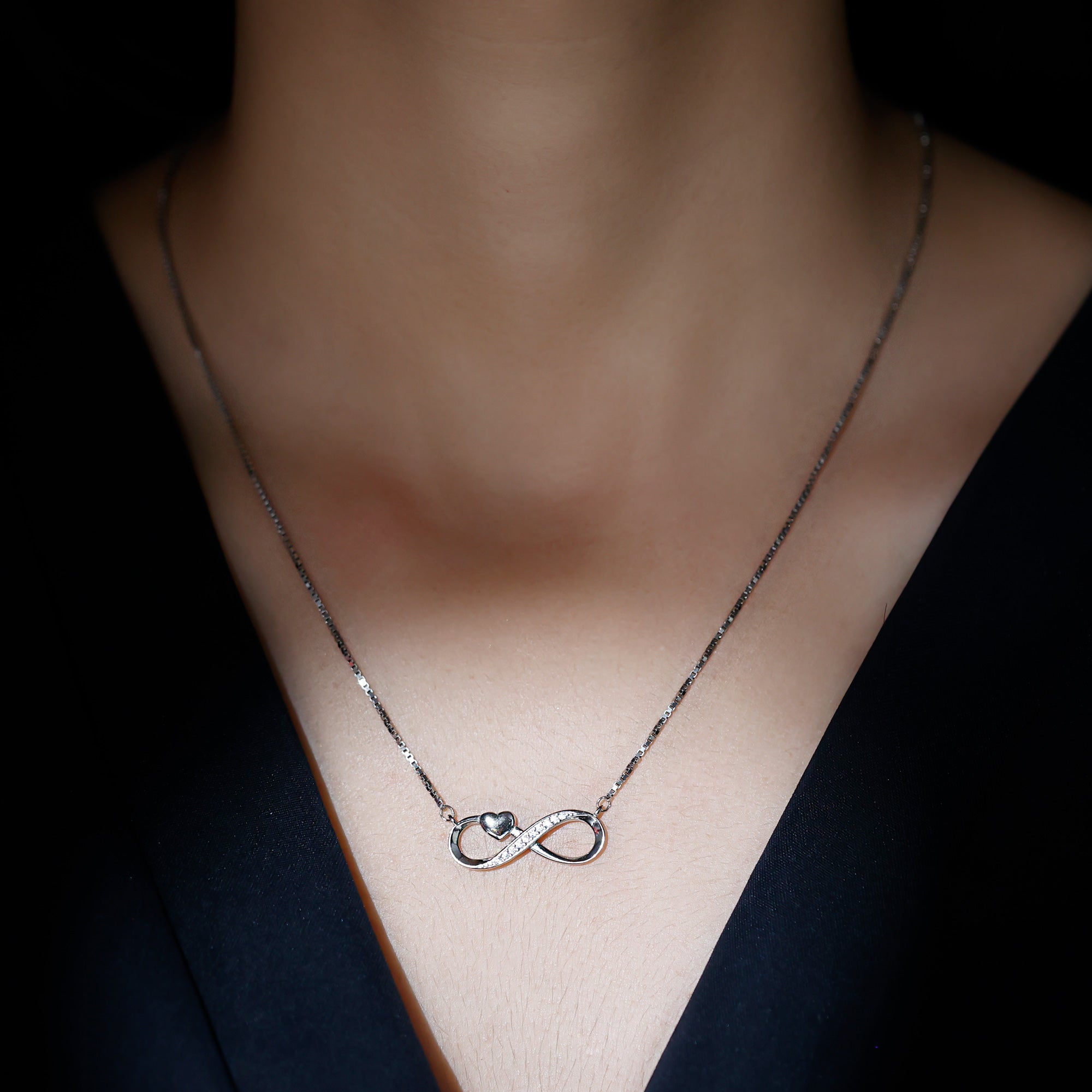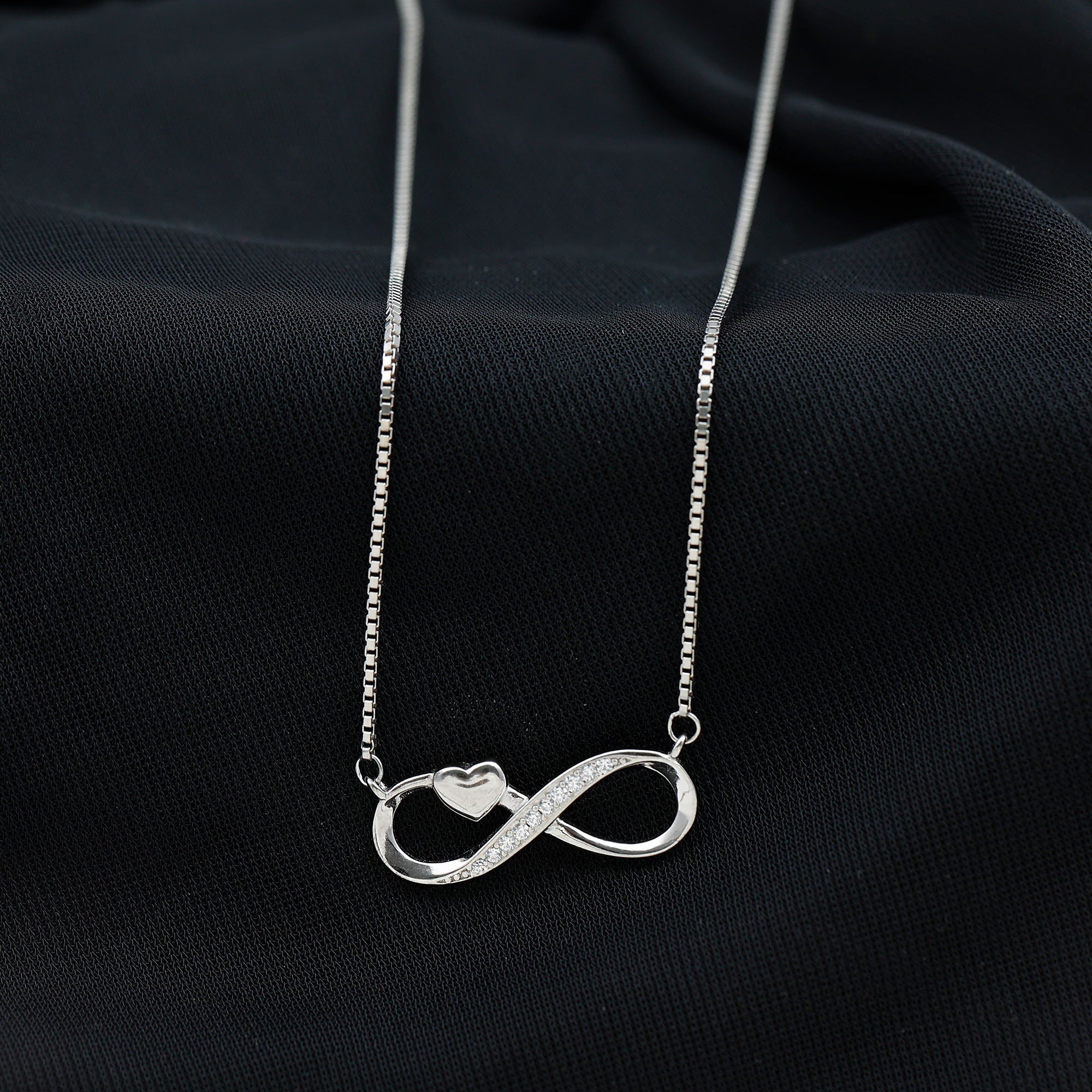 Symbolizing endless love and heartfelt connection, this Infinity Necklace is the perfect piece to express what words can not. The elegant Infinity loop is adorned with sparkling Zircon stones, each one adding a brilliant touch that catches the eye. Resting gracefully over the loop is a sweet Heart motif, creating a beautiful blend of meaning and style in one timeless design. The silver chain offers a comfortable fit, making it ideal for everyday wear or for adding a romantic touch to special occasions. Whether you are planning a Valentine’s Day surprise, celebrating an anniversary or simply treating someone you adore, this Infinity Heart Necklace delivers a message of devotion in the most graceful way. Delivered in an elegant jewelry box, this Cubic Zirconia Necklace arrives ready to gift. With its sentimental design and radiant sparkle, this CZ Diamond Necklace is a reminder of love that lasts and connections that remain unbreakable